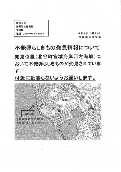 北谷町宮城海岸西方海域に、不発弾らしきものが発見されました。近づかないようにしてください。