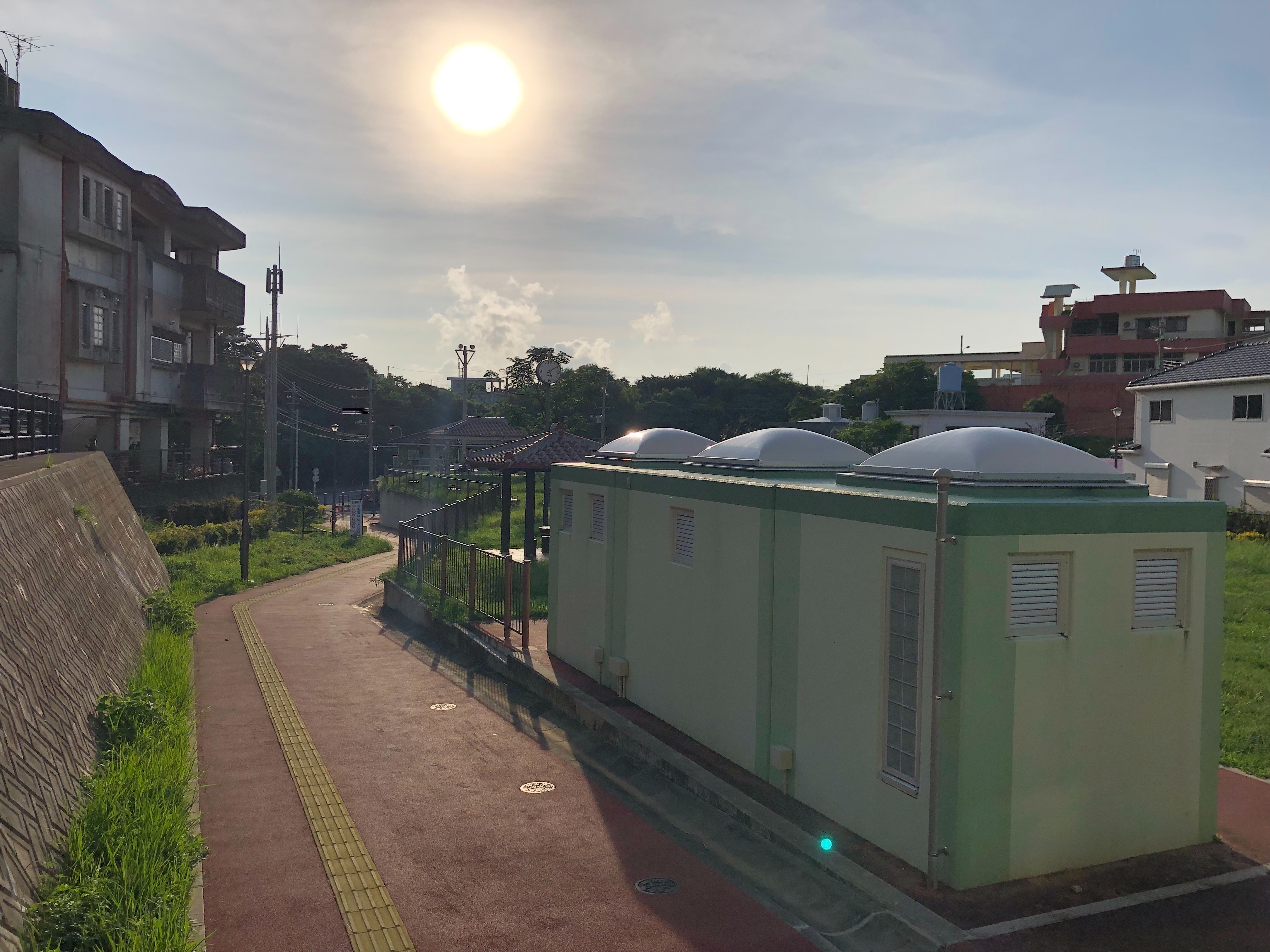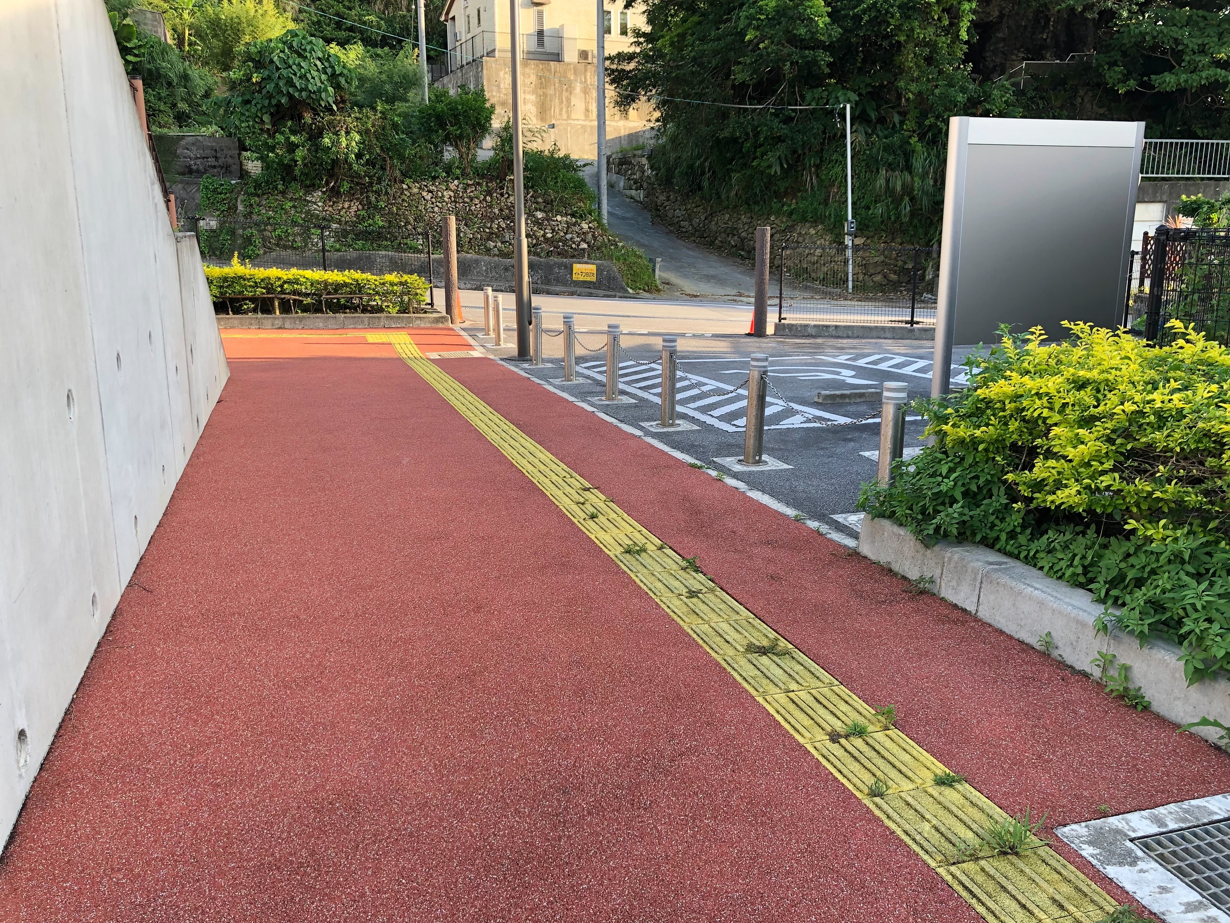公園が坂道の途中に位置している為、バス停が傾いているように見えます。