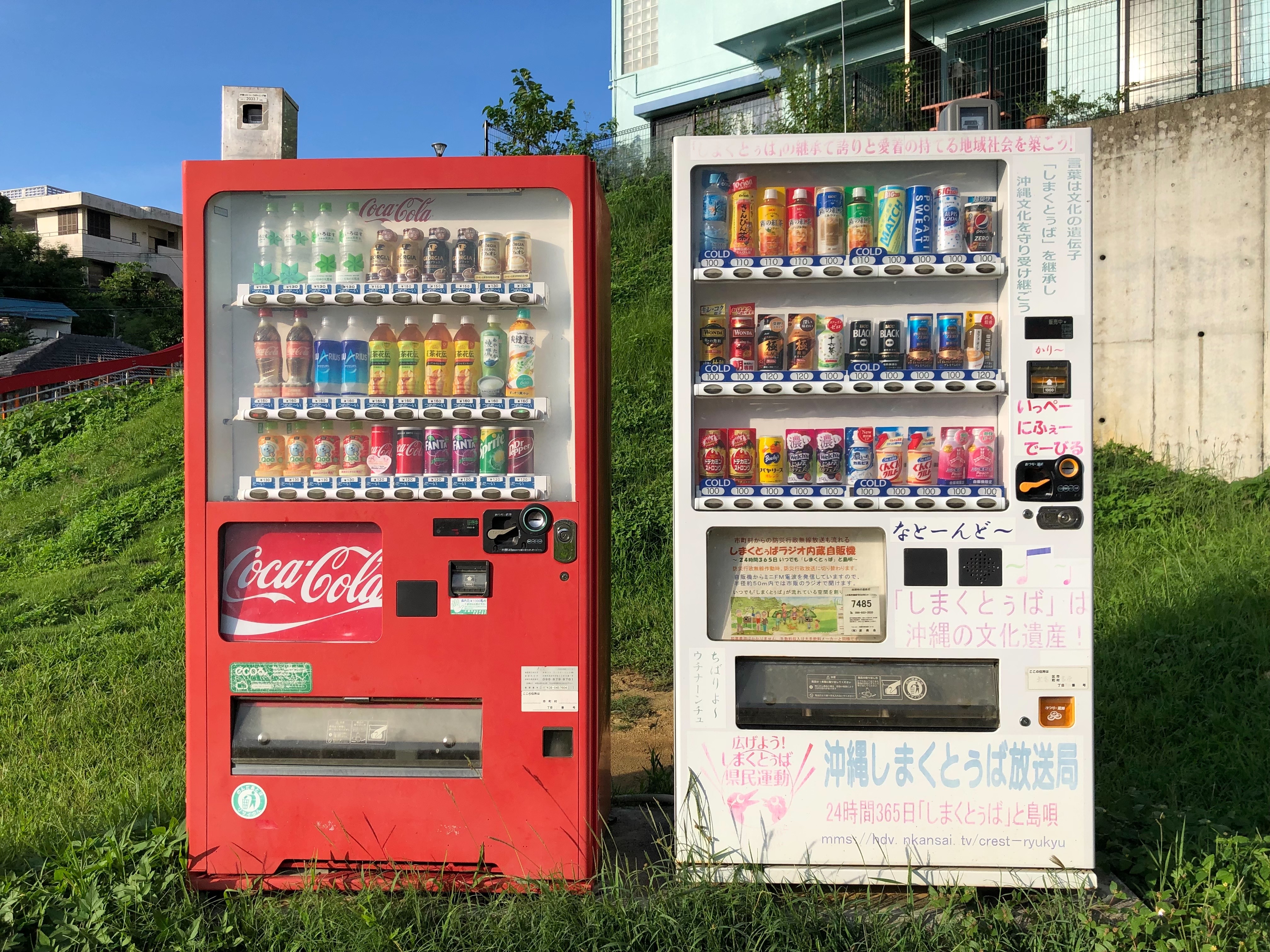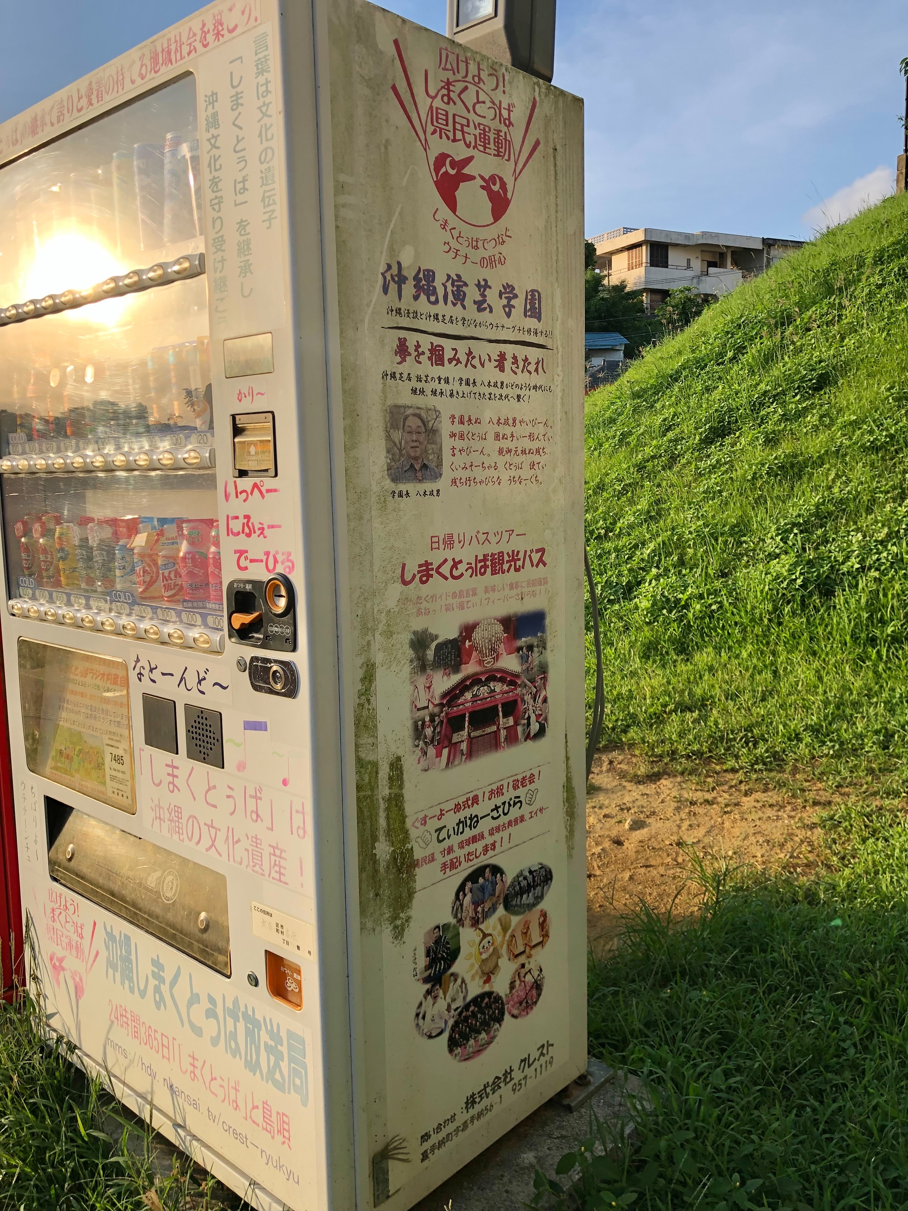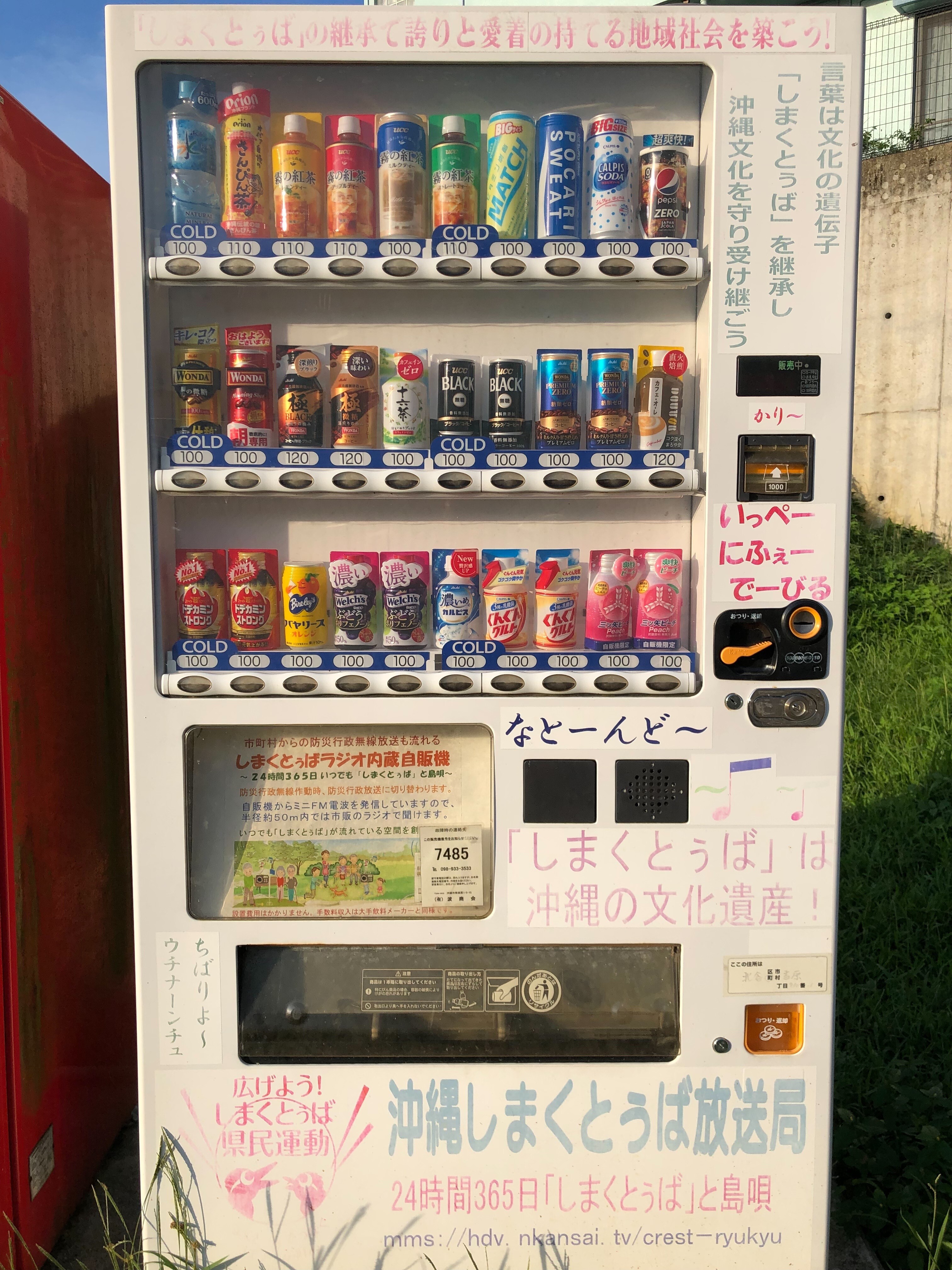 右の販売機は、スピーカーが付いていて、沖縄の方言しまくとぅばが流れていました。