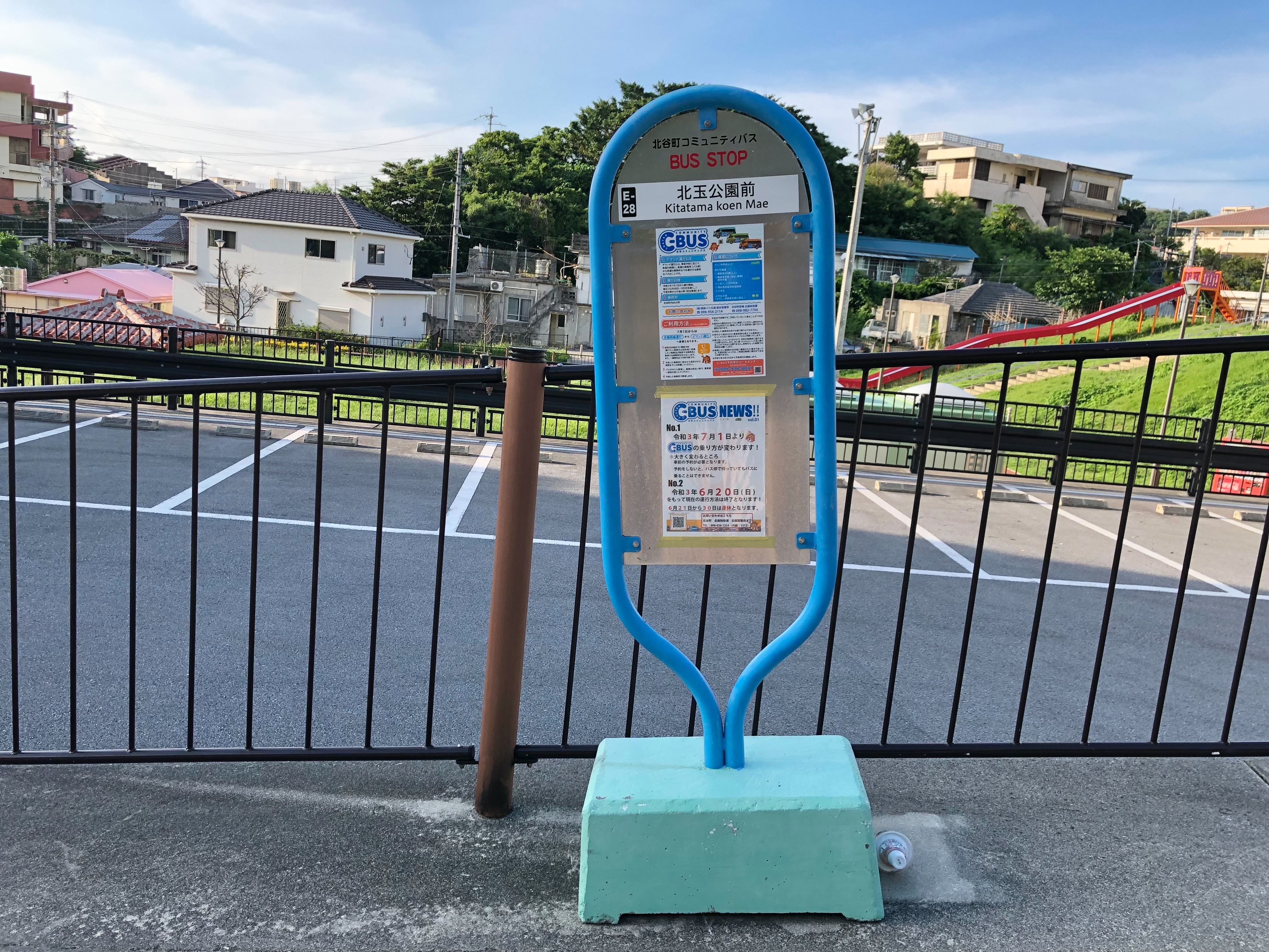 駐車場出入り口前には、北谷町のコミュニティバス「C-BUS」のバス停があります。