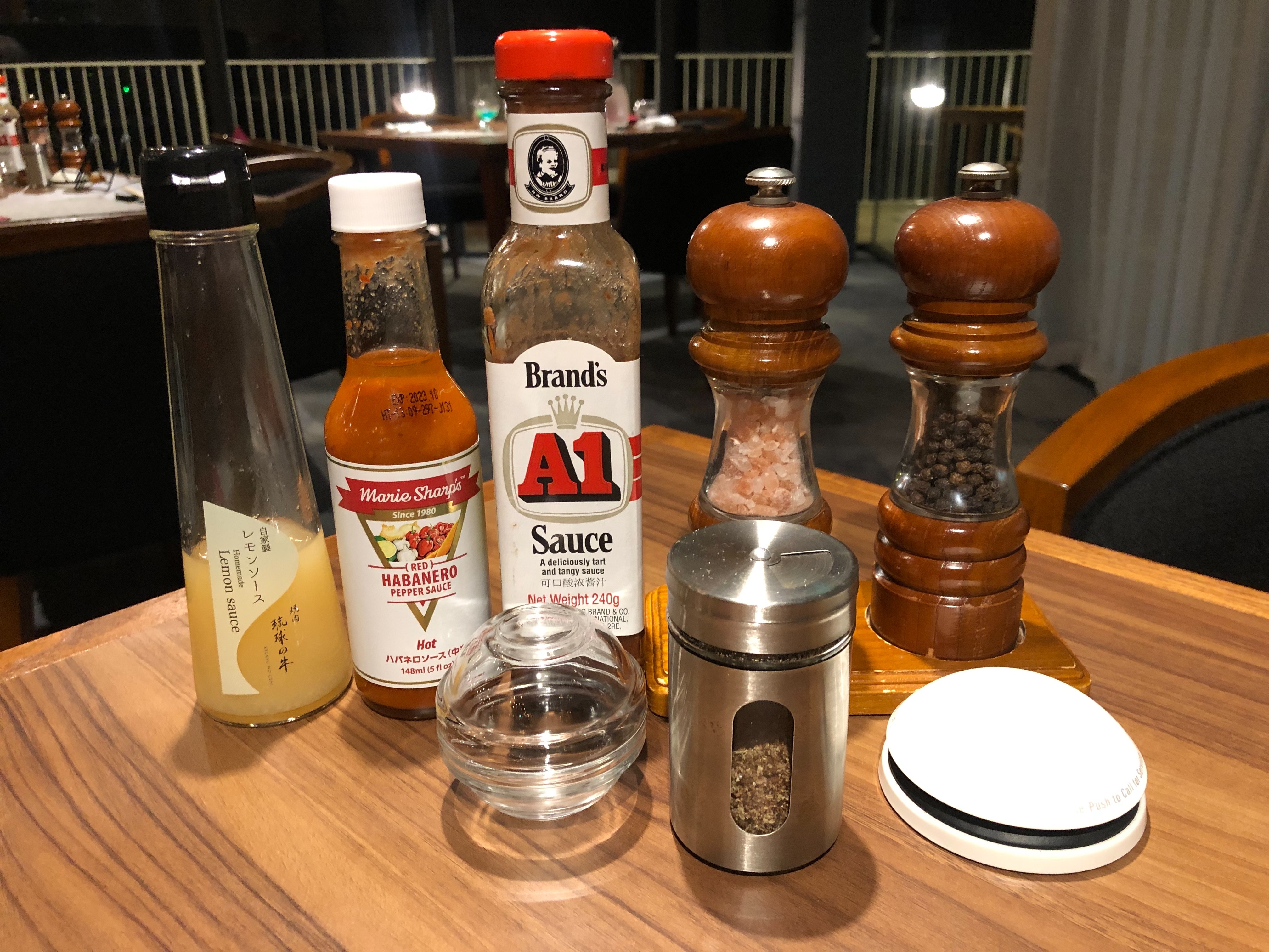 テーブル上には、A1ソースや胡椒などの調味料が置かれています。