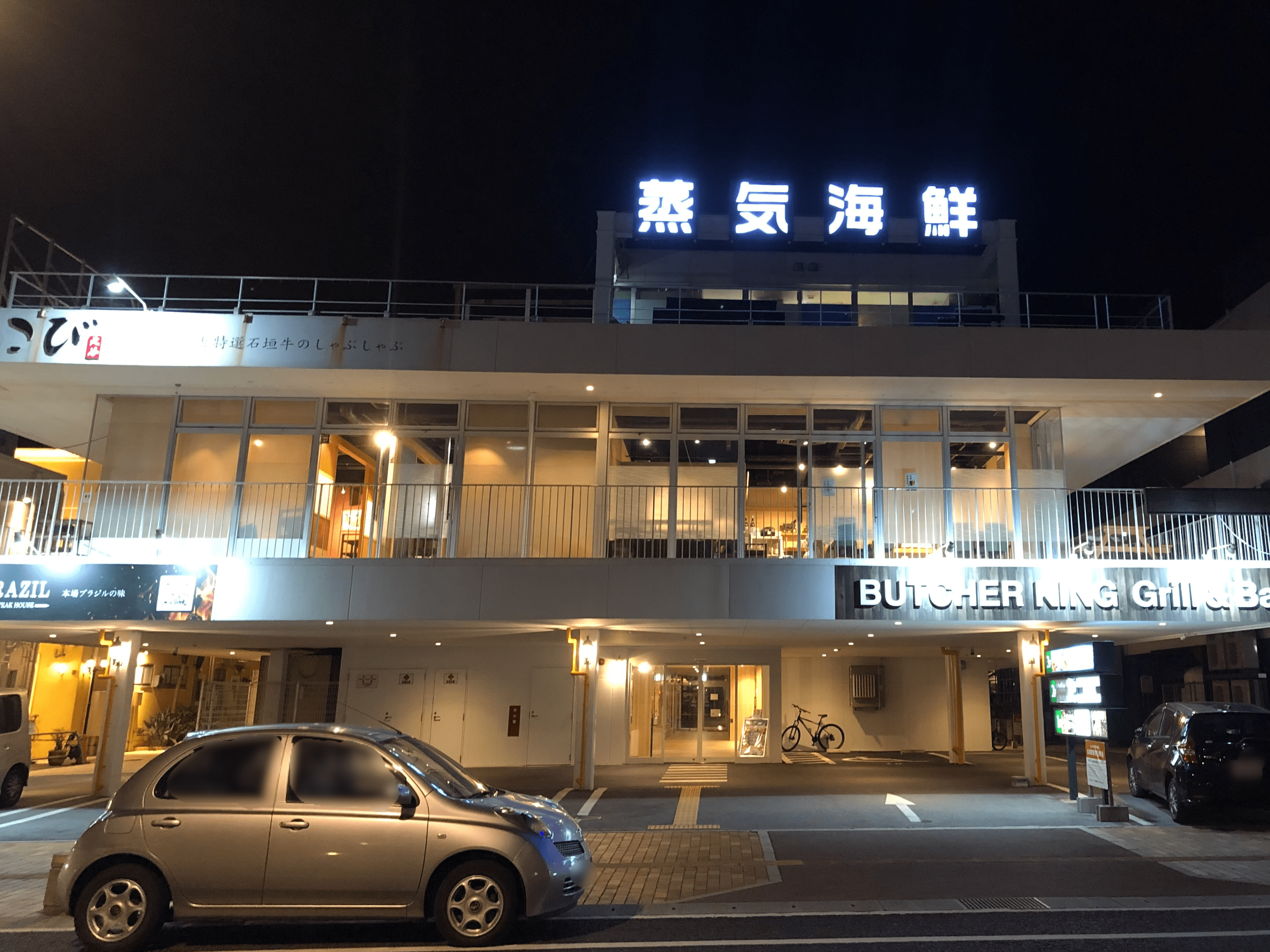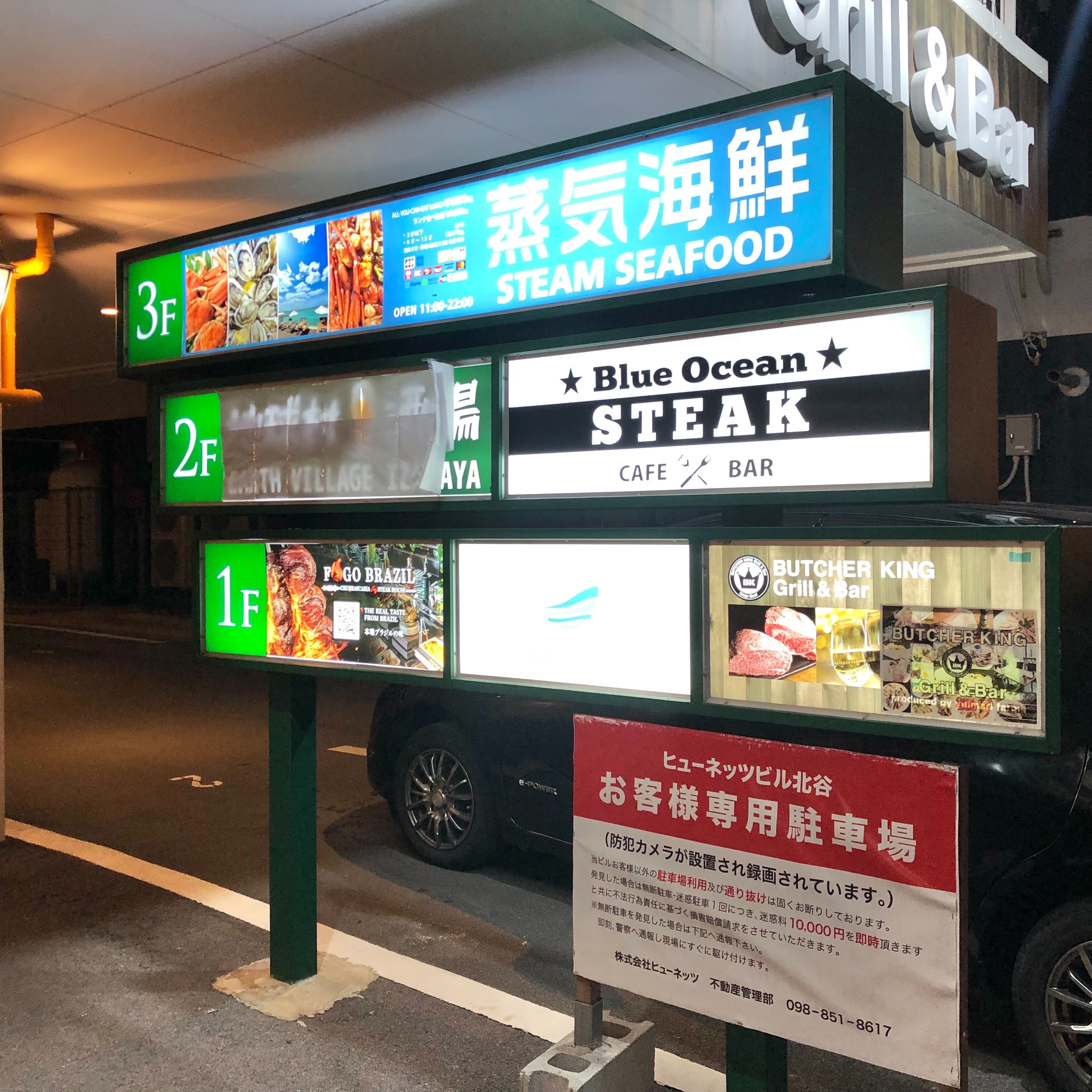建物の1階に駐車場があり、2階がBLUE OCEAN STEAK(ブルーオーシャンステーキ)さんです。