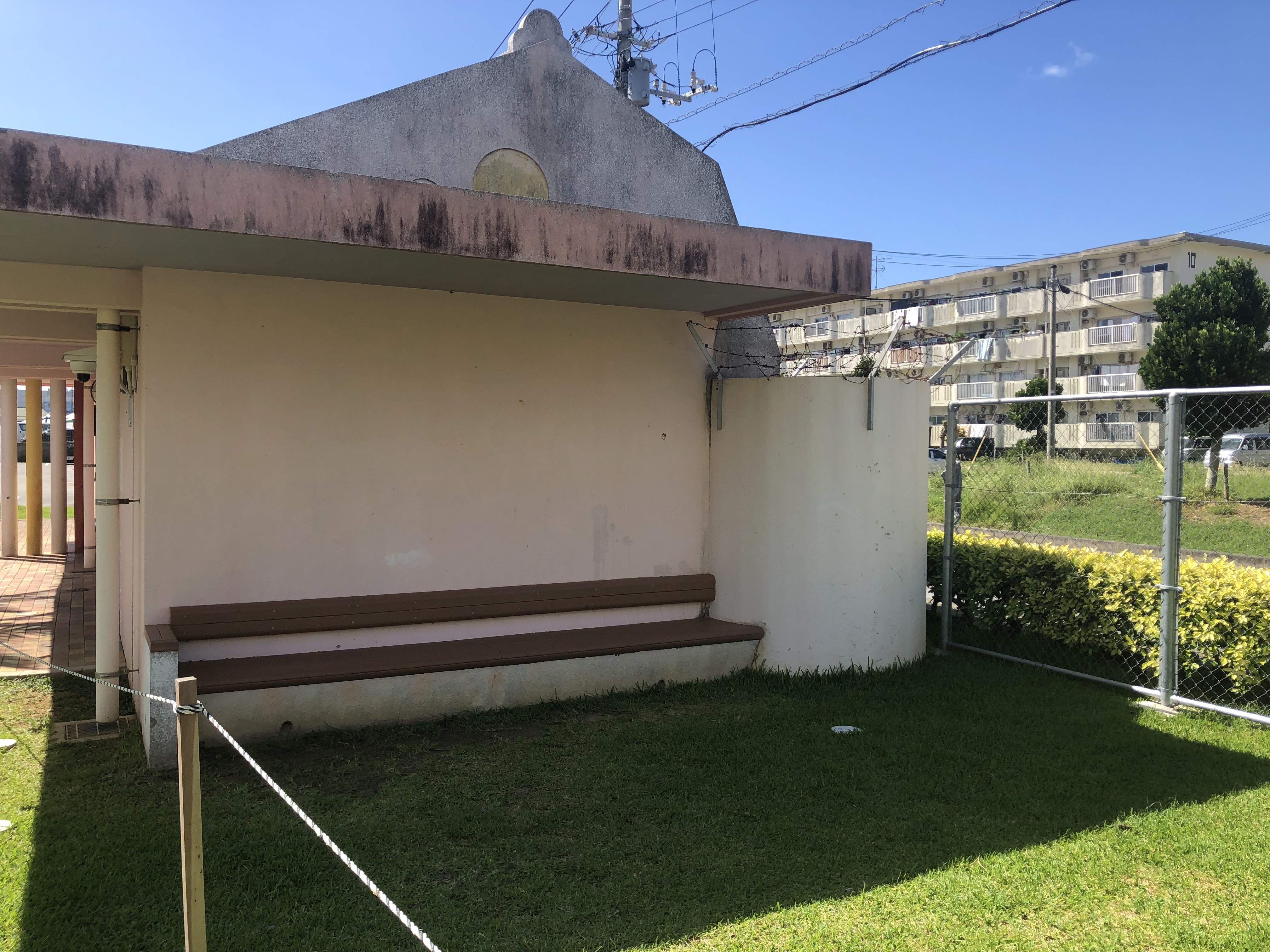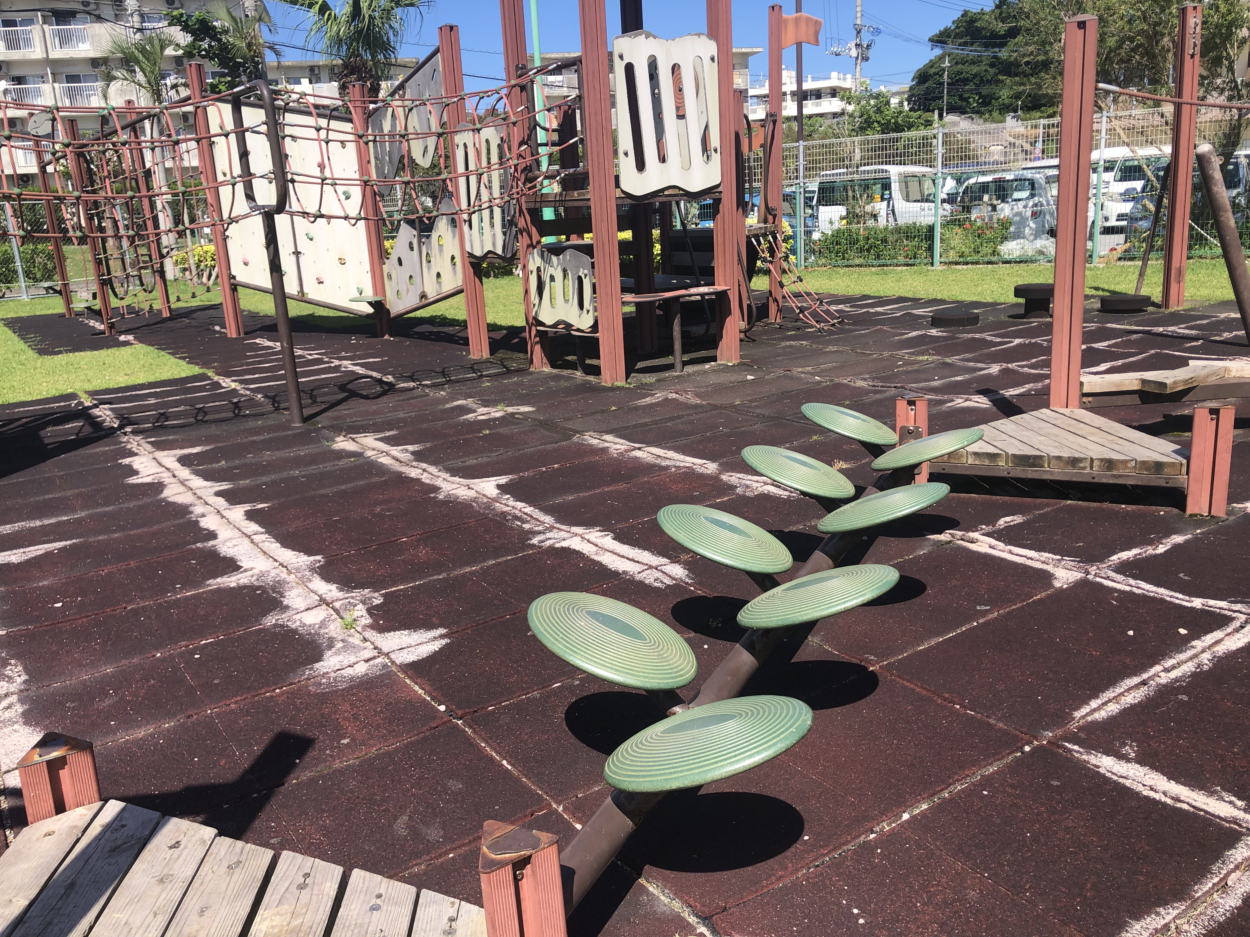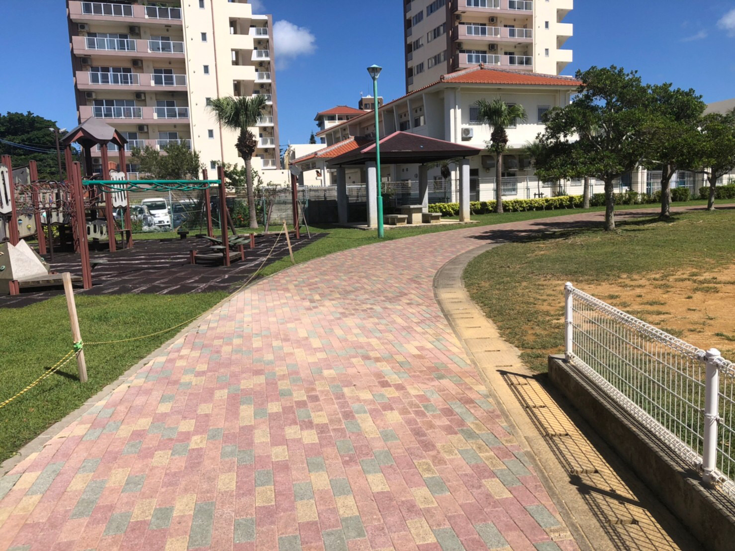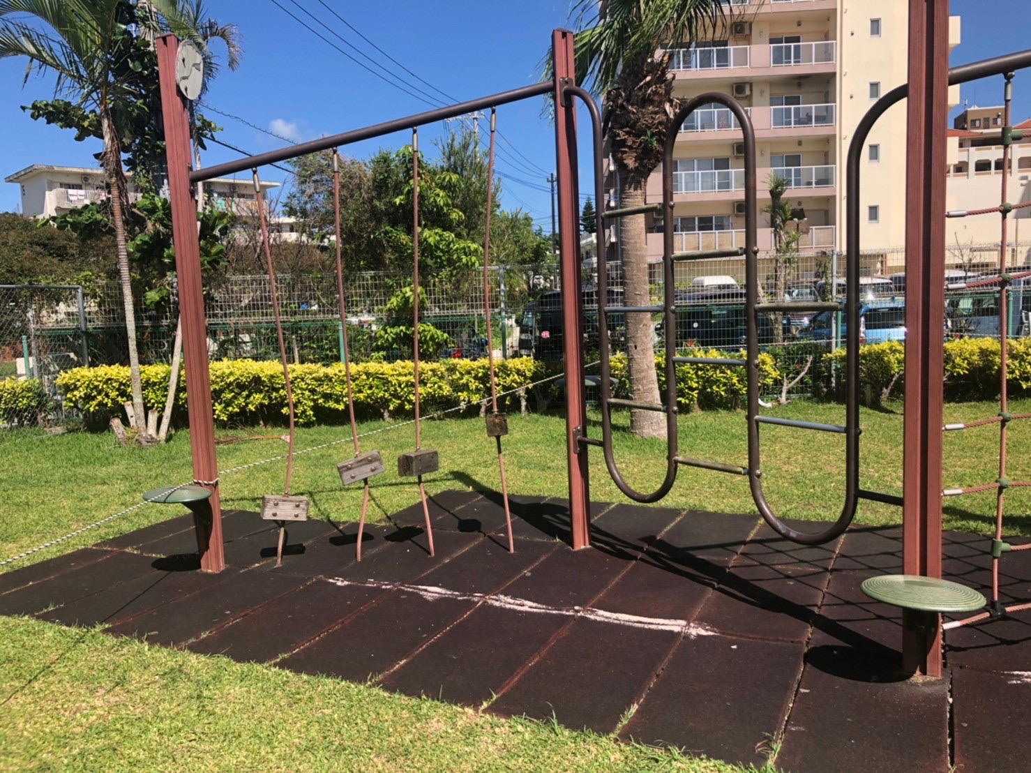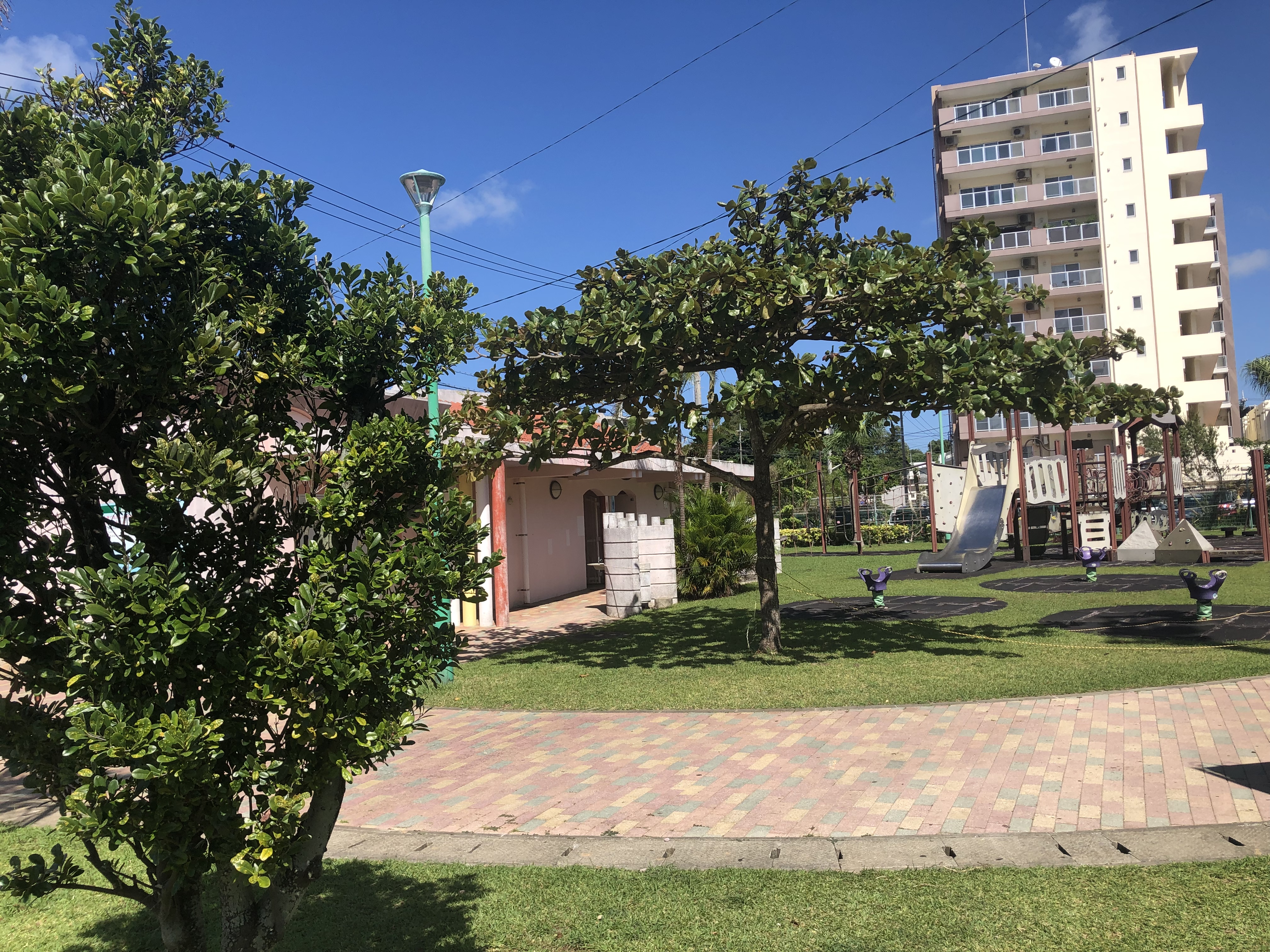 こちらの公園は現在、コロナウイルスの関係で遊具が使えないようにロープで囲まれています。