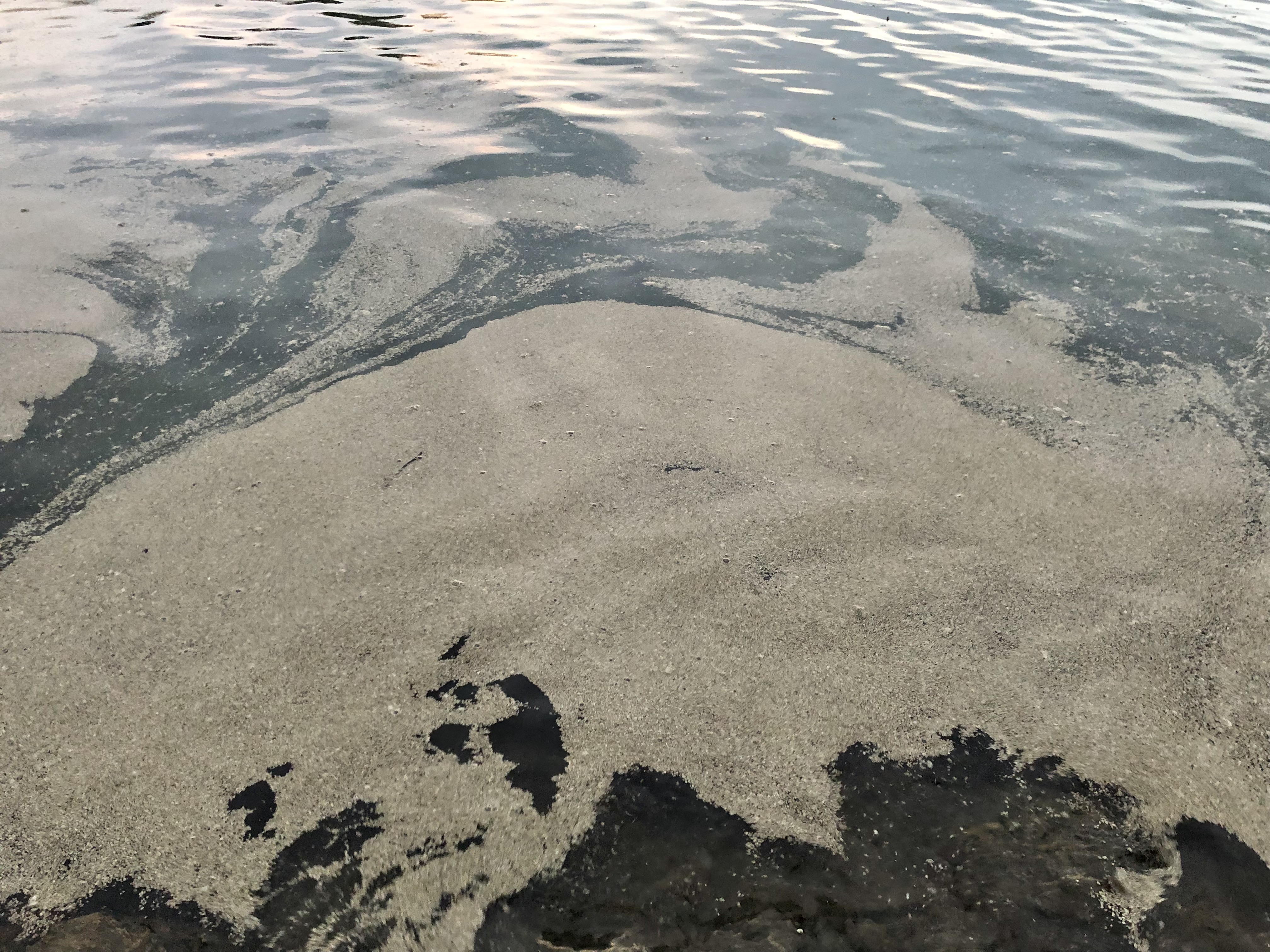 やはり端の方は、波に流されて入り込んだ軽石が水上に浮遊していました。