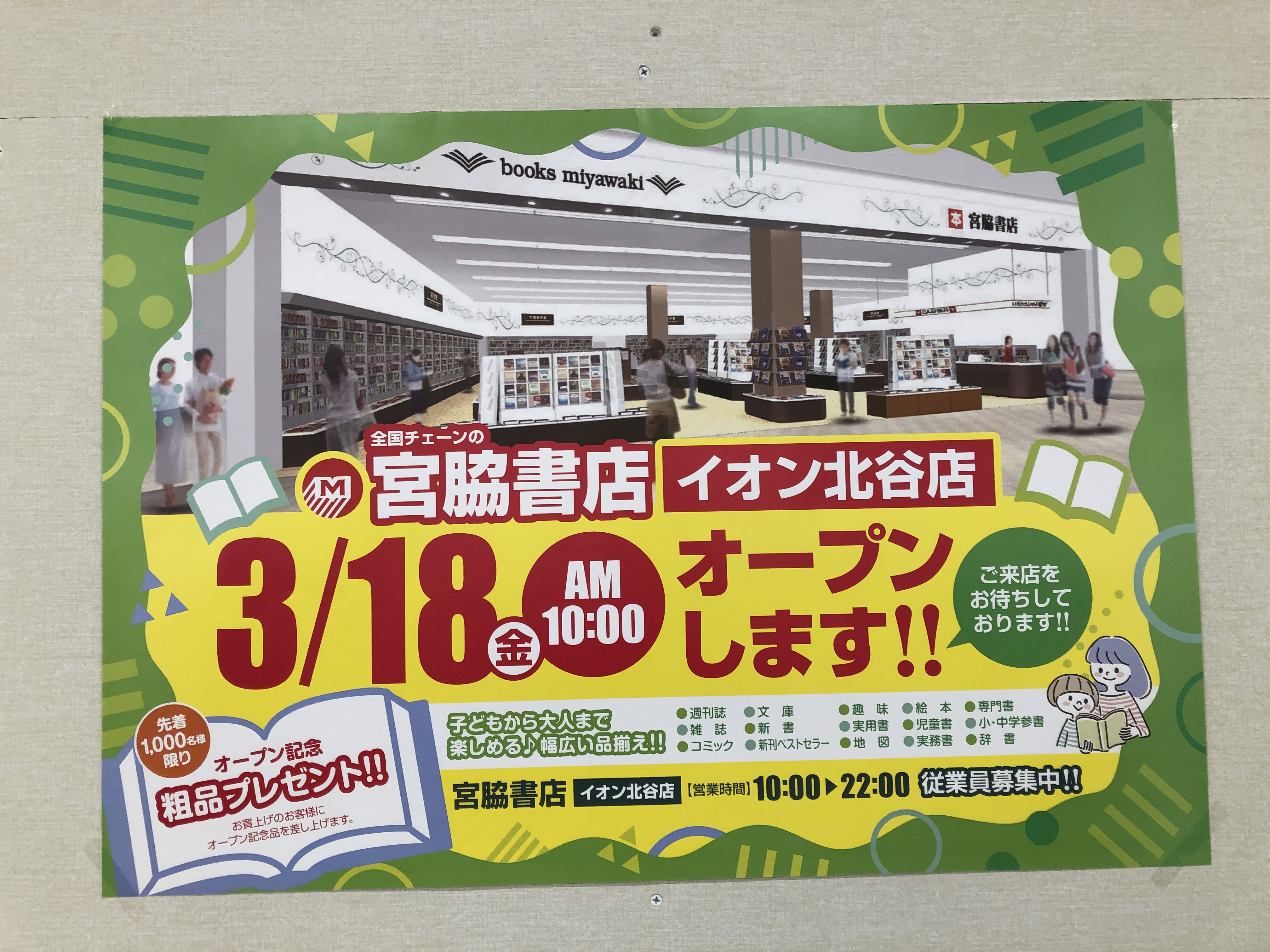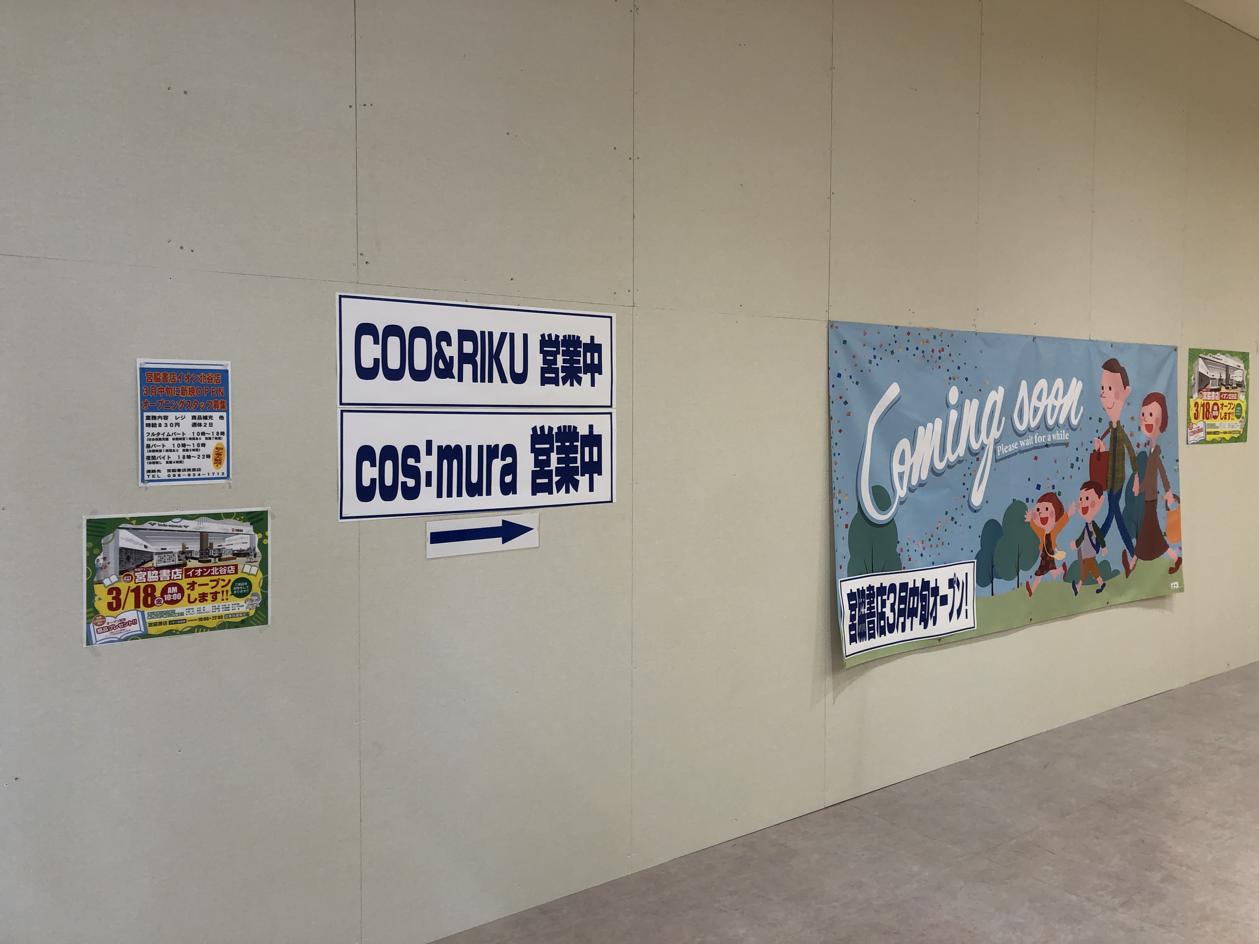 2022年03月06日 【開店予告】イオン北谷店内に『宮脇書店』が3月18日OPEN予定。 イオン北谷店内1階に『宮脇書店』が3月18日OPEN予定です。場所はATMがある入り口から入るとすぐ目の前。300円SHOPの向かいです。 OPEN当日は先着1,000名様に記念品のプレゼントがあるそう。北谷町には本屋さんがあまり無いのでイオン店内にOPENするのは嬉しいですね。 【現店舗情報】店 名:宮脇書店 イオン北谷店住 所:沖縄県中頭郡北谷町美浜8−3備 考:3月18日OPEN ライター Ally < 前の記事次の記事 > コメント コメントフォーム 名前 コメント 記事の評価 リセット リセット 顔 星 情報を記憶 コメントを投稿する