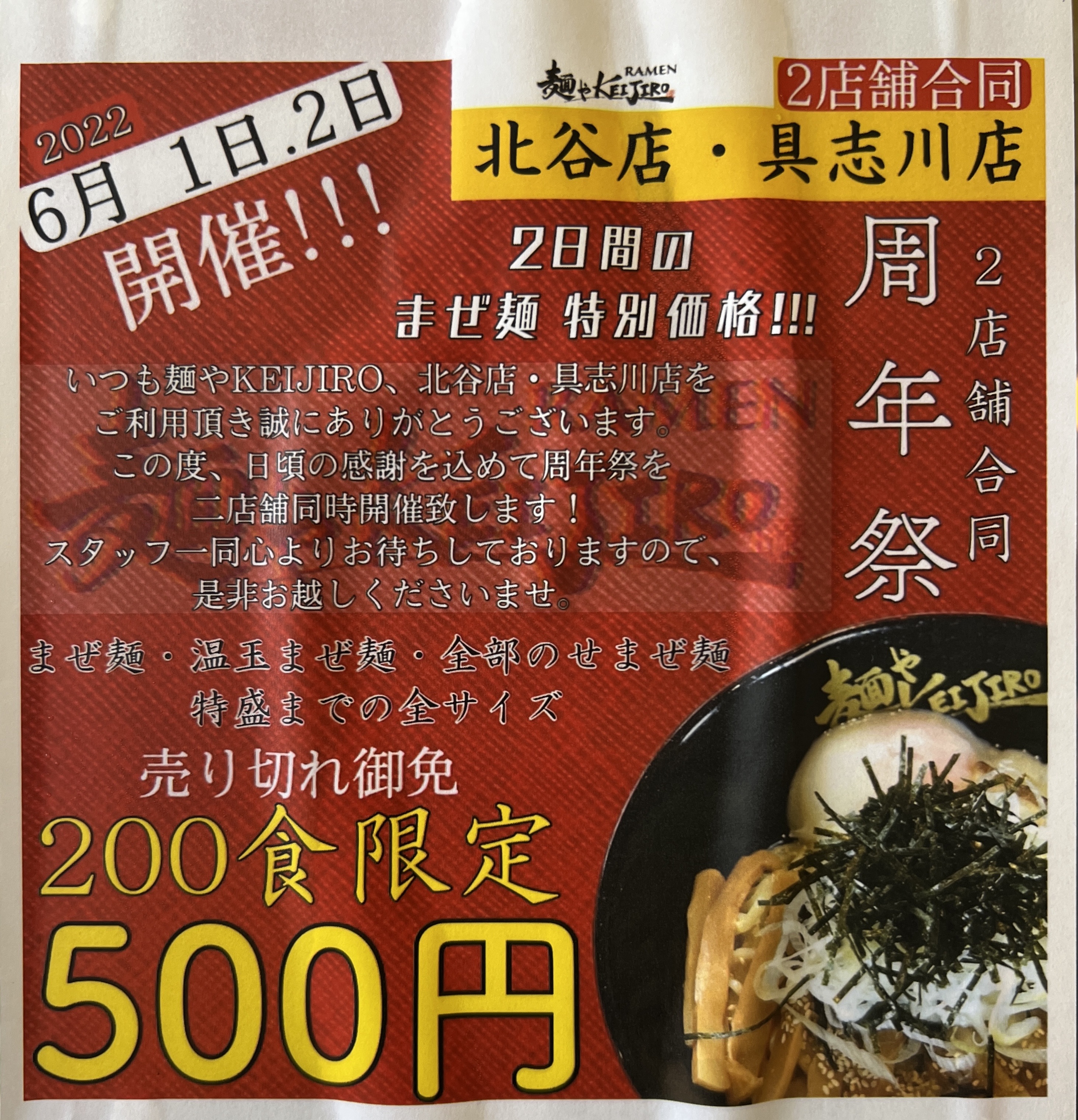 まぜ麺500円イベントは明日6月2日(木)まで開催していますので、興味のある方・まぜ麺好きな方・KEIJIROファンの方ぜひぜひ行ってみてください
