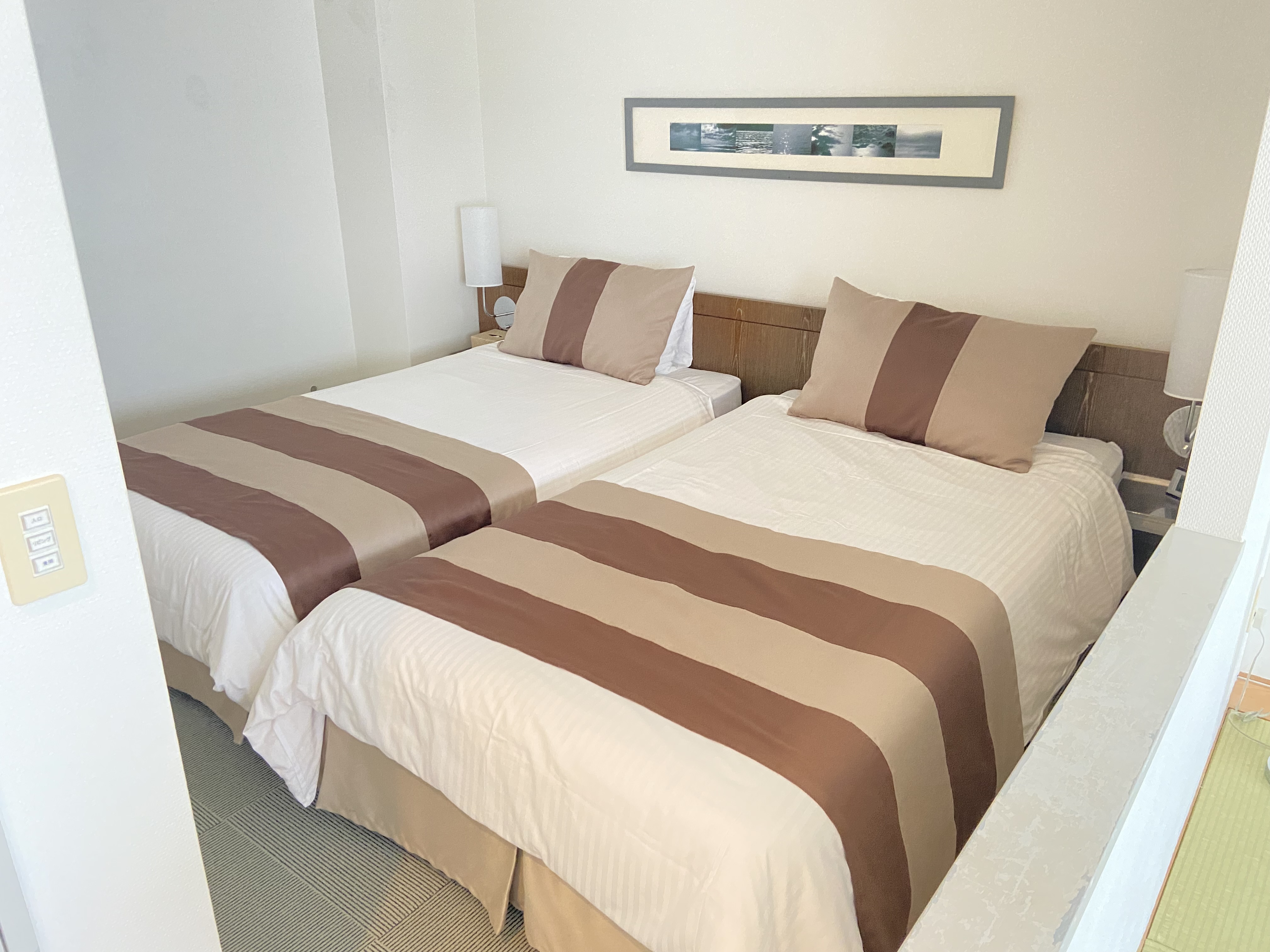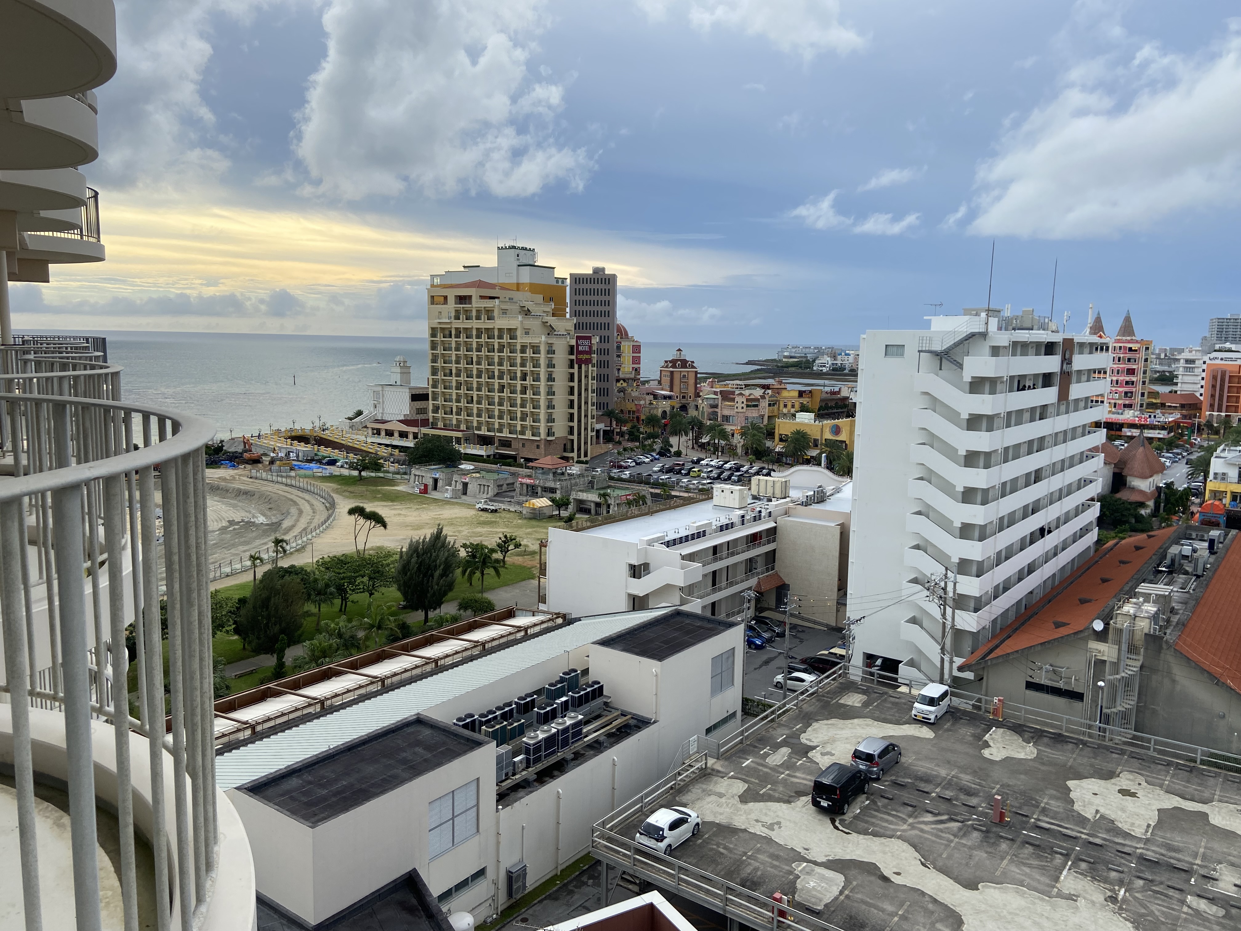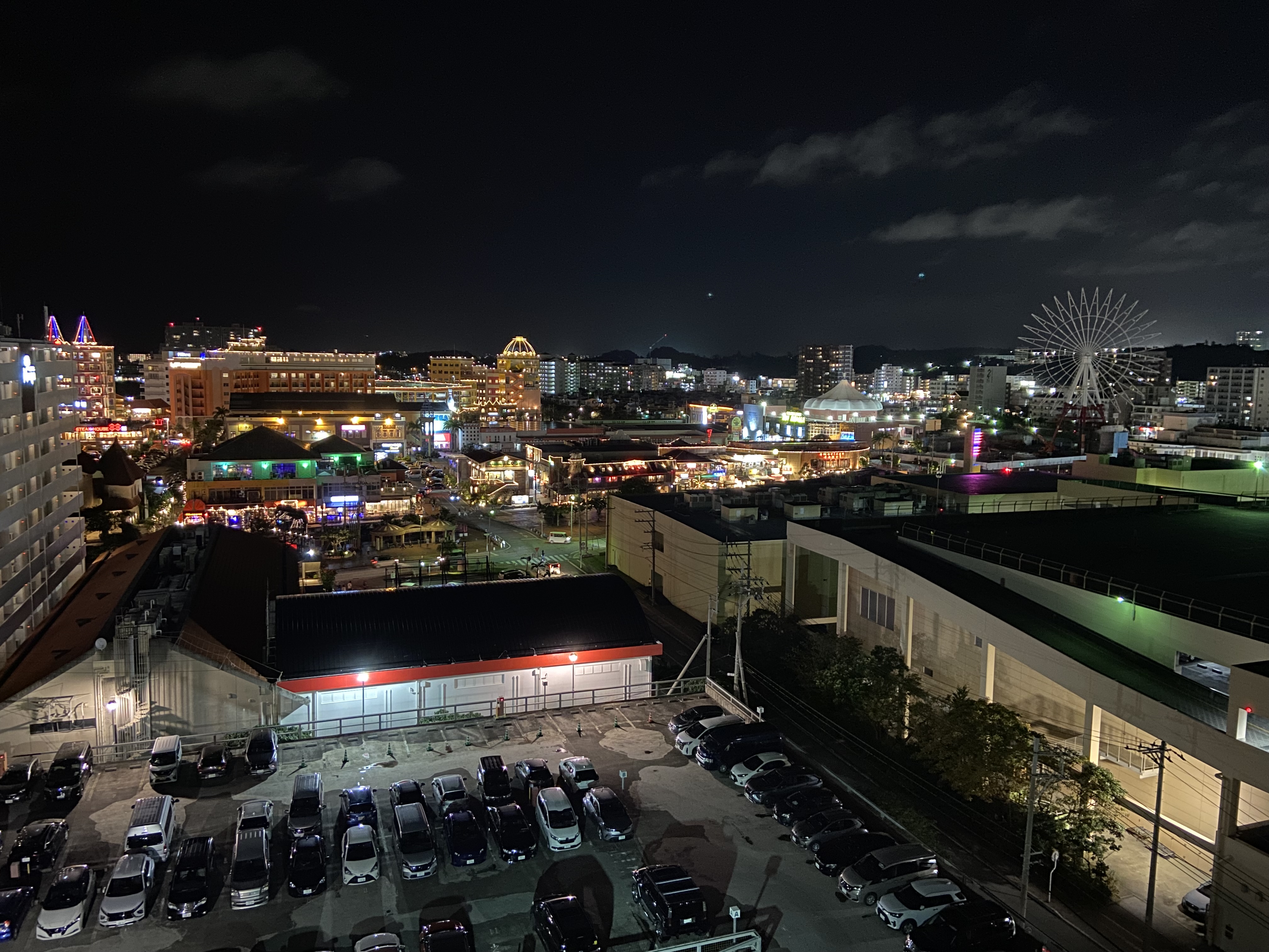 今回の宿泊プランではザ・ビーチタワー沖縄のなかで最も人気のあるお部屋を選びました。10種類ある客室の中でもファミリー向けのお部屋で、客室はツインベッドと琉球畳の6畳の和室もあり広々49m2です。バルコニーからの景観はお部屋によって異なりますが、筆者のお部屋は夜景が綺麗なアメリカンビレッジビューでした。9階からの眺望は十分綺麗で遠くにサンセットビーチの海も見えました。