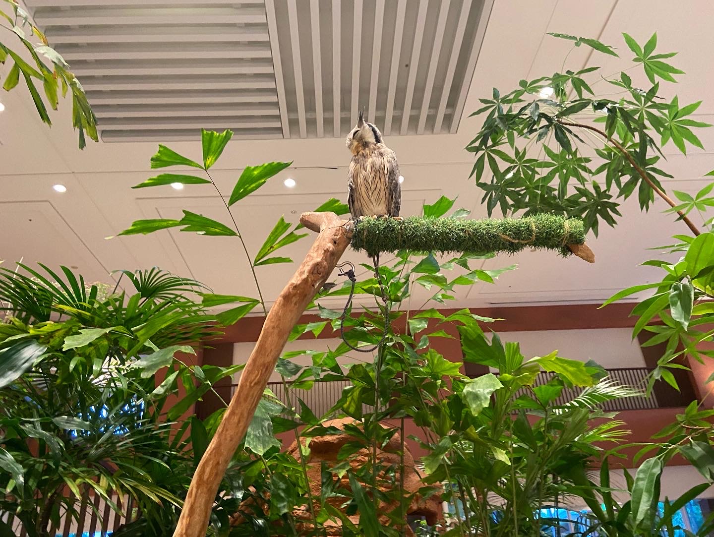 ホテルのフロント近くにはふくろうがいます。じっと動かないため最初はぬいぐるみと思っていましたが