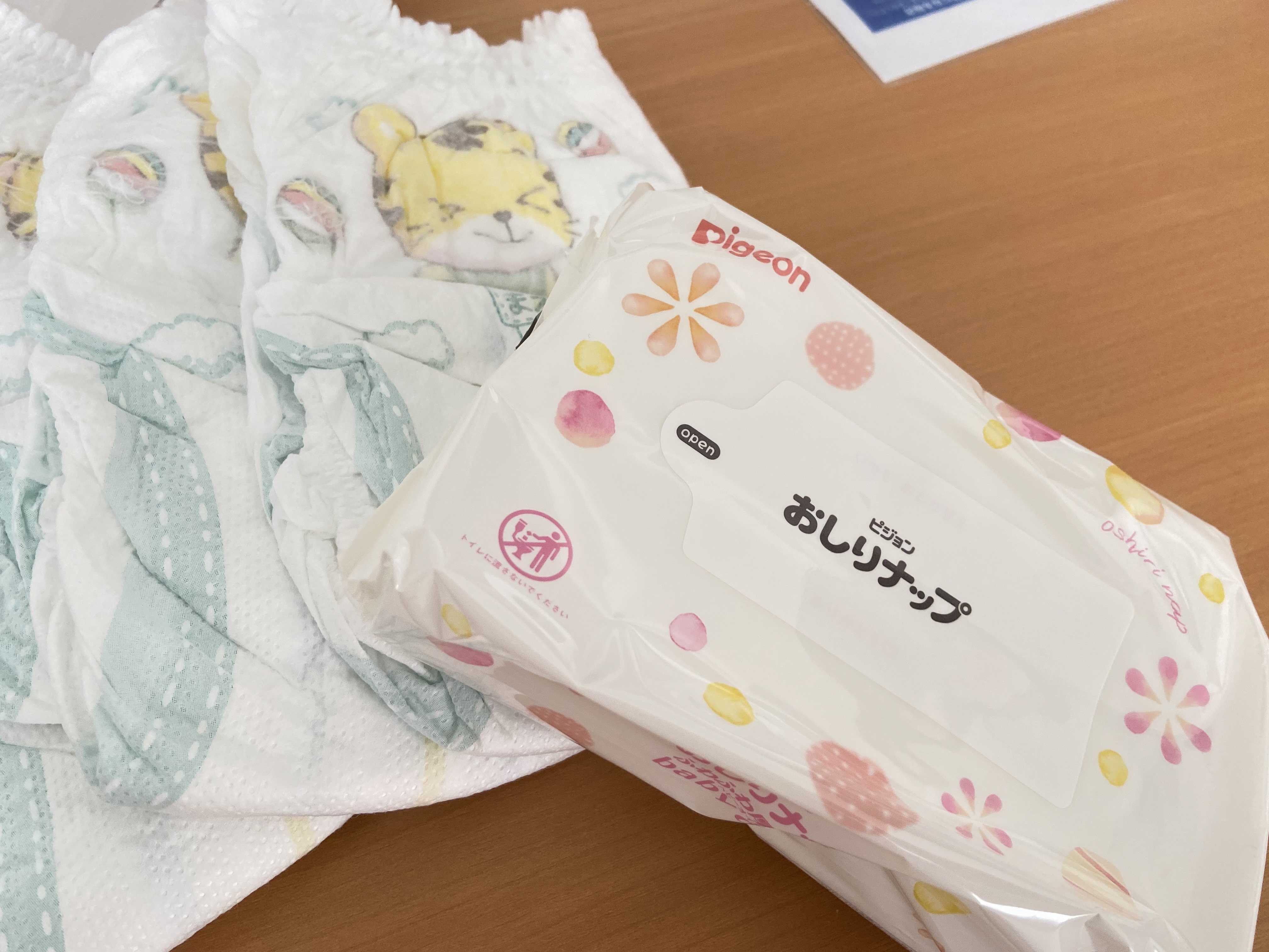 らくらくマミーパックは4歳未満の未就学児を対象にオムツやおしり拭き、粉ミルクやおやつが無料で頂けるサービスです。筆者は今回、オムツ5枚とおしり拭きとおやつを頂きました。