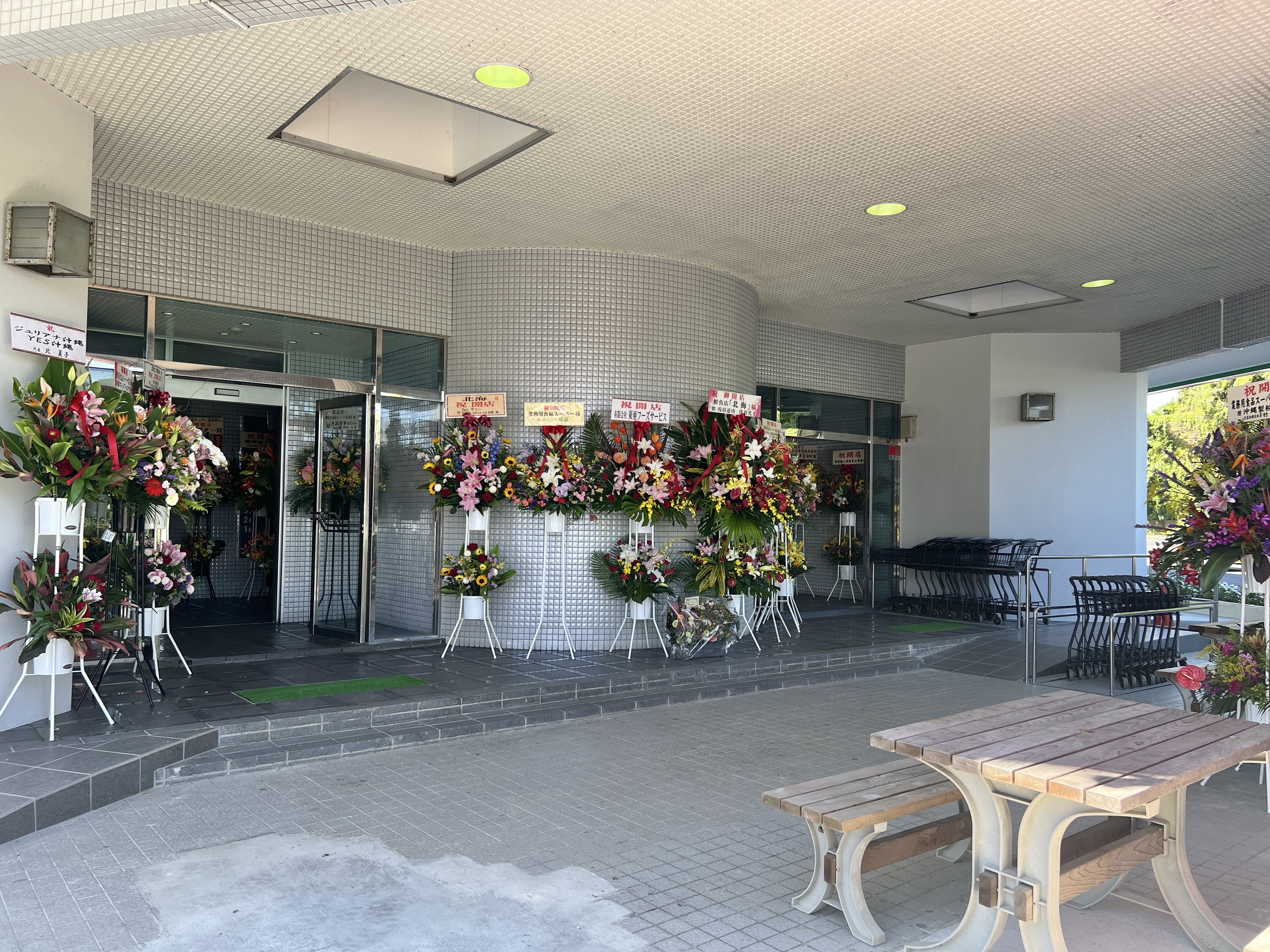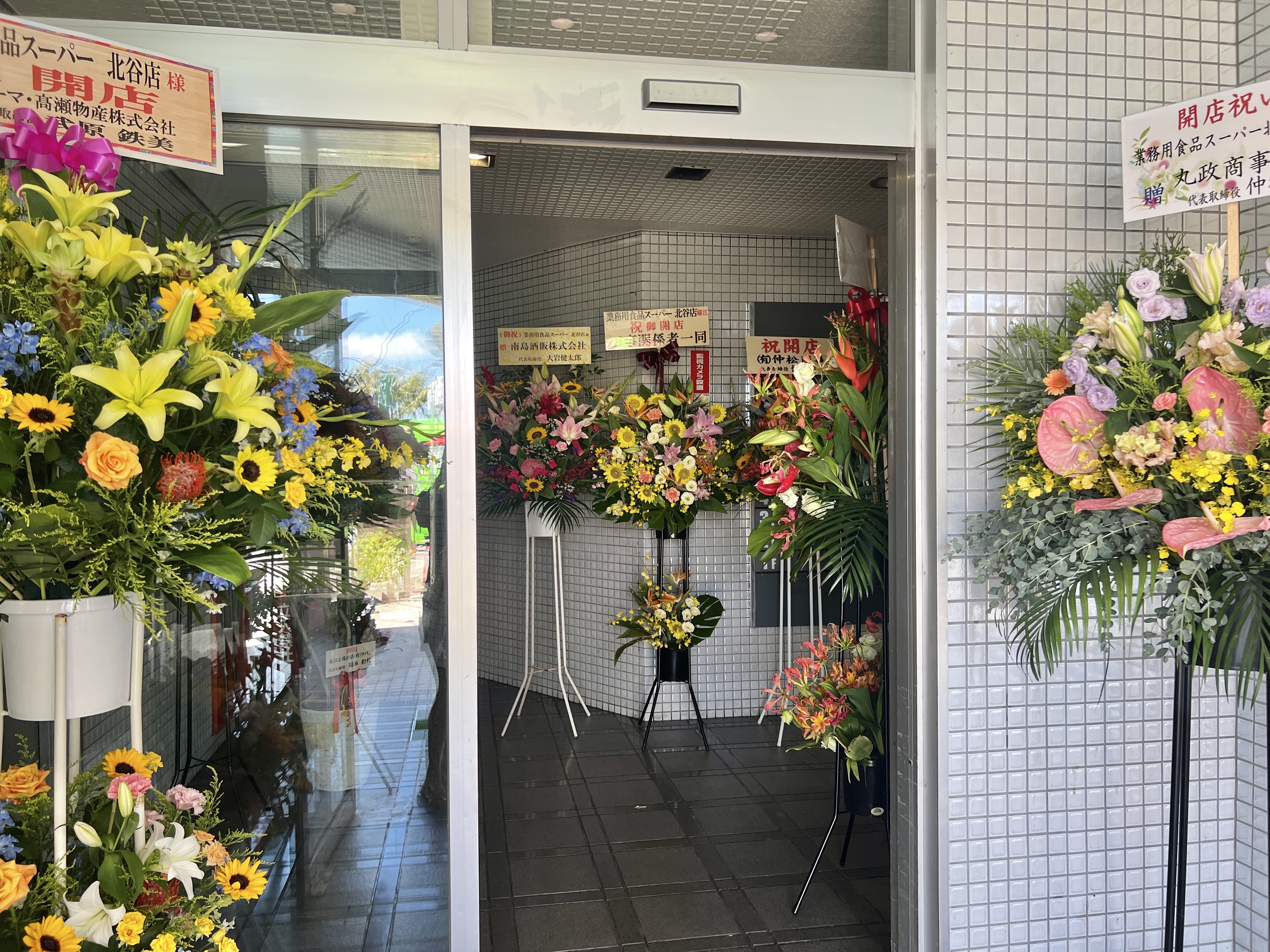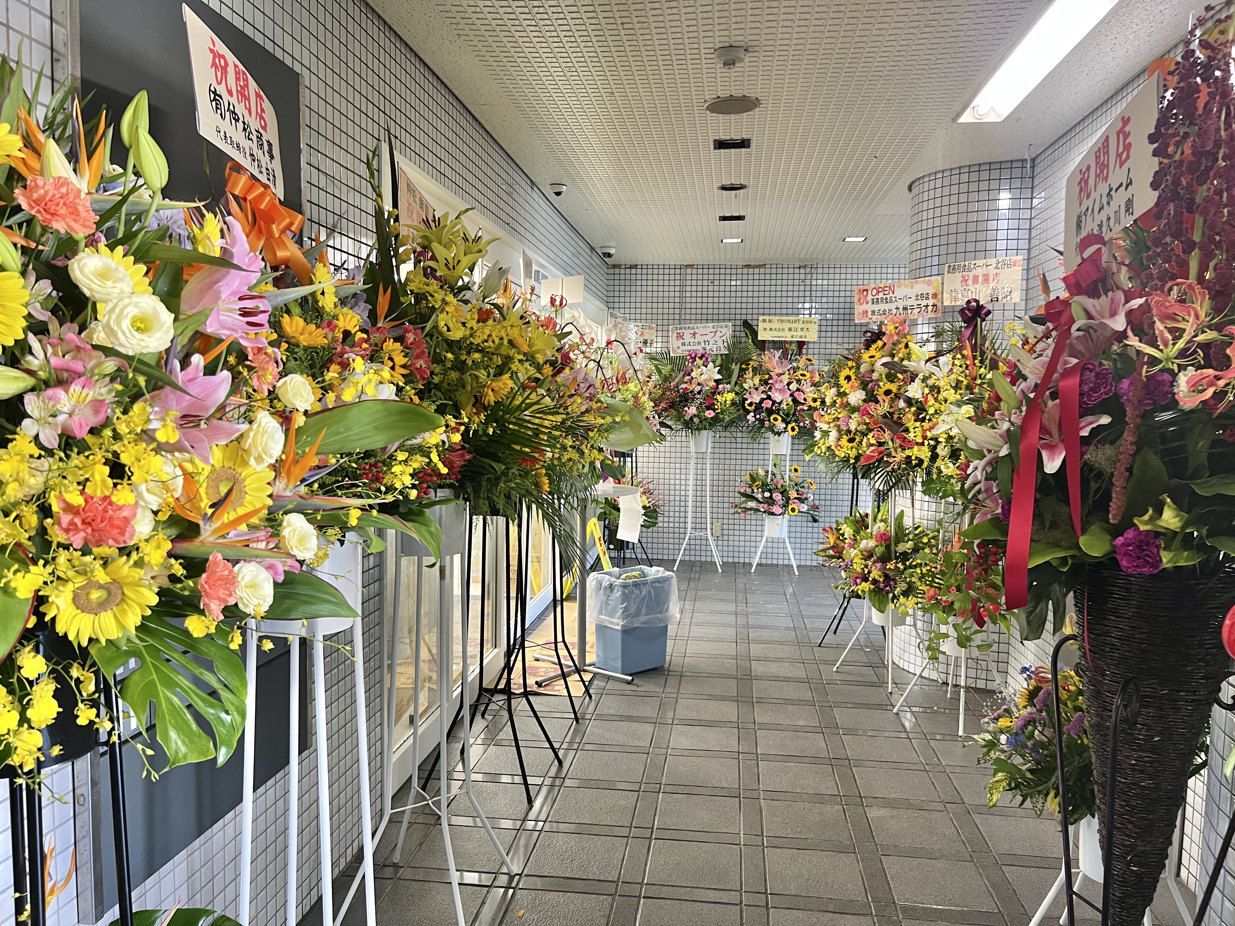 お店の正面出入り口前には開店祝いの立派なお花が飾られていました。