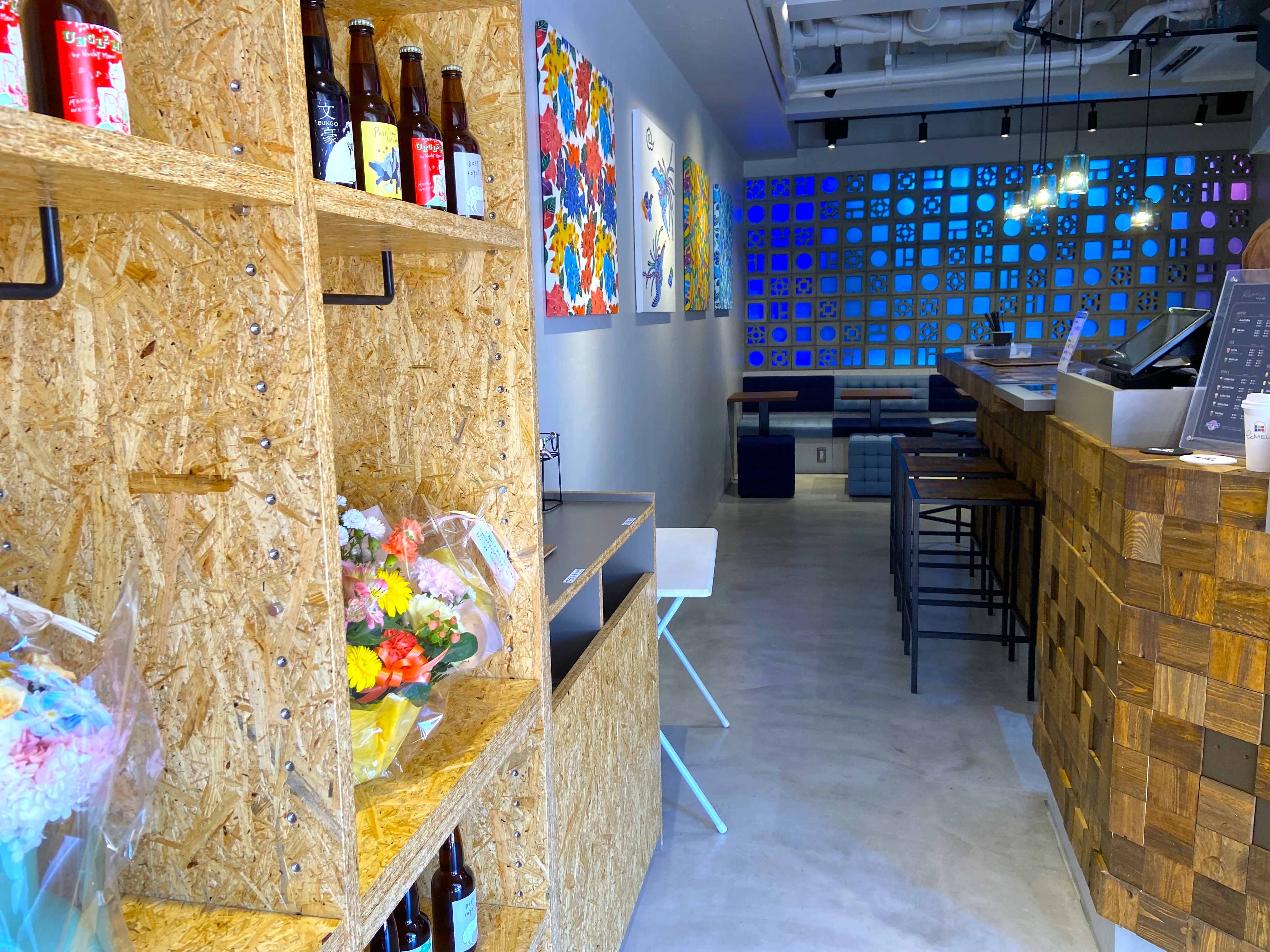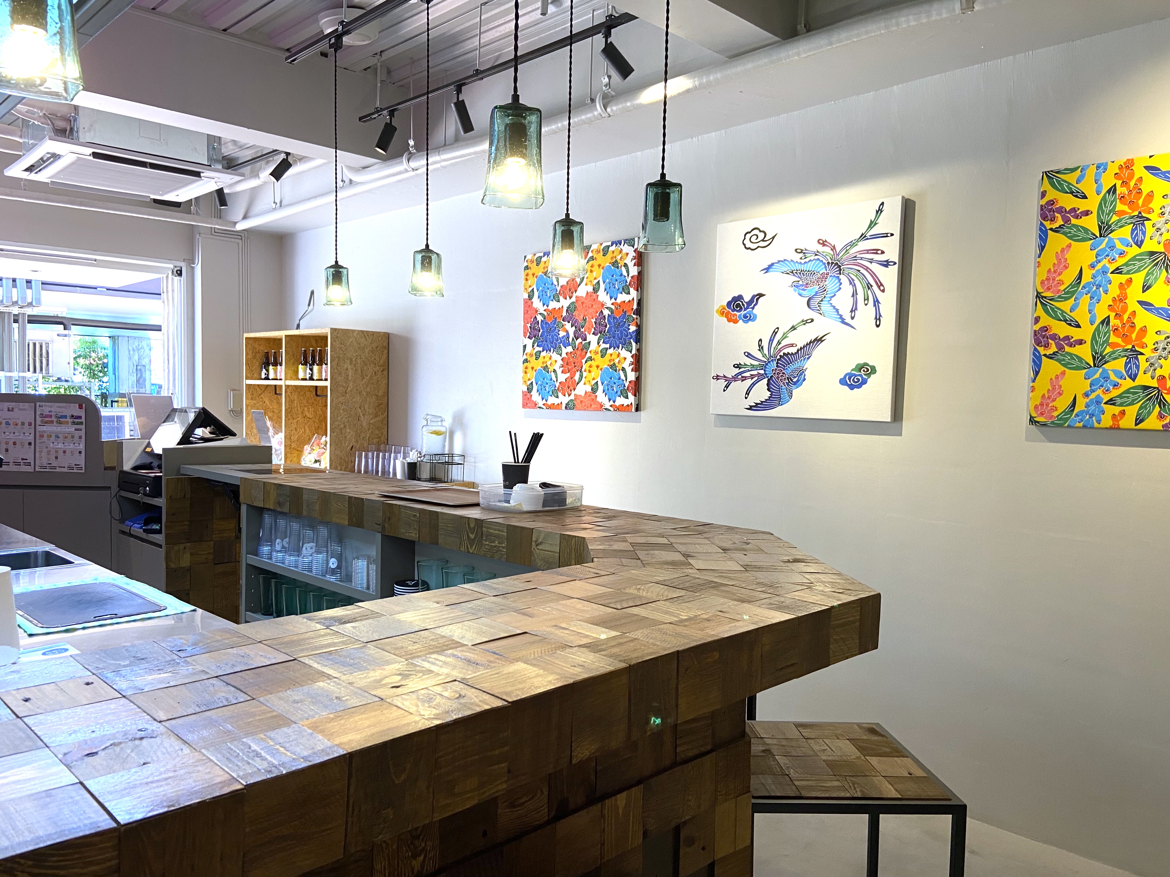 お店の内装は店頭のカラフルブロックと調和のとれたデザインでこだわりが詰まっていました。壁に飾られている紅型やブロック配色のソファーはフォトスポットとしても注目されそうです。