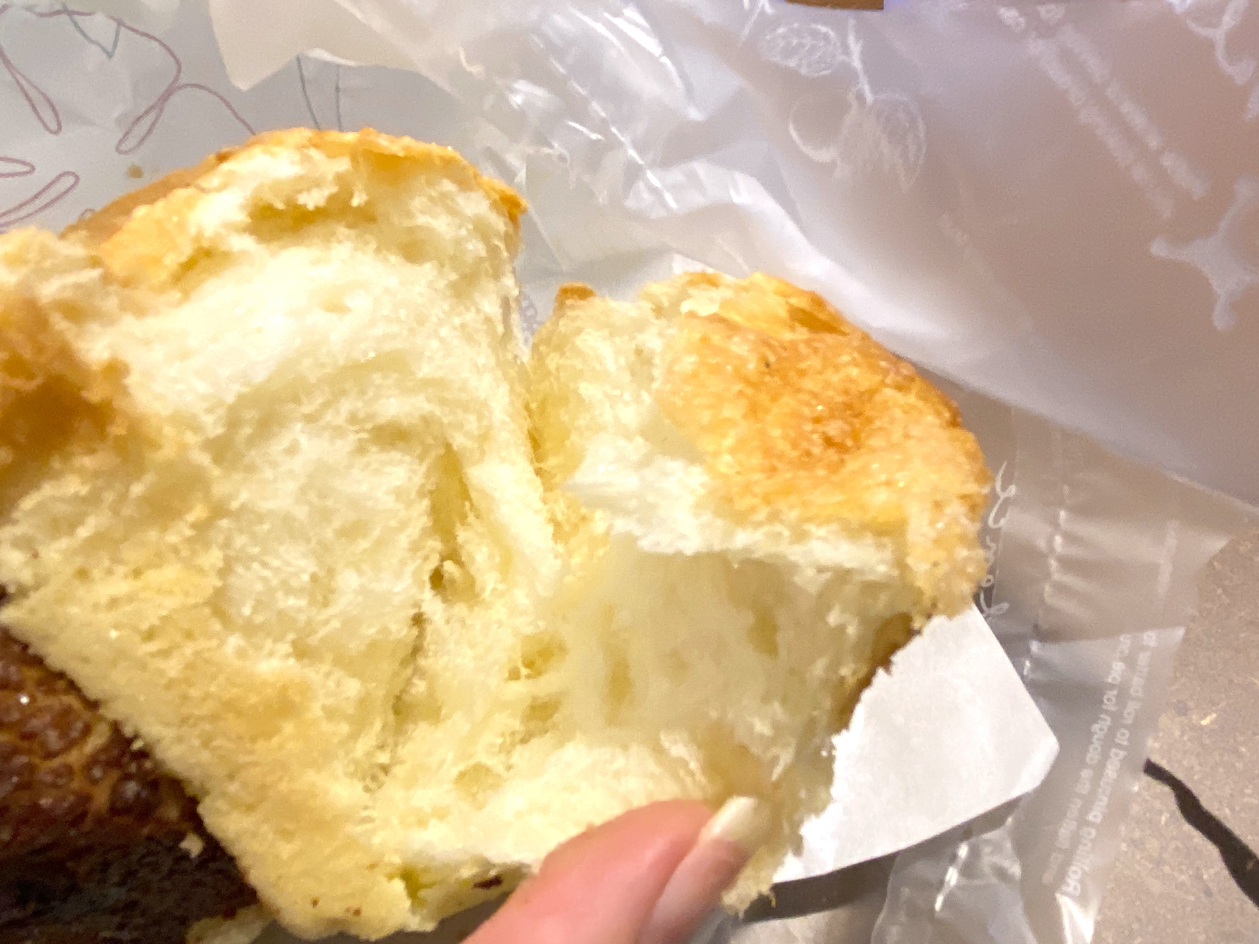 メロンパン特有のサクサクのクッキー生地は軽め、中のパン生地は時間が経ってもふわふわむっちり食感でした。手の平にコロンと乗るサイズ感です。