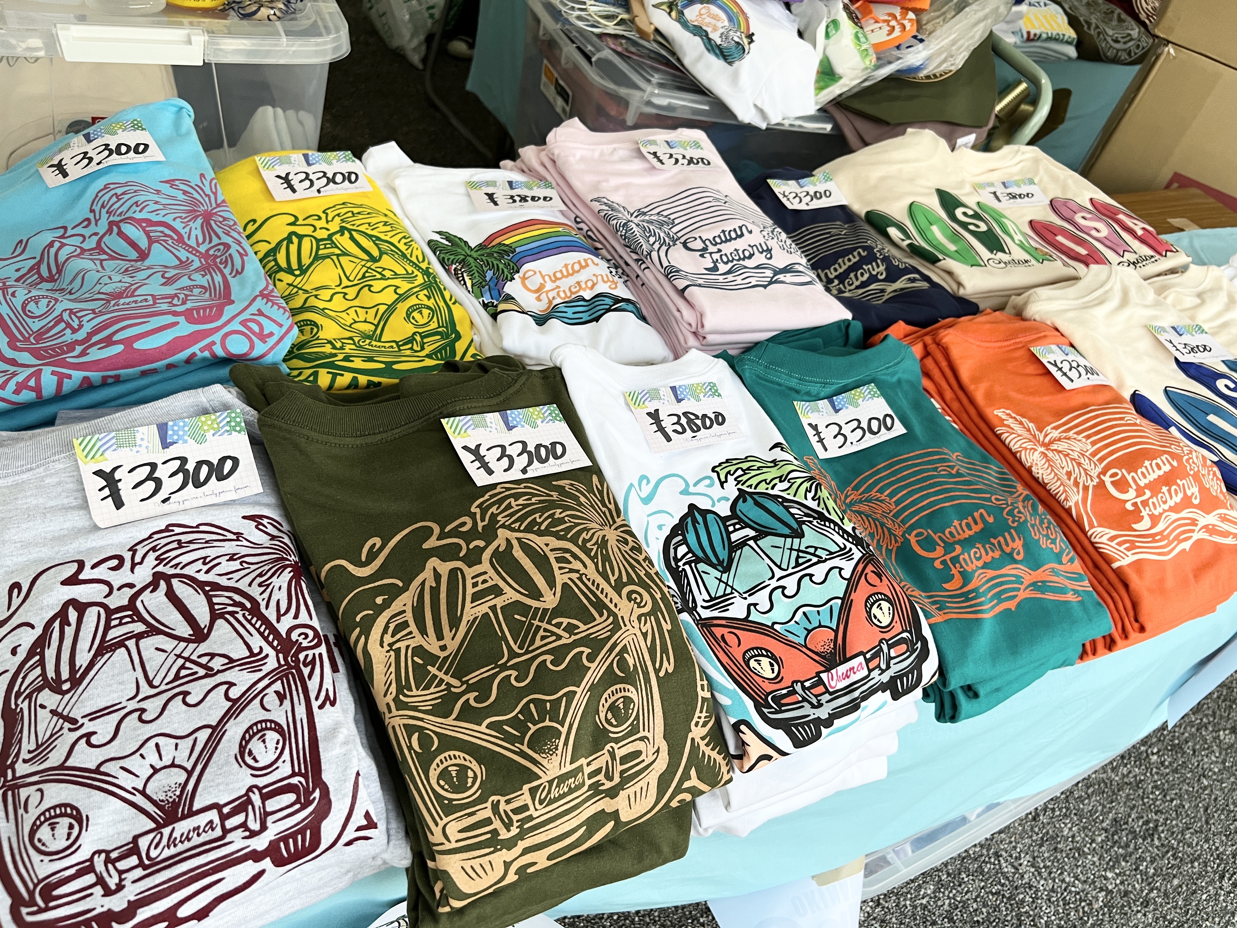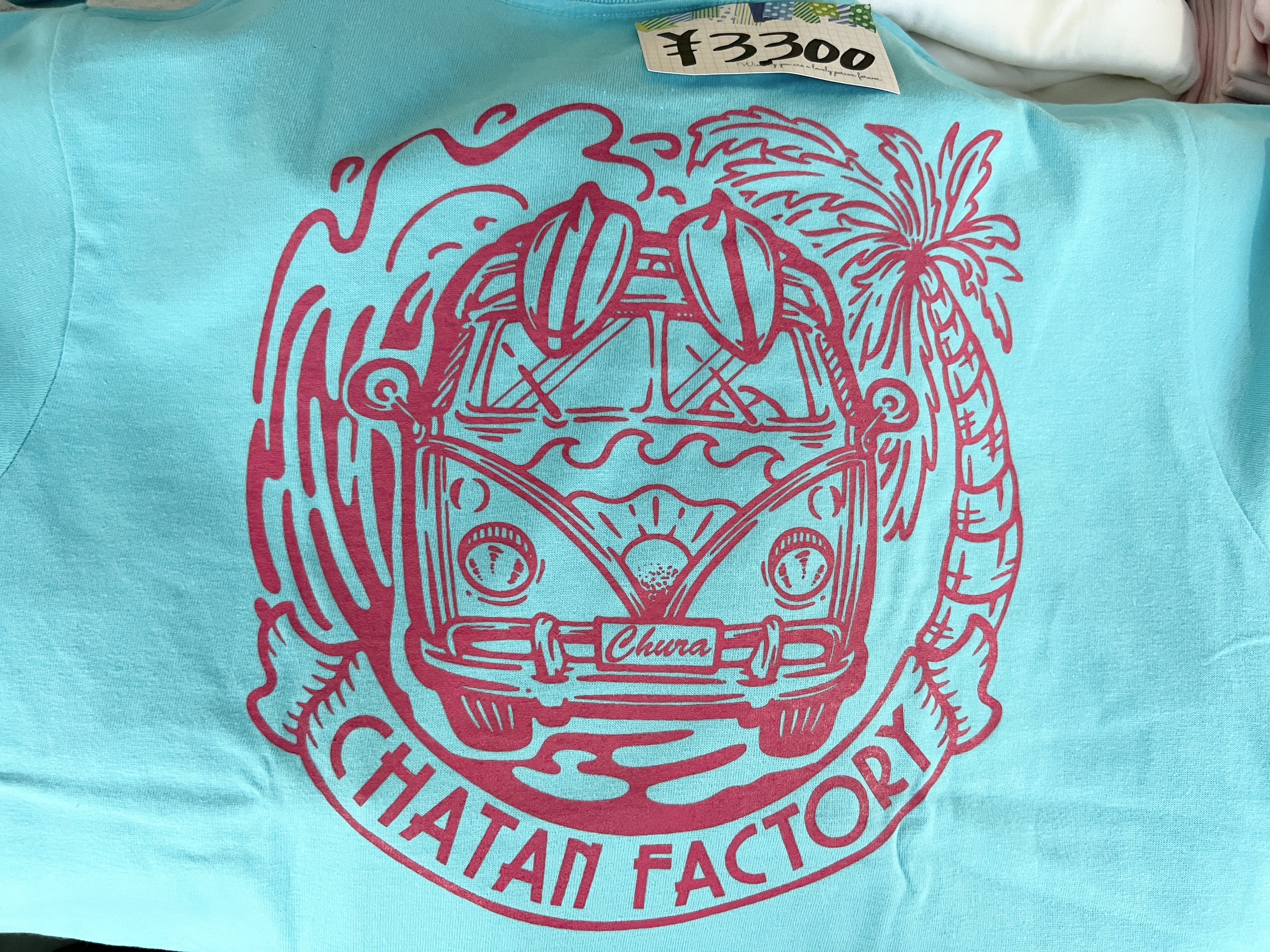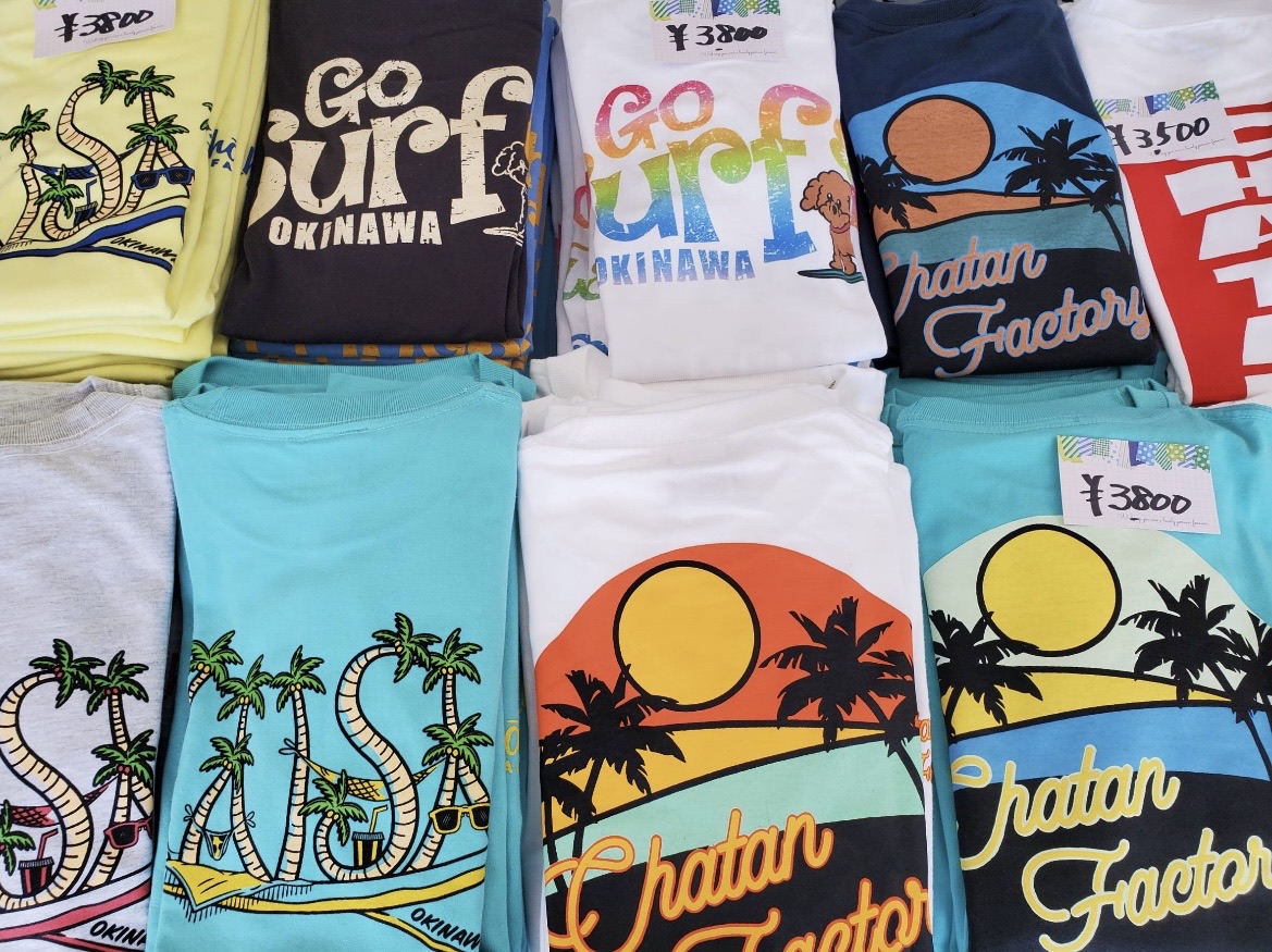お店の方へ伺ったところ、ご自身でデザインを手掛けてるとのことで、なんと手書きだそうです。センスの塊ですね!Tシャツのデザイン内に記載されている「CHATAN FACTORY」という文字ですが、琉球工房ちゅらさんのオリジナルシリーズだそうです。