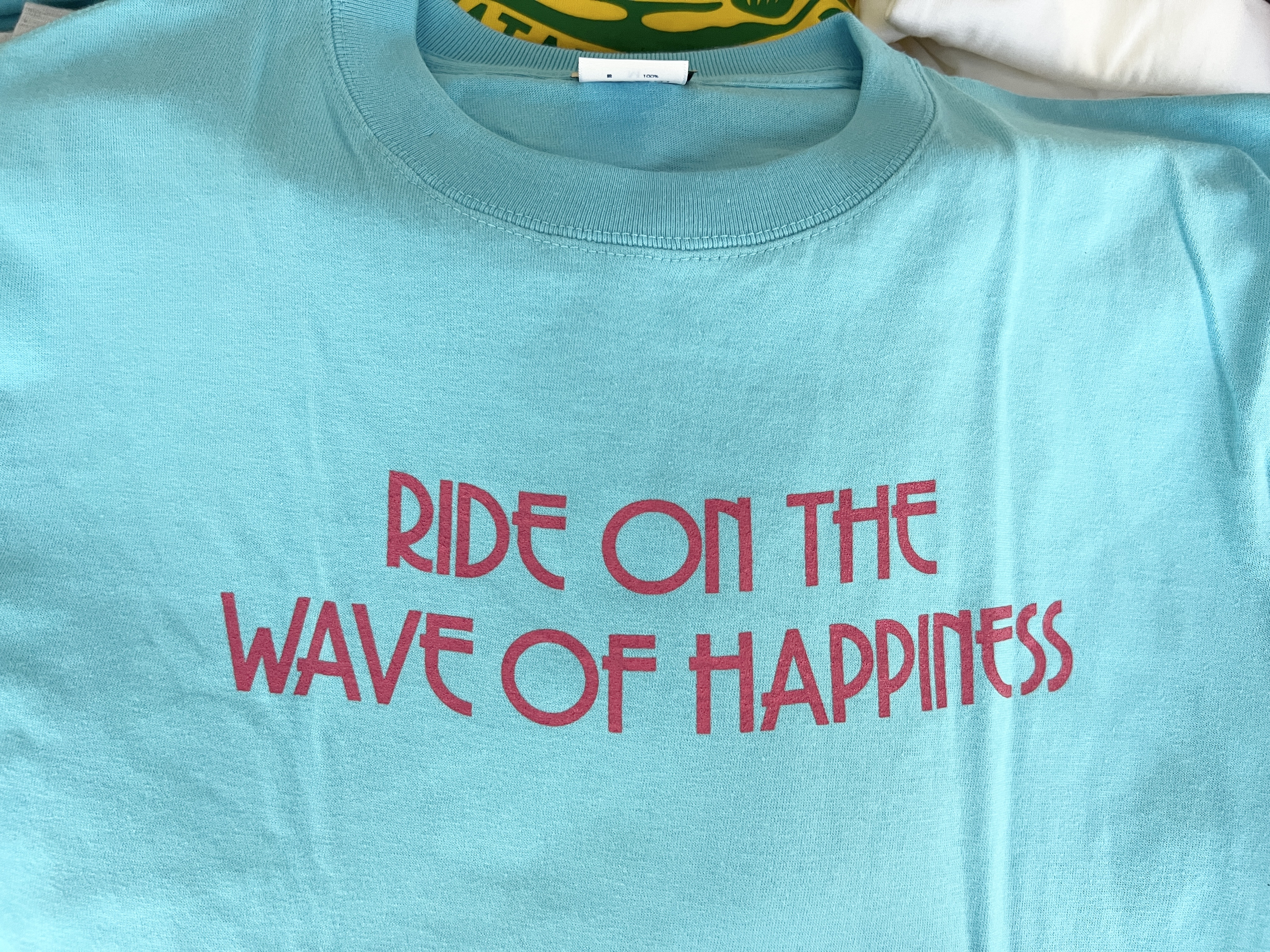 今回は、こちらの爽やかなブルー色が特徴のTシャツを購入しました。デザインの色はピンク色でとても好きな組み合わせです。表面のデザインには「RIDE ON THE WAVE OF HAPPINESS」と書かれています。日本語では、「幸せの波に乗ろう~」という感じでしょうか。とても前向きな言葉で、やはり元気をもらえるTシャツに勝手ながら認定しました。(笑)