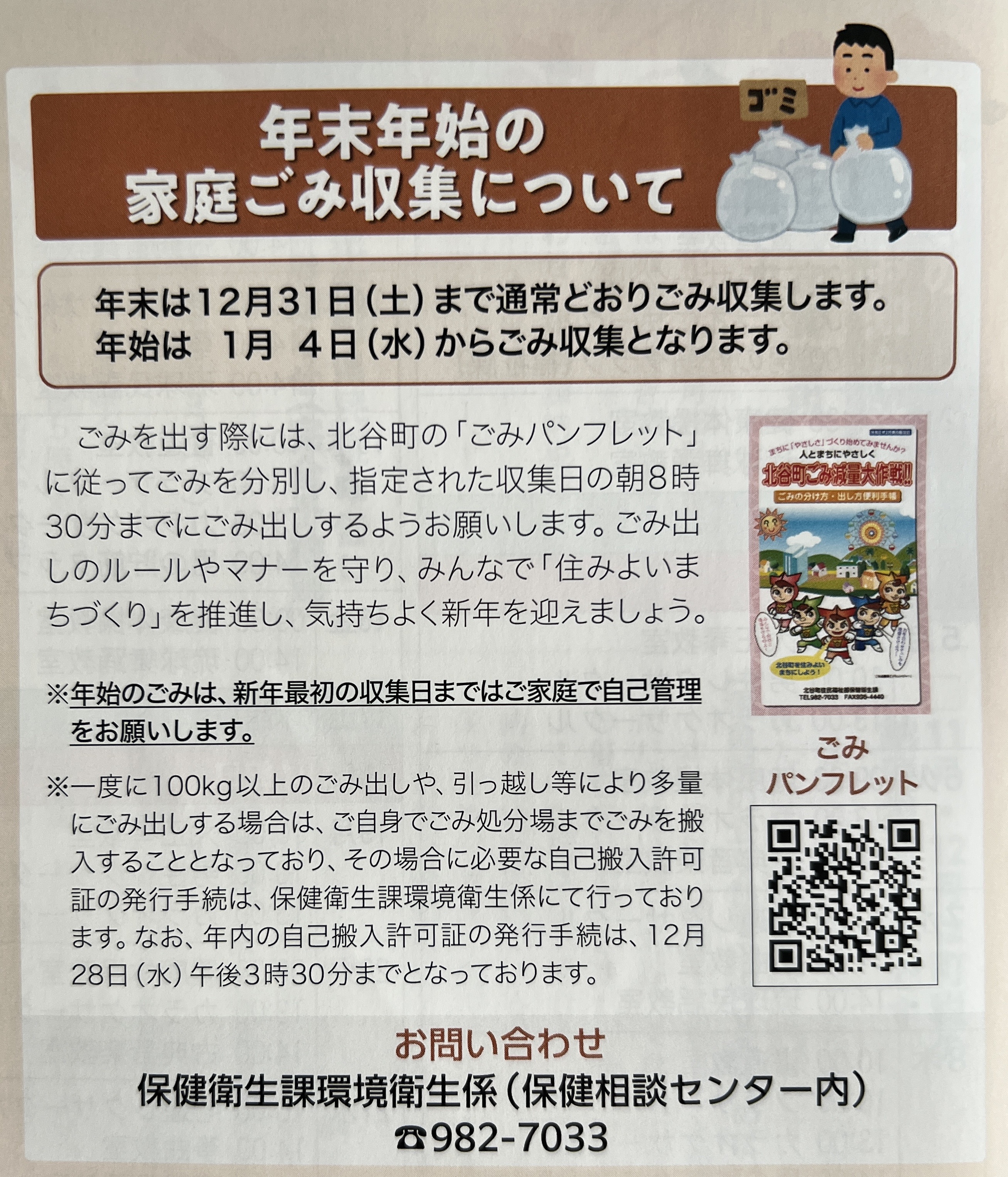 ということで、年末年始の家庭ごみ収集日について気になる方がいらっしゃると思うのでお知らです。