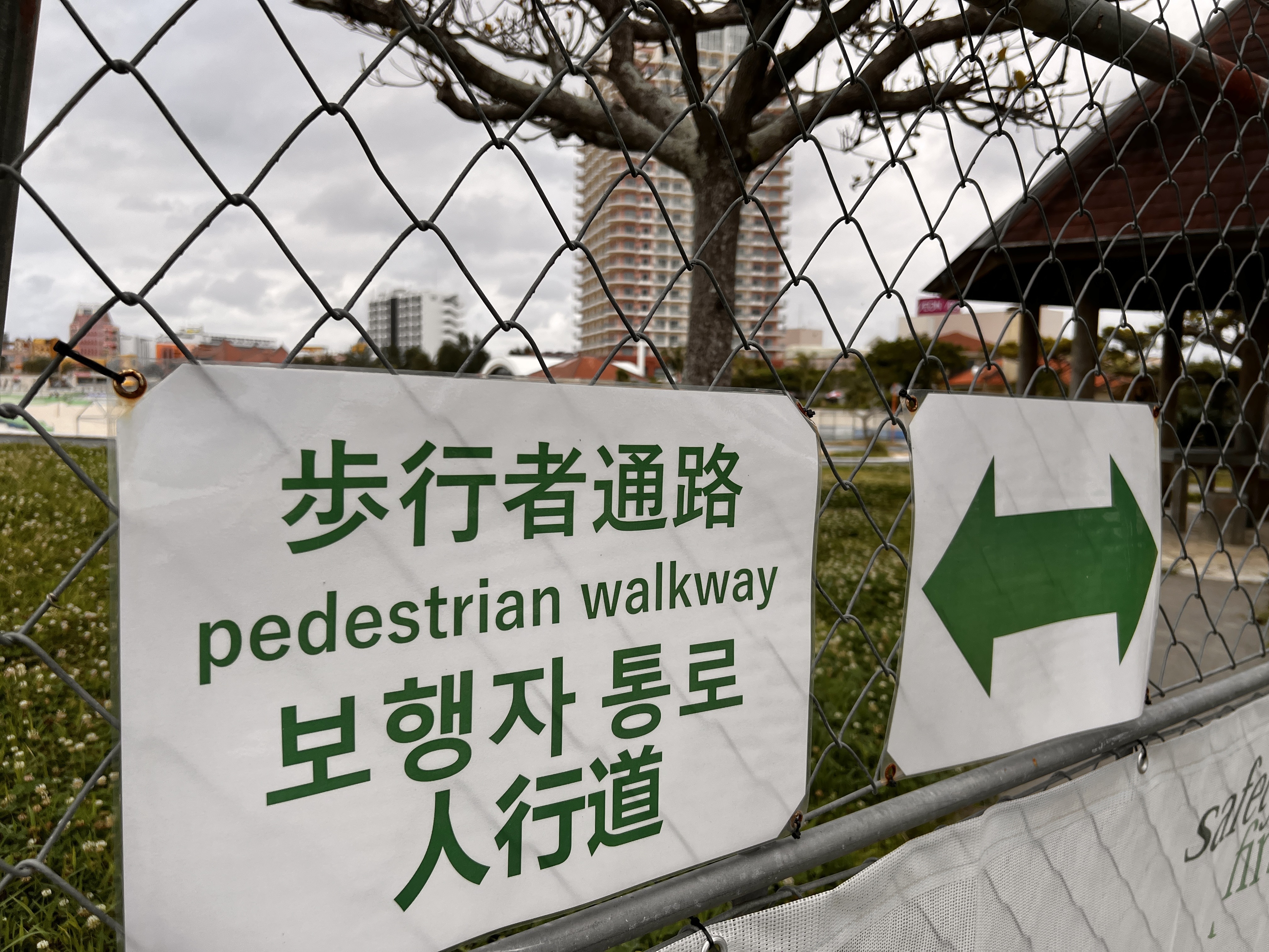 工事中で規制されているので、歩行者が分かりやすいようにこのような表示がありました。