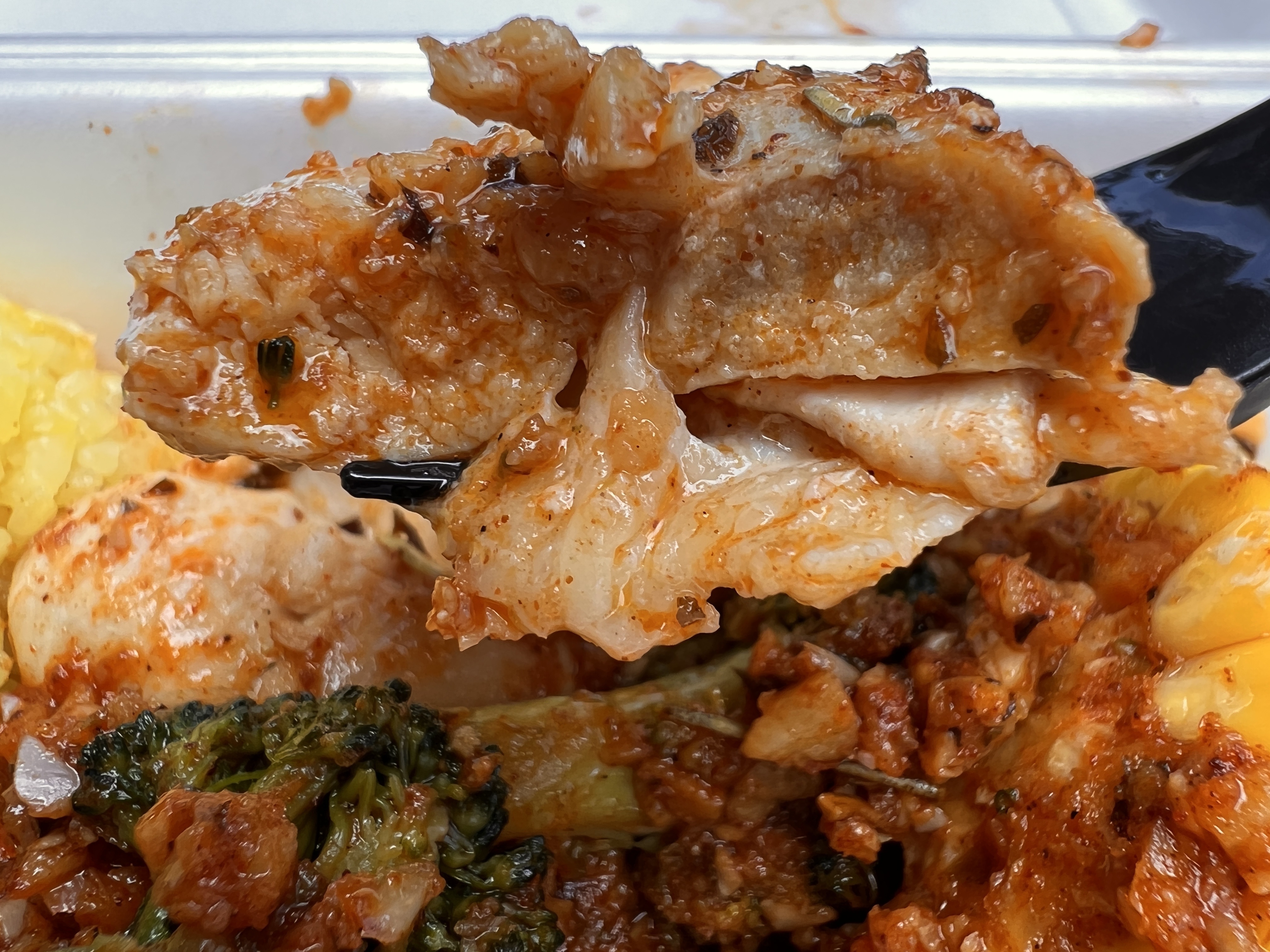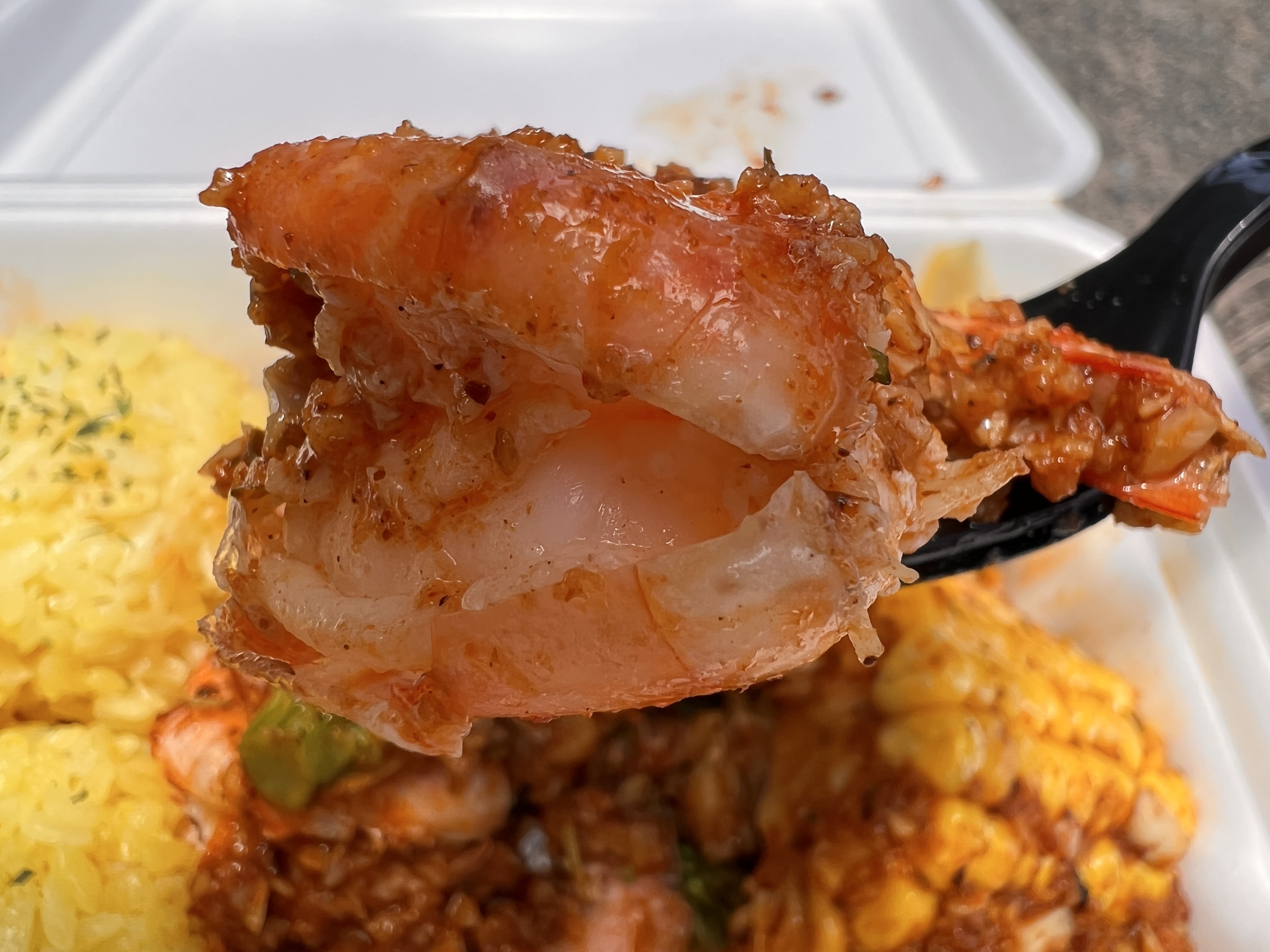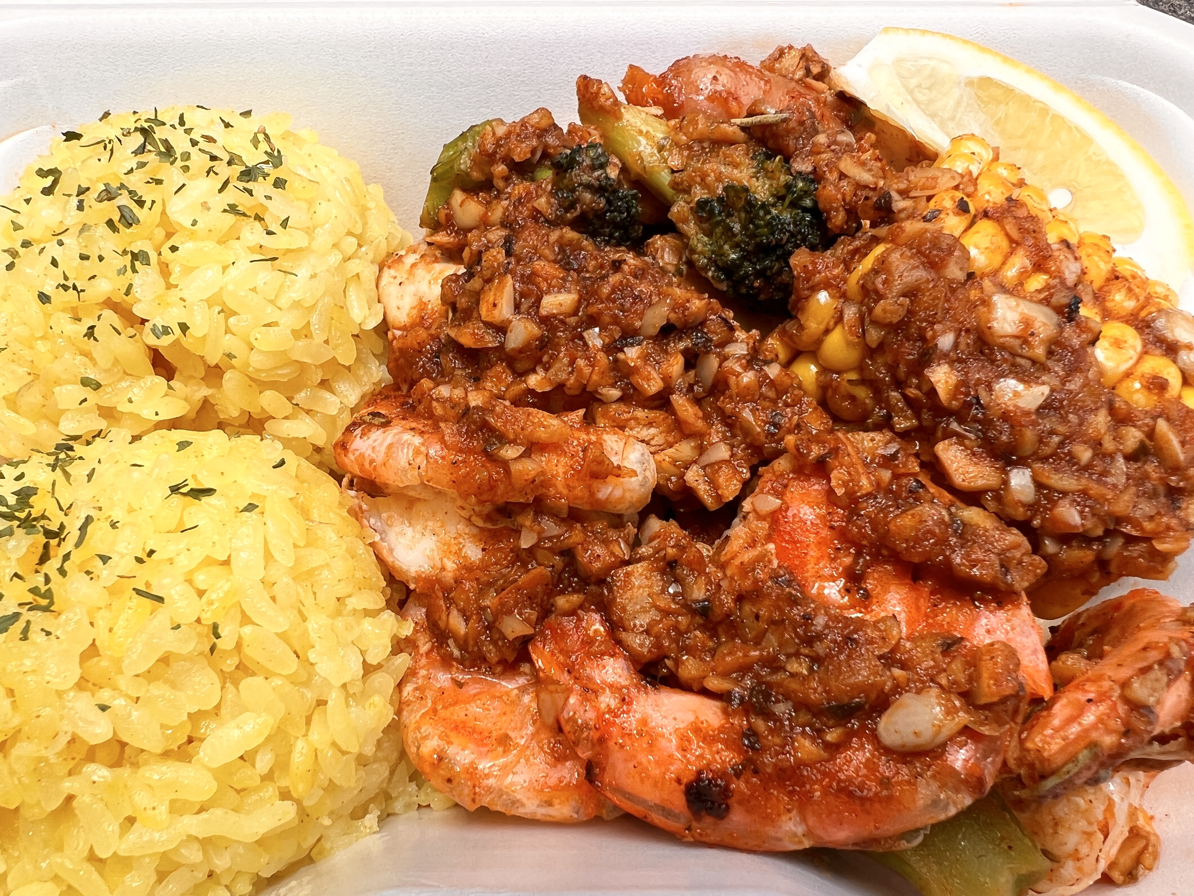 シュリンププレート、チキンプレートとそれぞれありますが、こちらはシュリンプとチキンどちらも入っています。他にブロッコリーやコーン、ソーセージも入っていて具沢山です♪