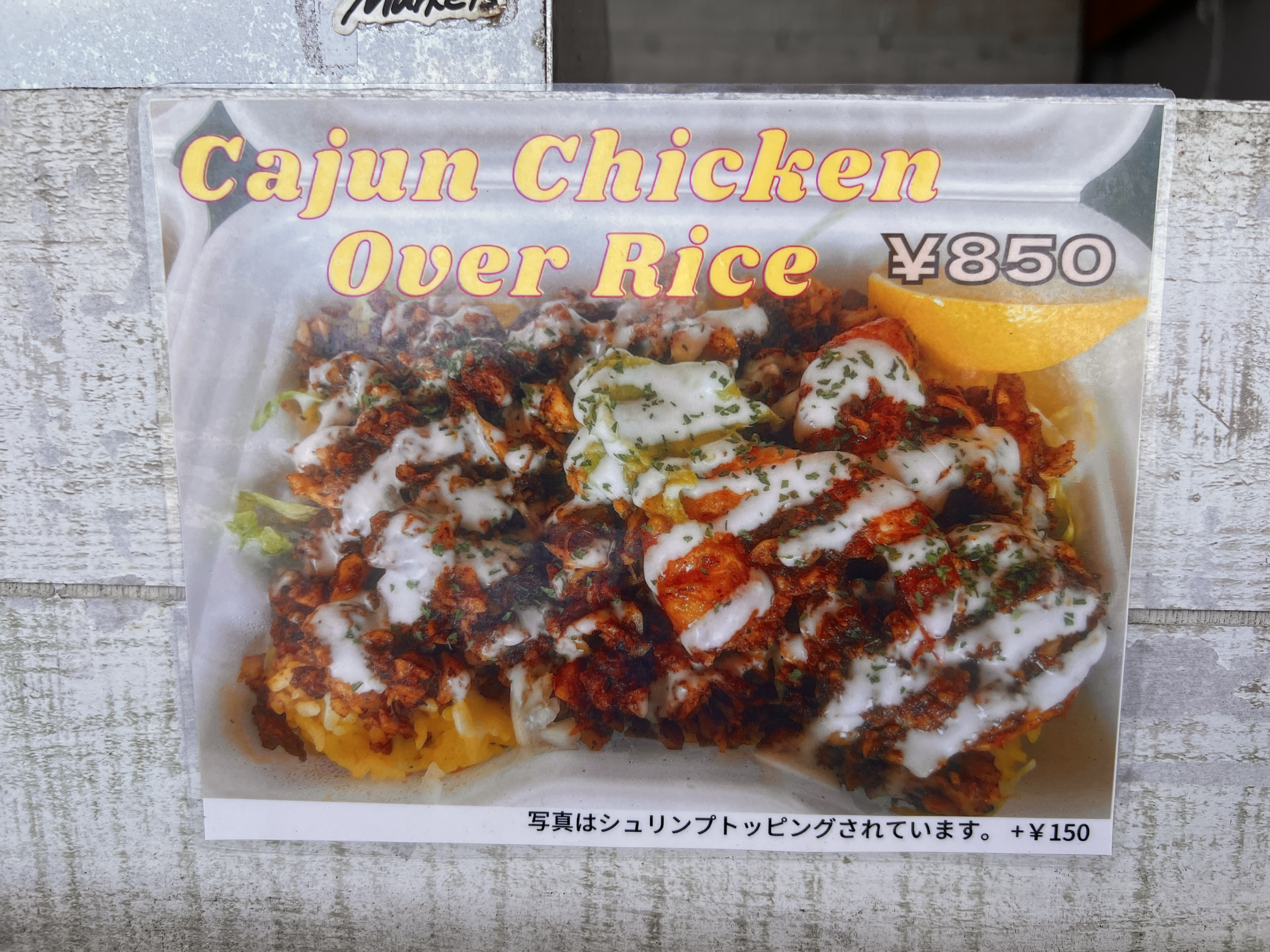 チキンオーバーライスもあります。追加料金でシュリンプのトッピングもできます。
