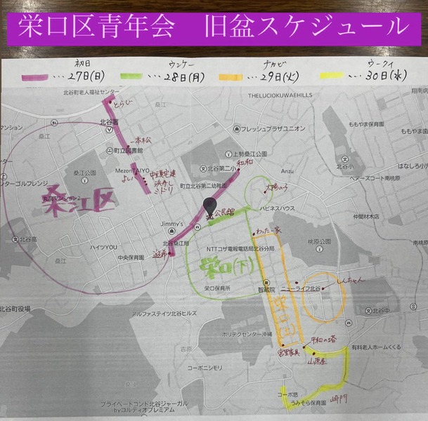 【北谷町】エイサー「栄口区青年会」と「謝苅区青年会」2023年旧盆道ジュネースケジュール