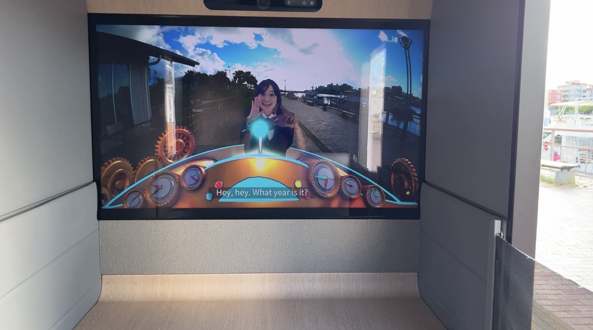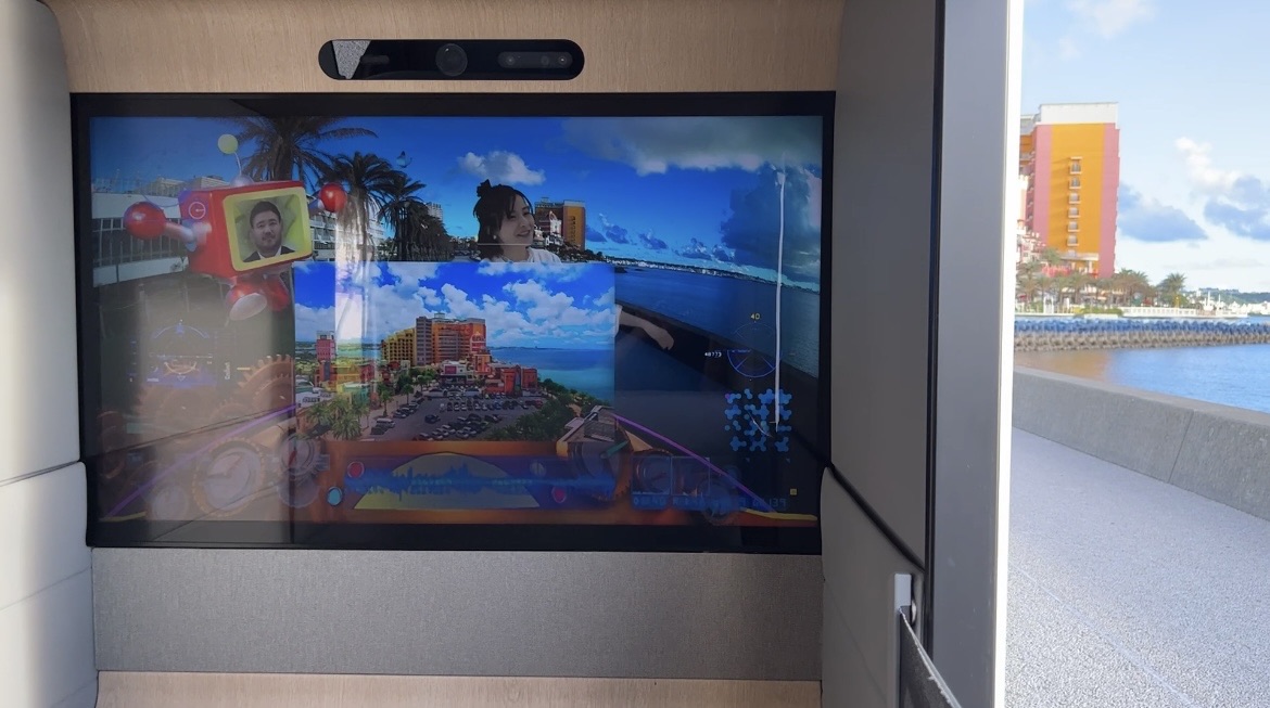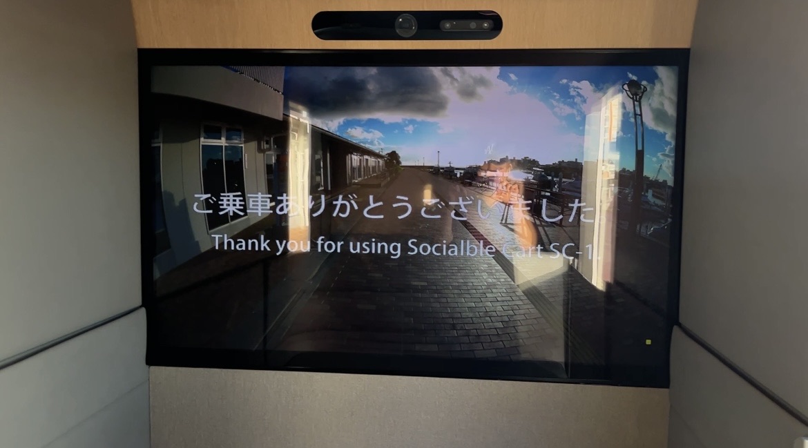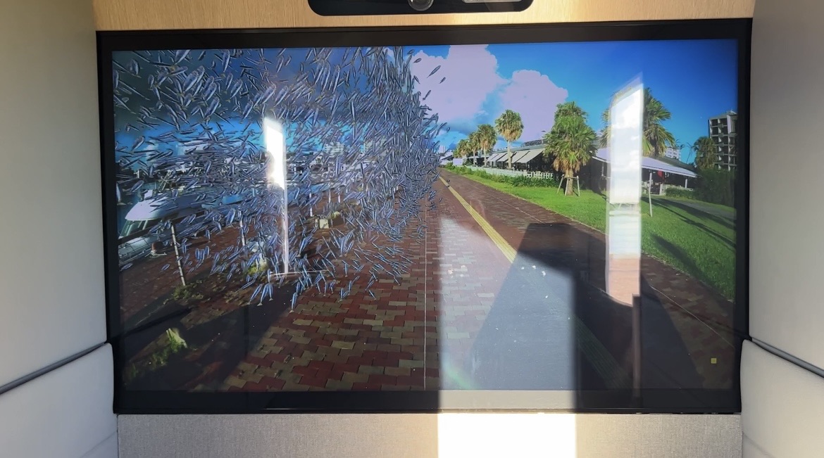 前方のモニターは外の景色と連動しているので、どこを走行中か把握できます。