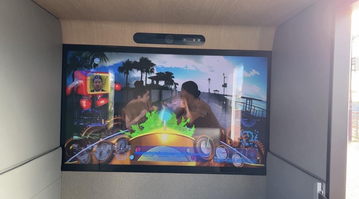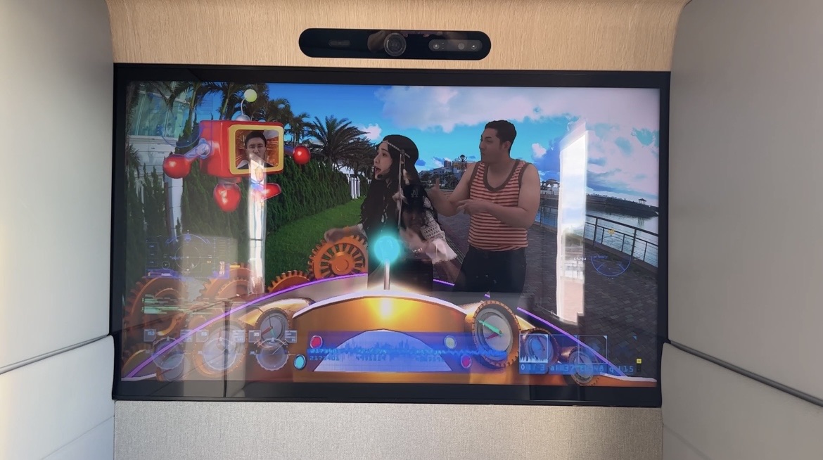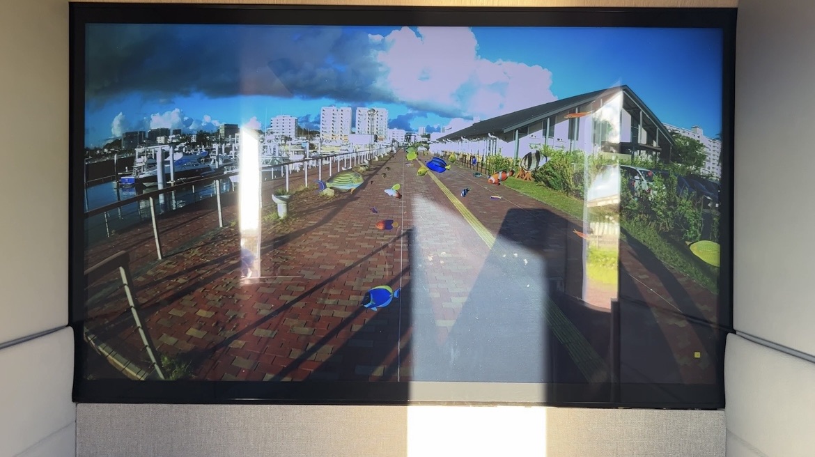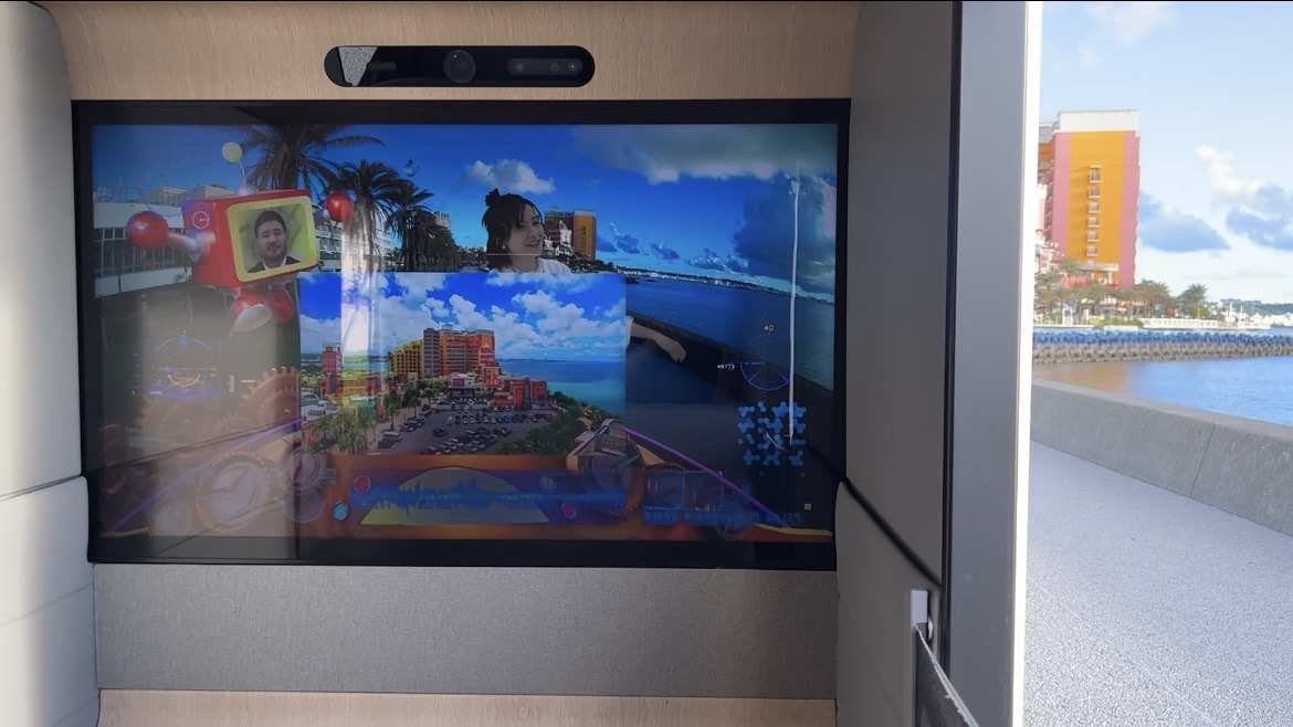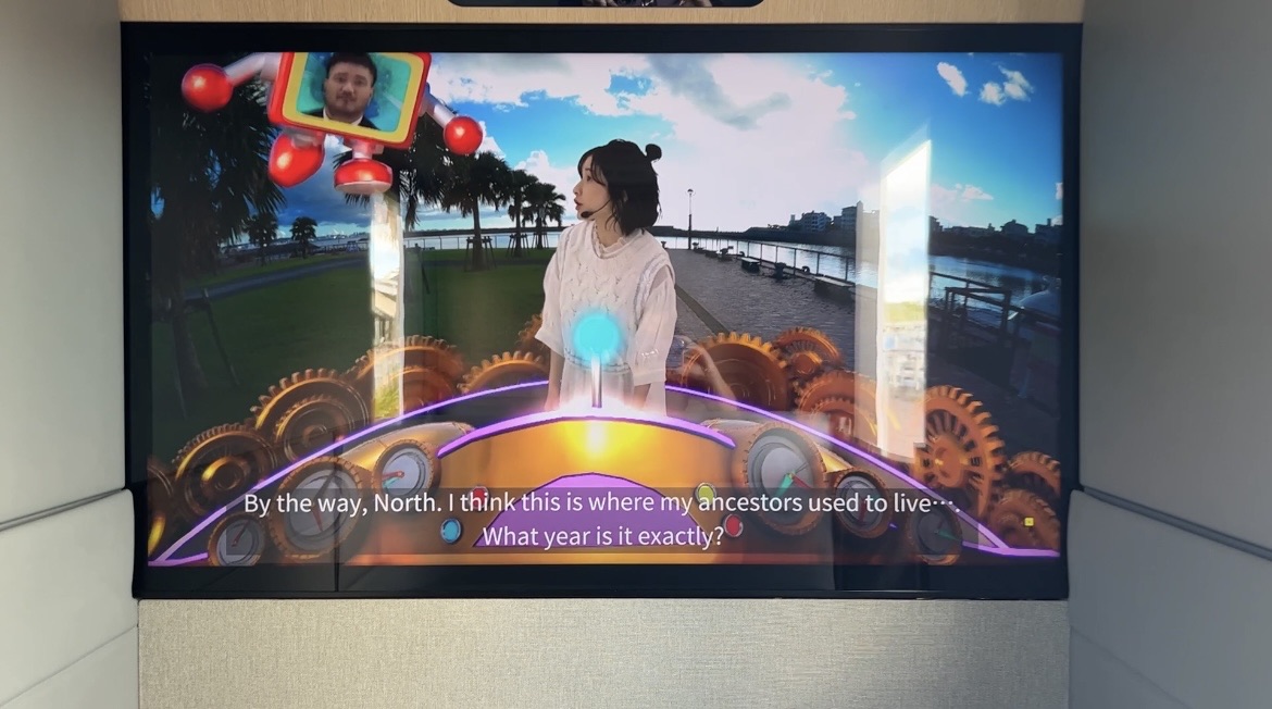 前方のモニターは外の景色と連動しているので、どこを走行中か把握できます。