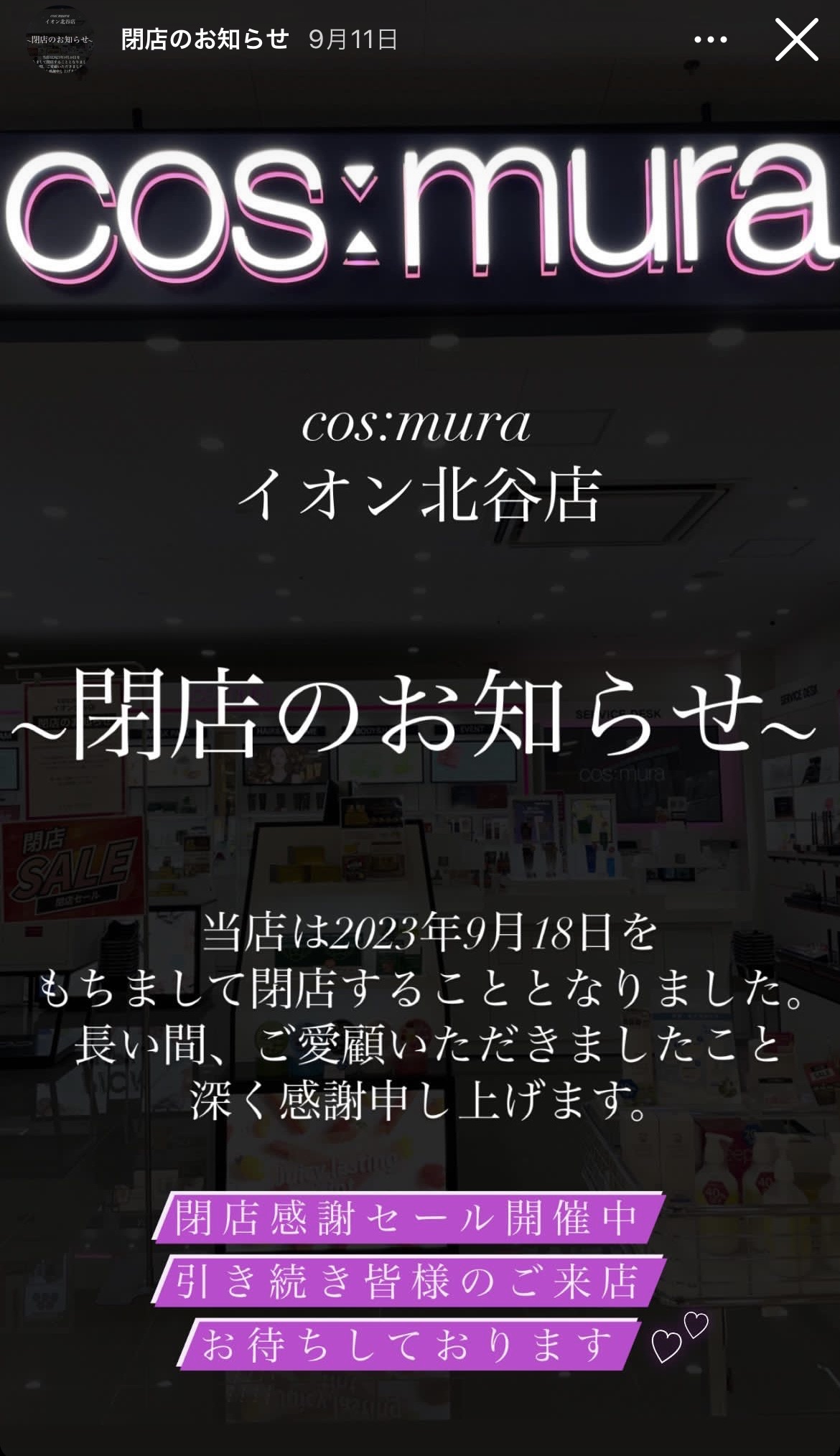 美浜のイオン北谷店内にあった韓国コスメブランドの専門店『cos:mura(コスムラ)イオン北谷店』が、2023年9月18日(月)に閉店していました。