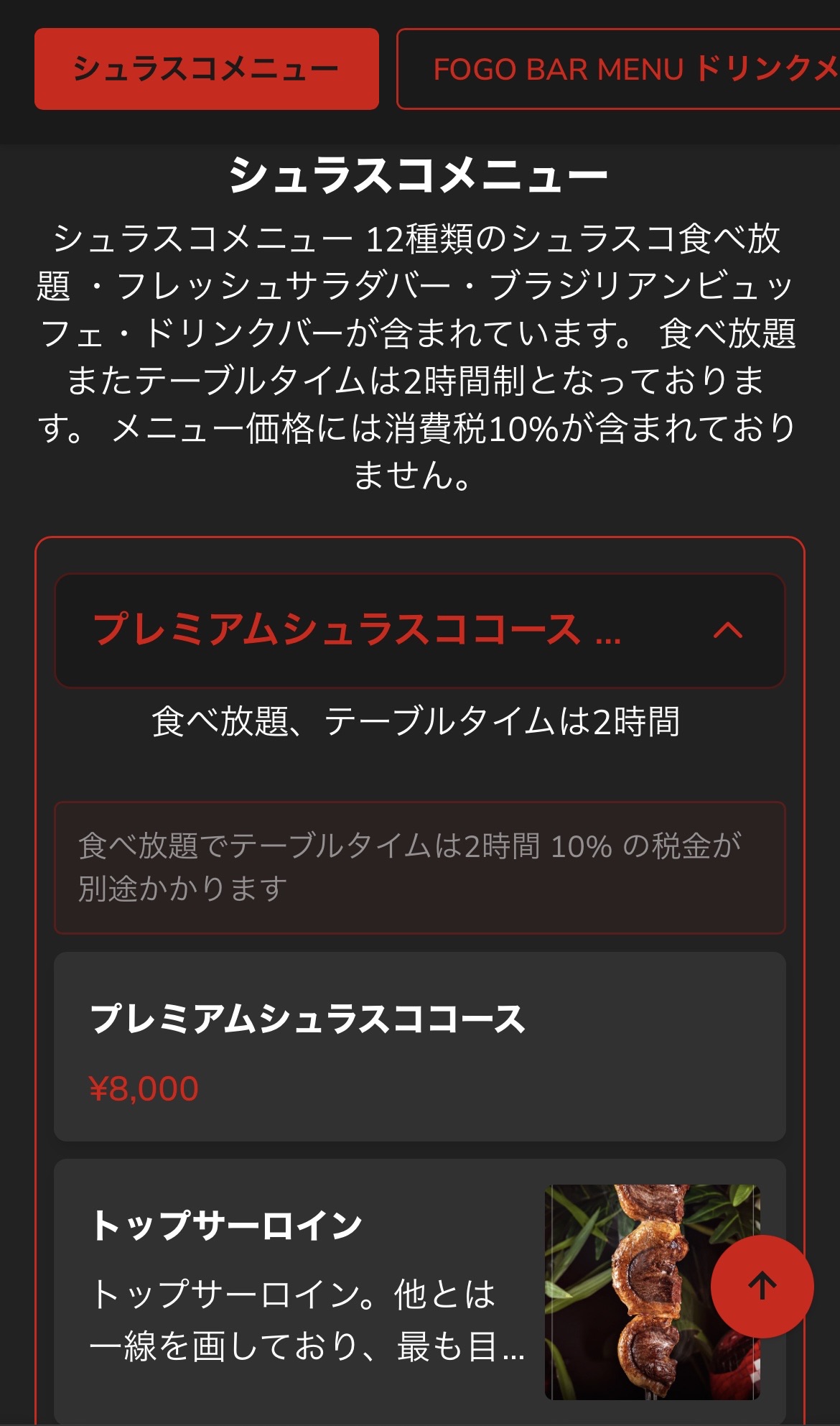 『FOGO BRAZIL』は、単品料理はなく2時間シュラスコが食べ放題で8,800円(税込)となっています。