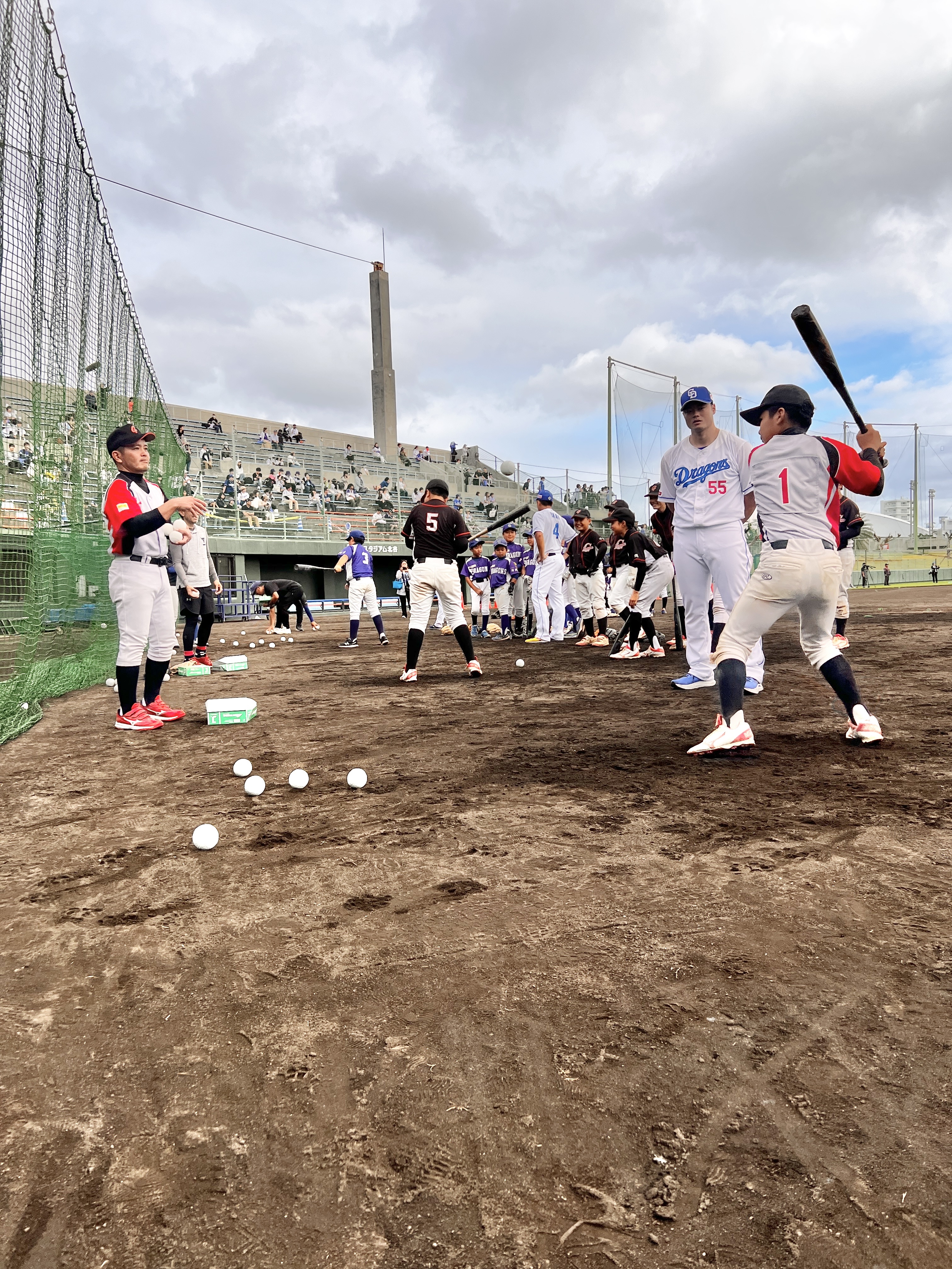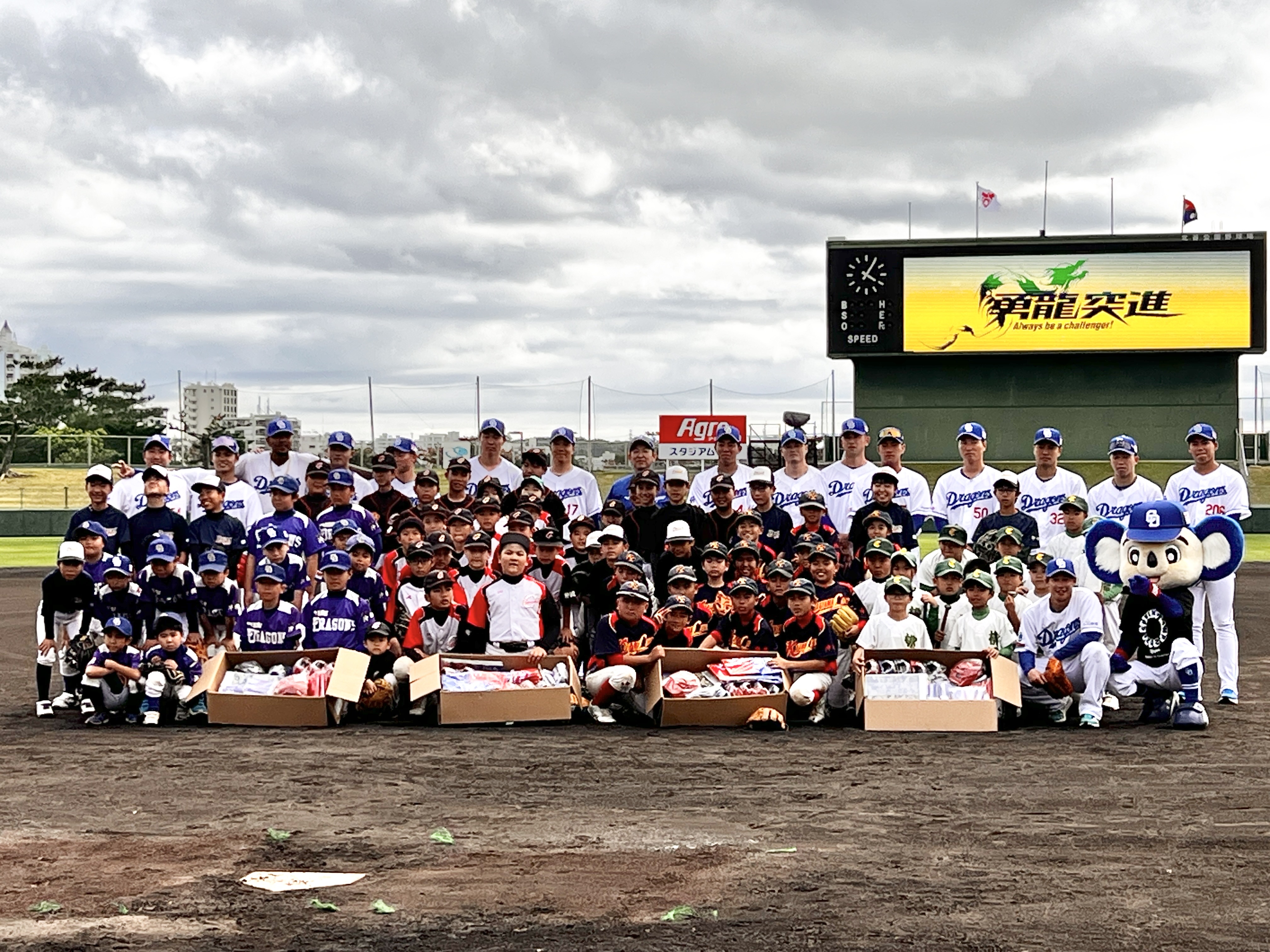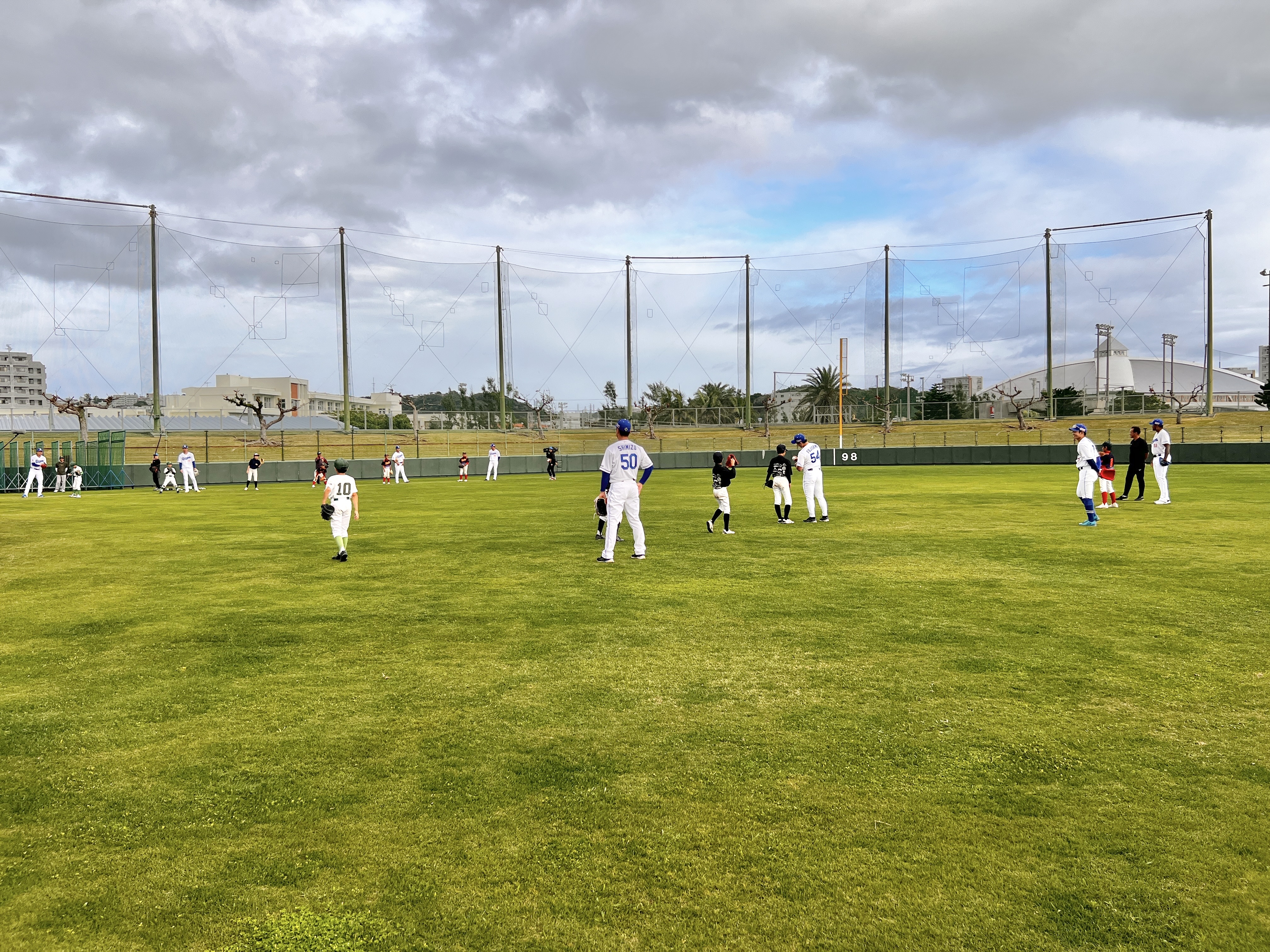 その後は球場内にて、北谷町内の少年野球チームを招いて中日ドラゴンズの選手の方々による野球教室が行われました。