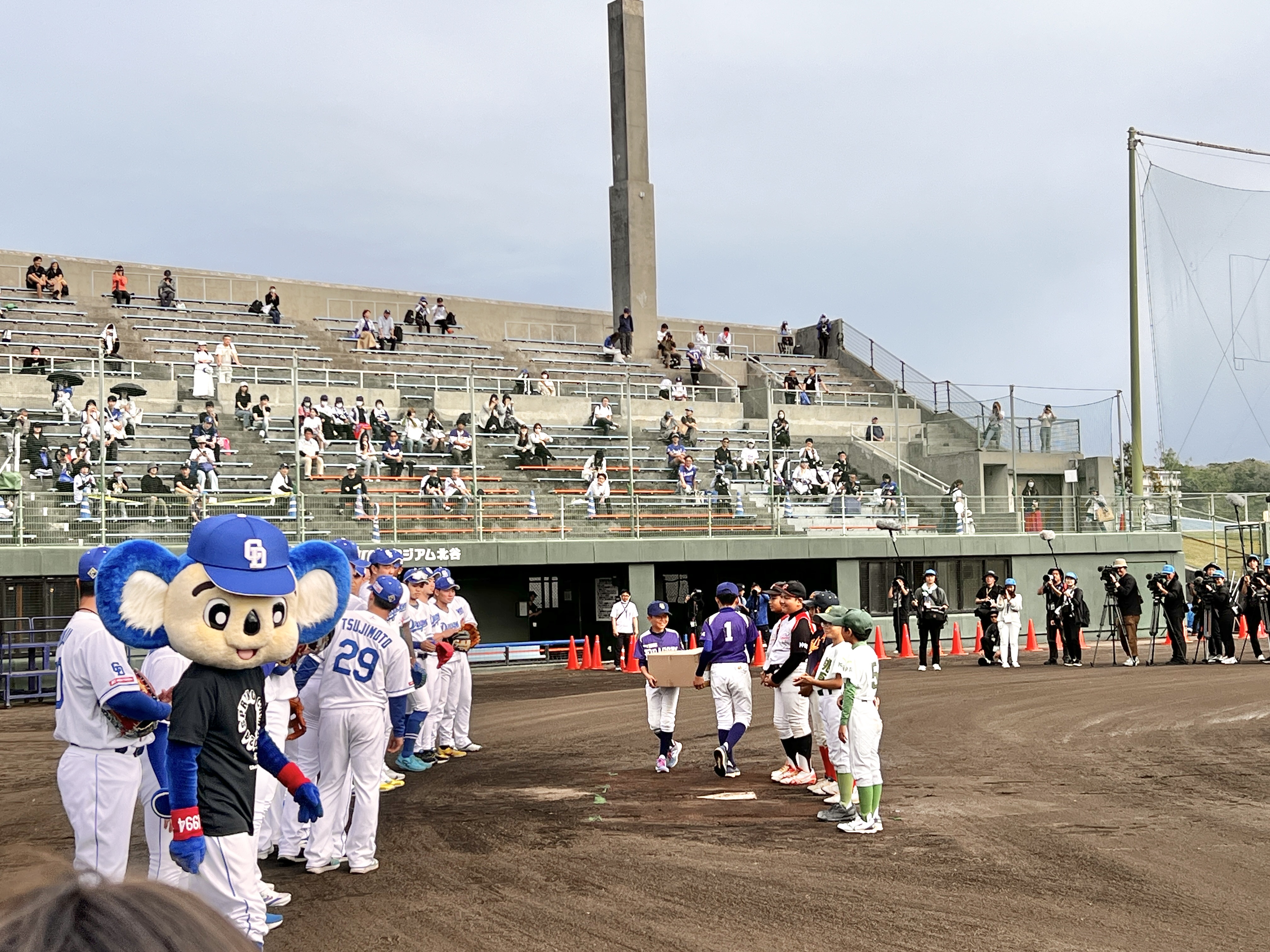 最初に中日ドラゴンズの皆さんから少年野球チームへ野球ボールの贈呈が行われました。