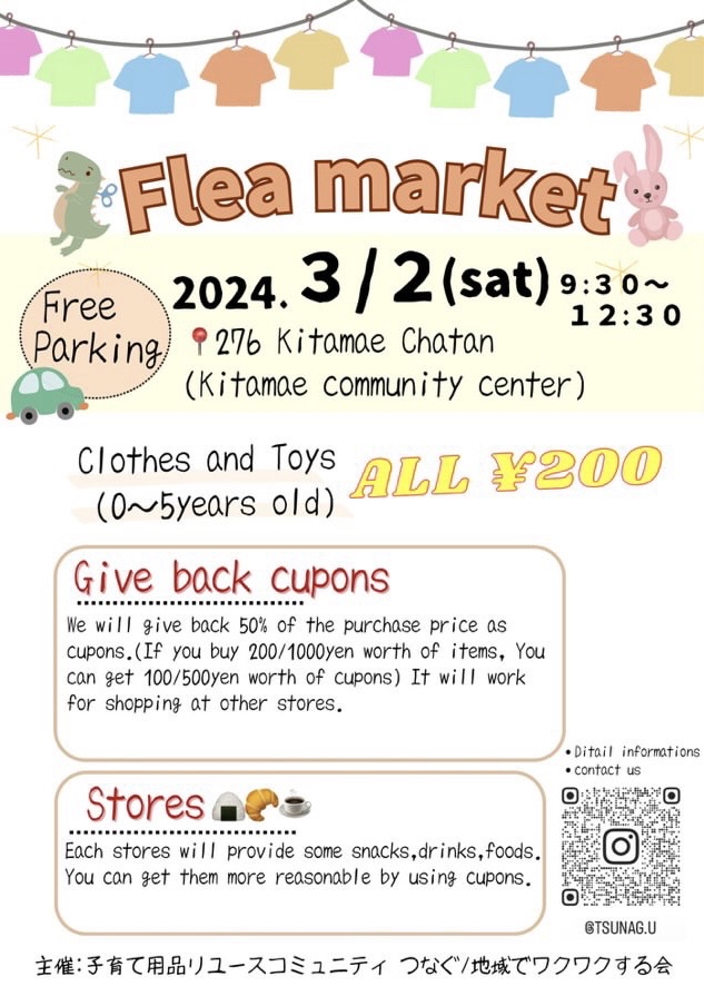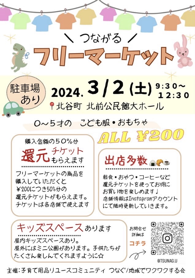 2024年3月2日(土)に、北前区公民館の大ホールにて子供服をメインとしたフリーマーケットが開催されますよー!