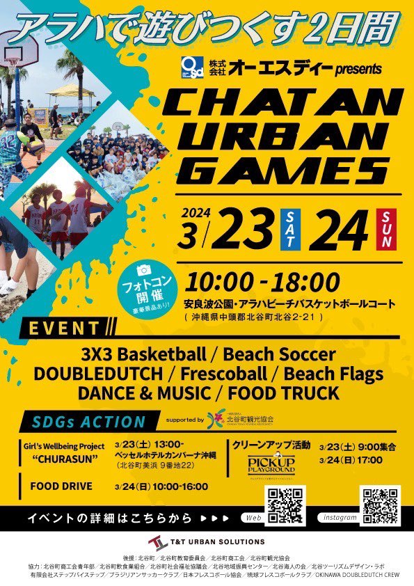 2024年3月23日・24日(日)の2日間、北谷町のアラハビーチ内バスケットボールコートにて『株式会社オーエスディー presents CHATAN URBAN GAMES』が開催されますよー!