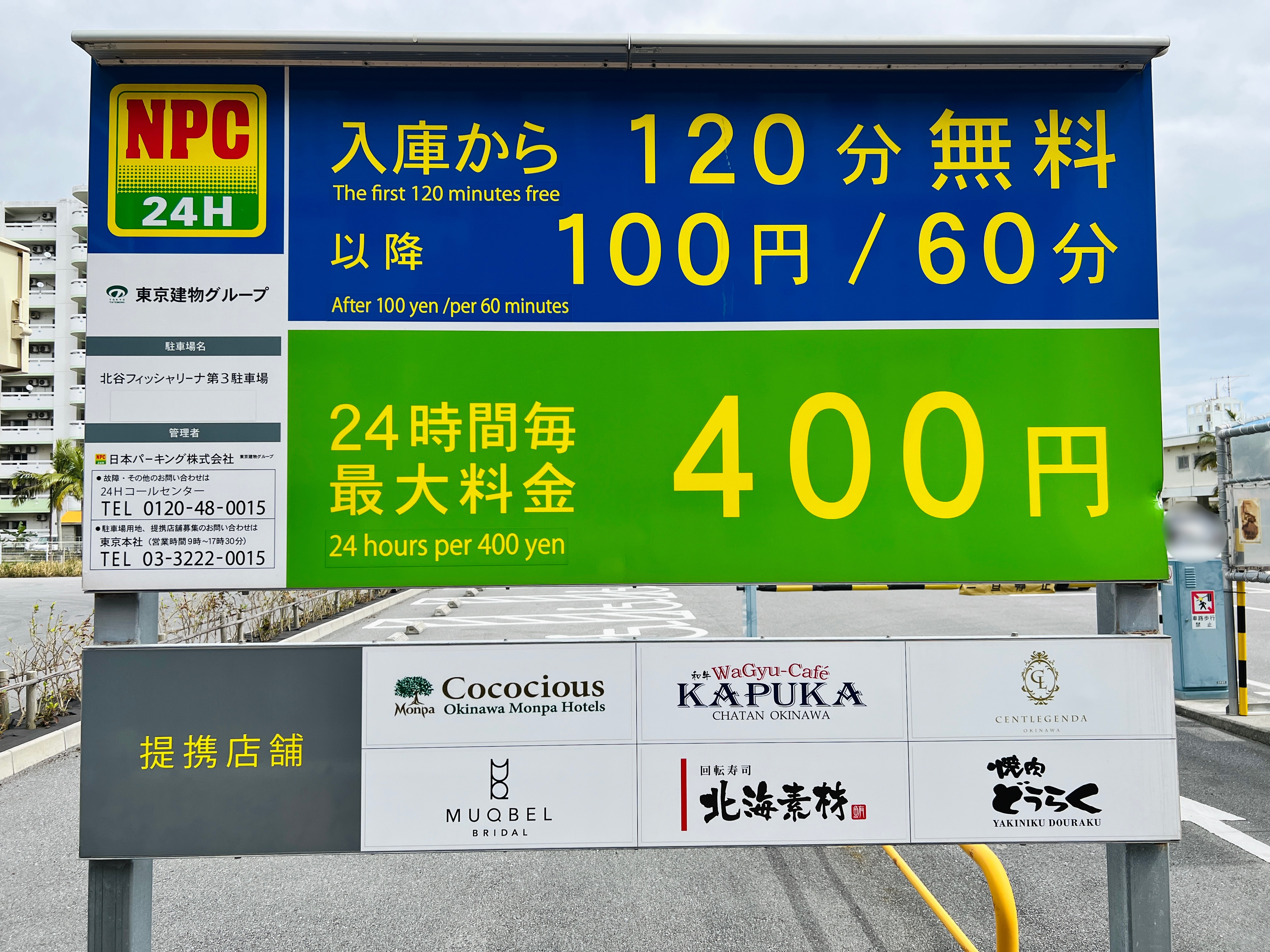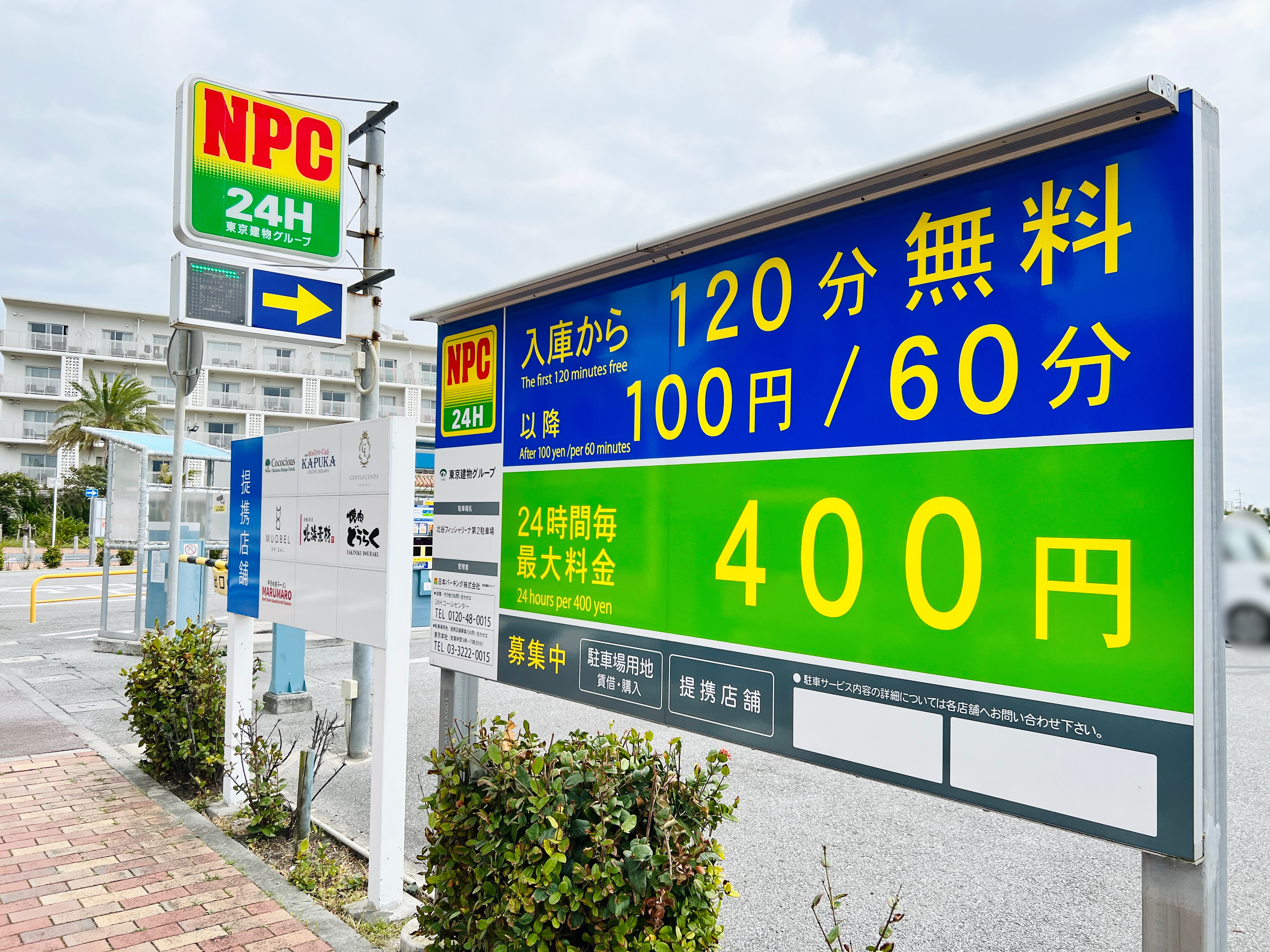 入庫から120分無料で24時間毎最大400円で利用可能なコインパーキングです。