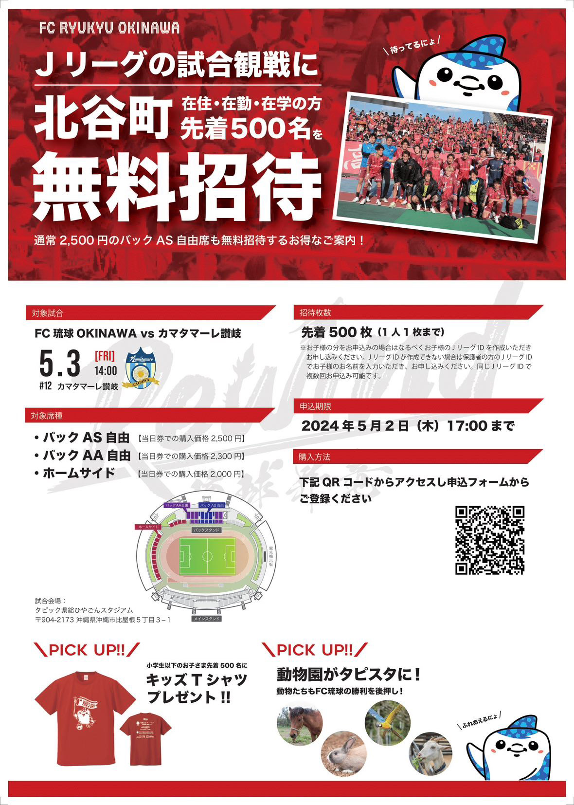 沖縄県北谷町に在住・在勤・在学の方は、2024年5月3日(金)に行われるJリーグ・FC琉球の試合を無料で観戦できますよー!