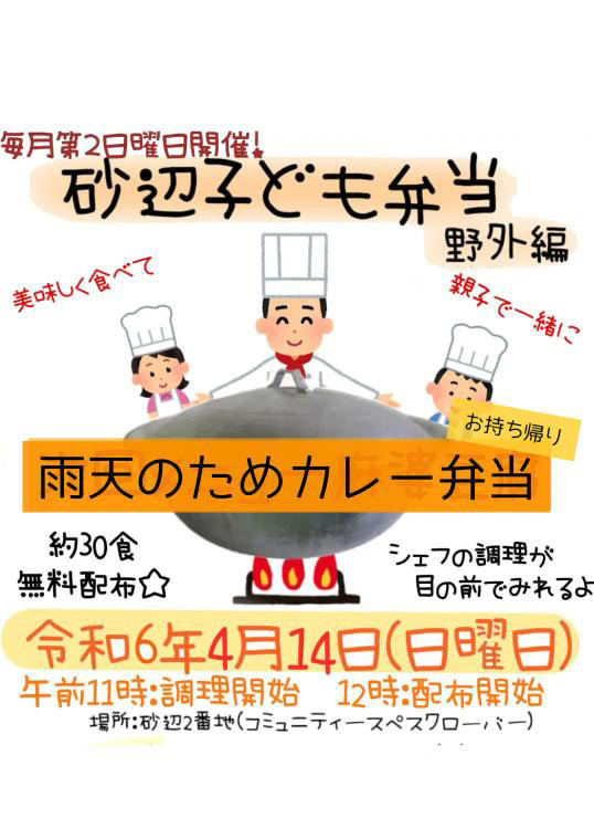 『砂辺子ども弁当』は、雨予報のため予定していた麻婆豆腐の屋外調理がなくなりカレー弁当配布になりました🍛