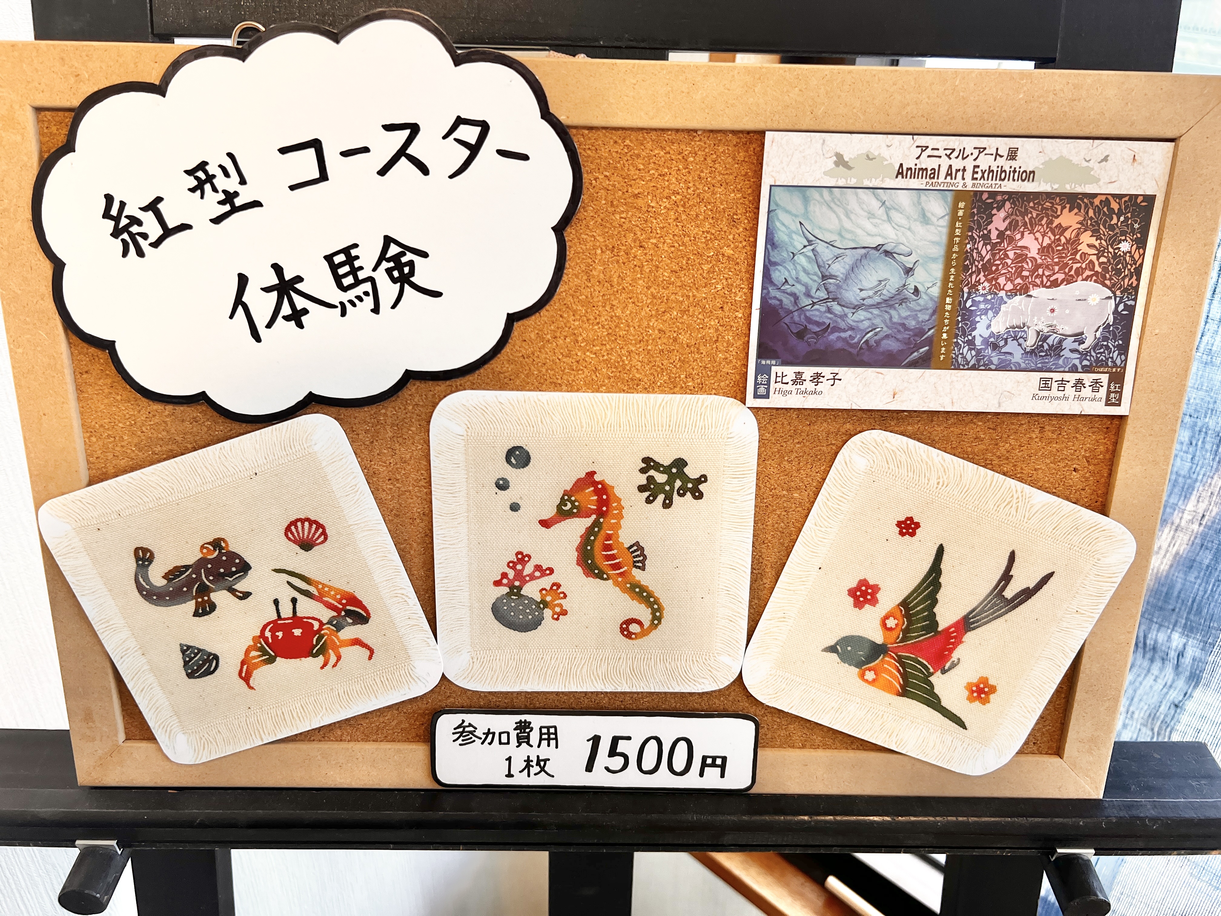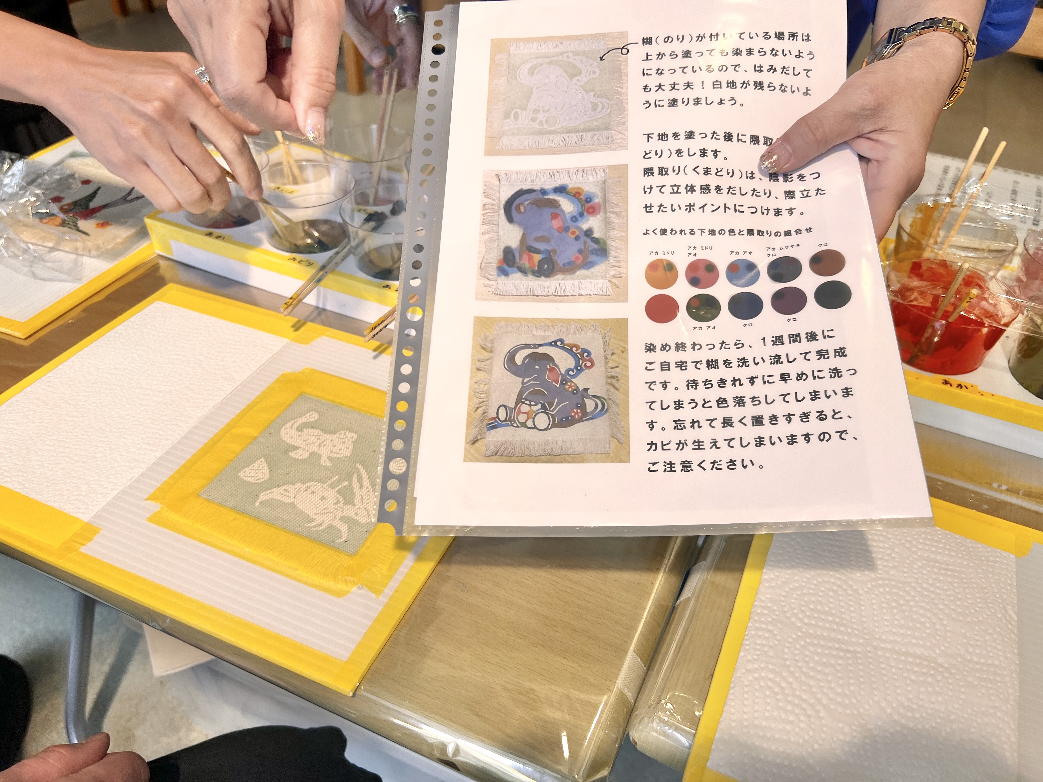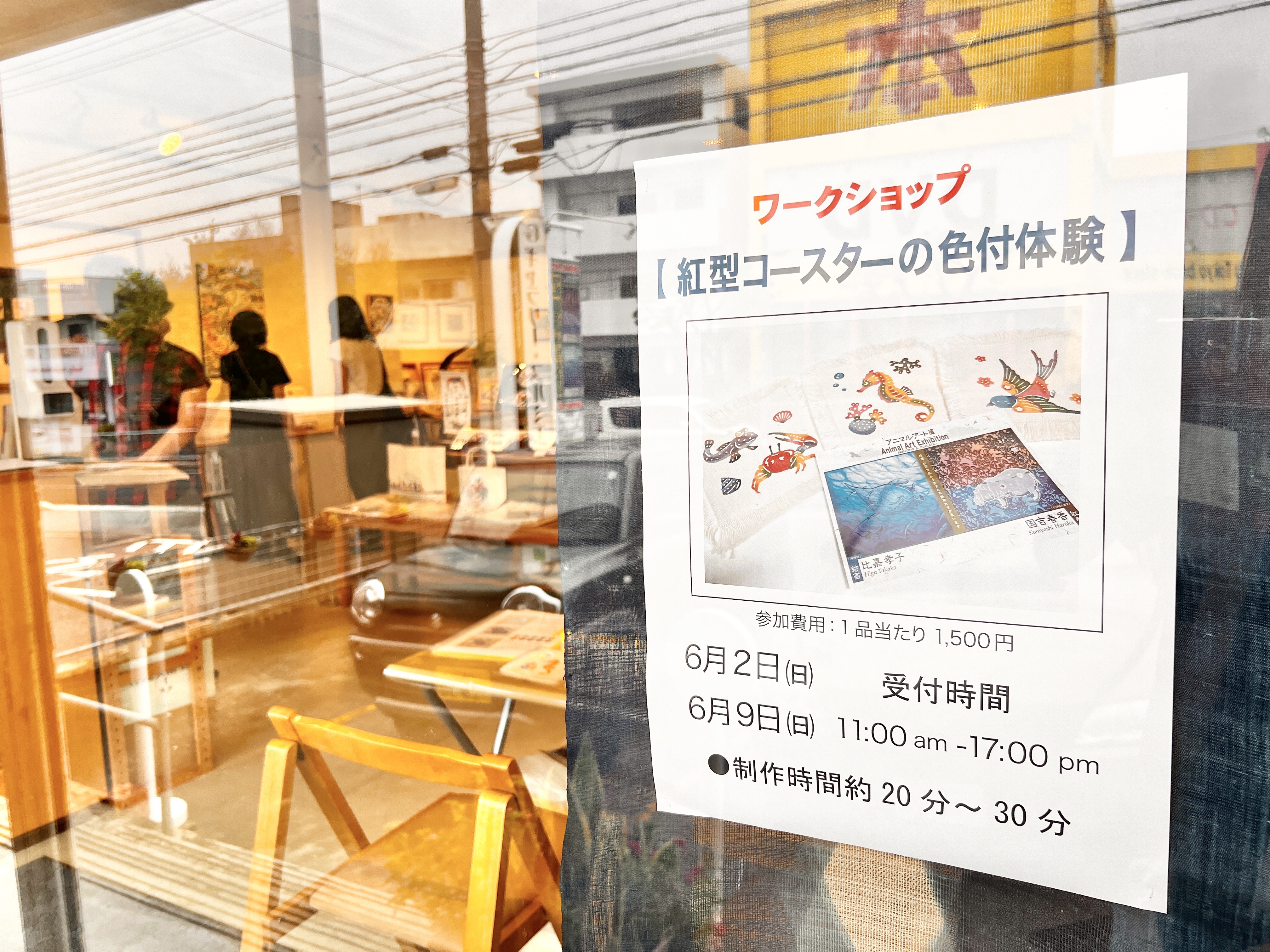 今回の展覧会期間中のうち2日間は、国吉さんのデザインによる紅型コースターの色付体験ができるワークショップも開催されました。