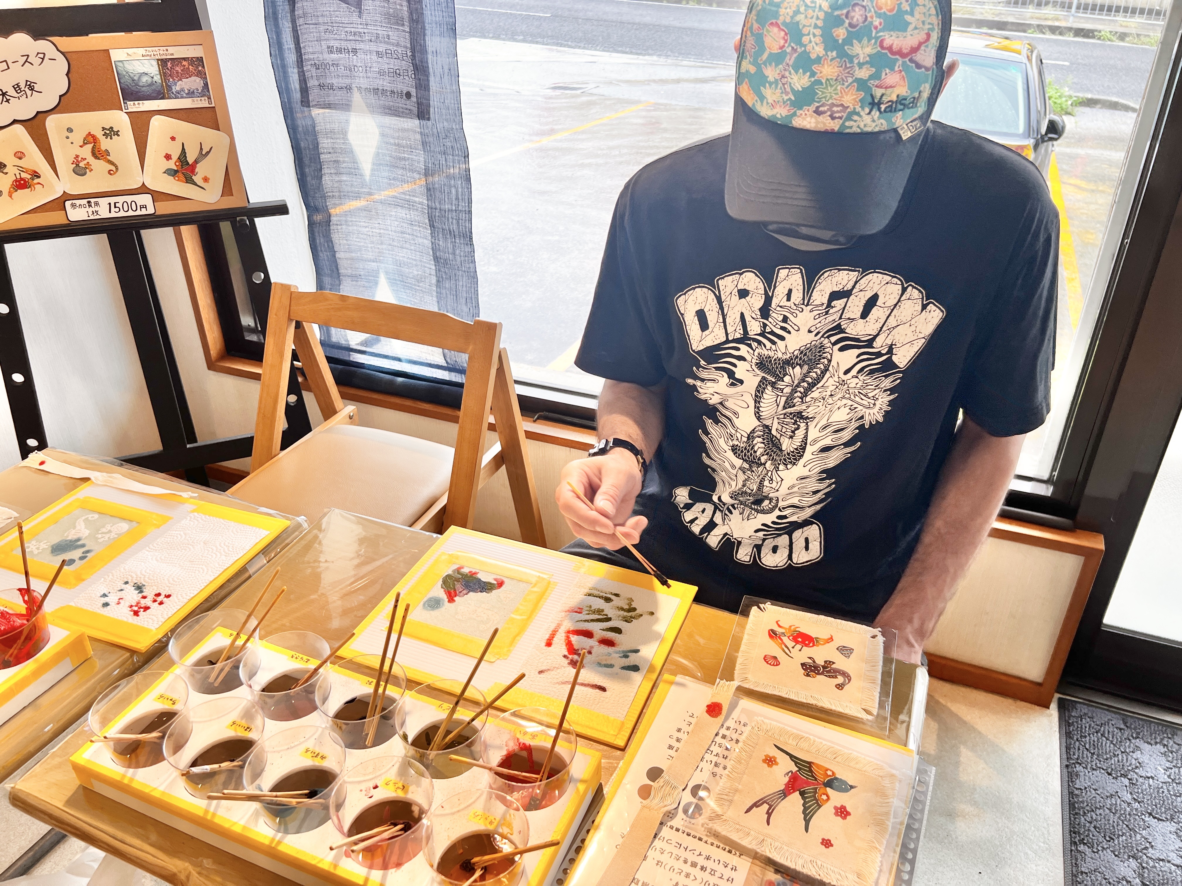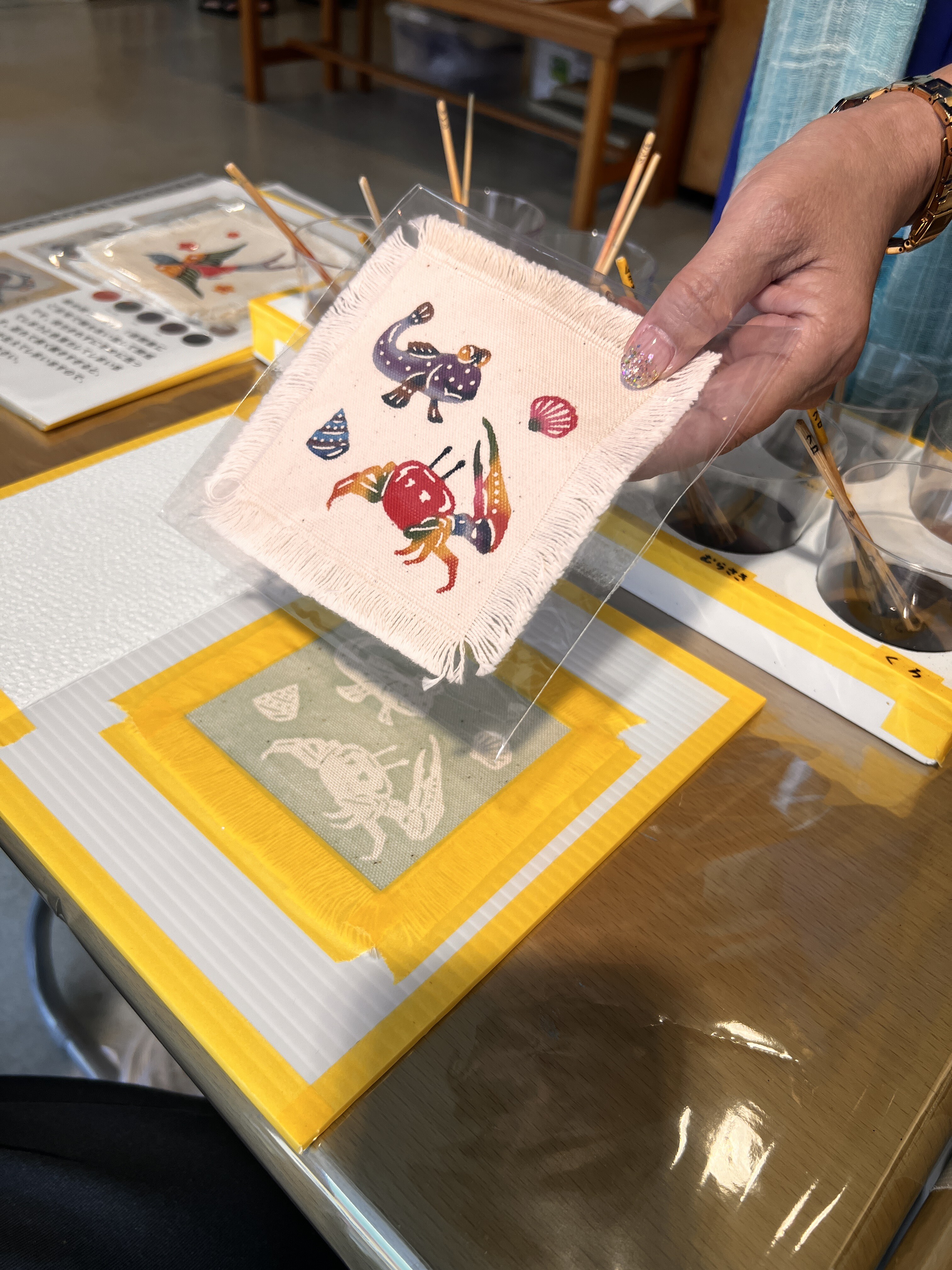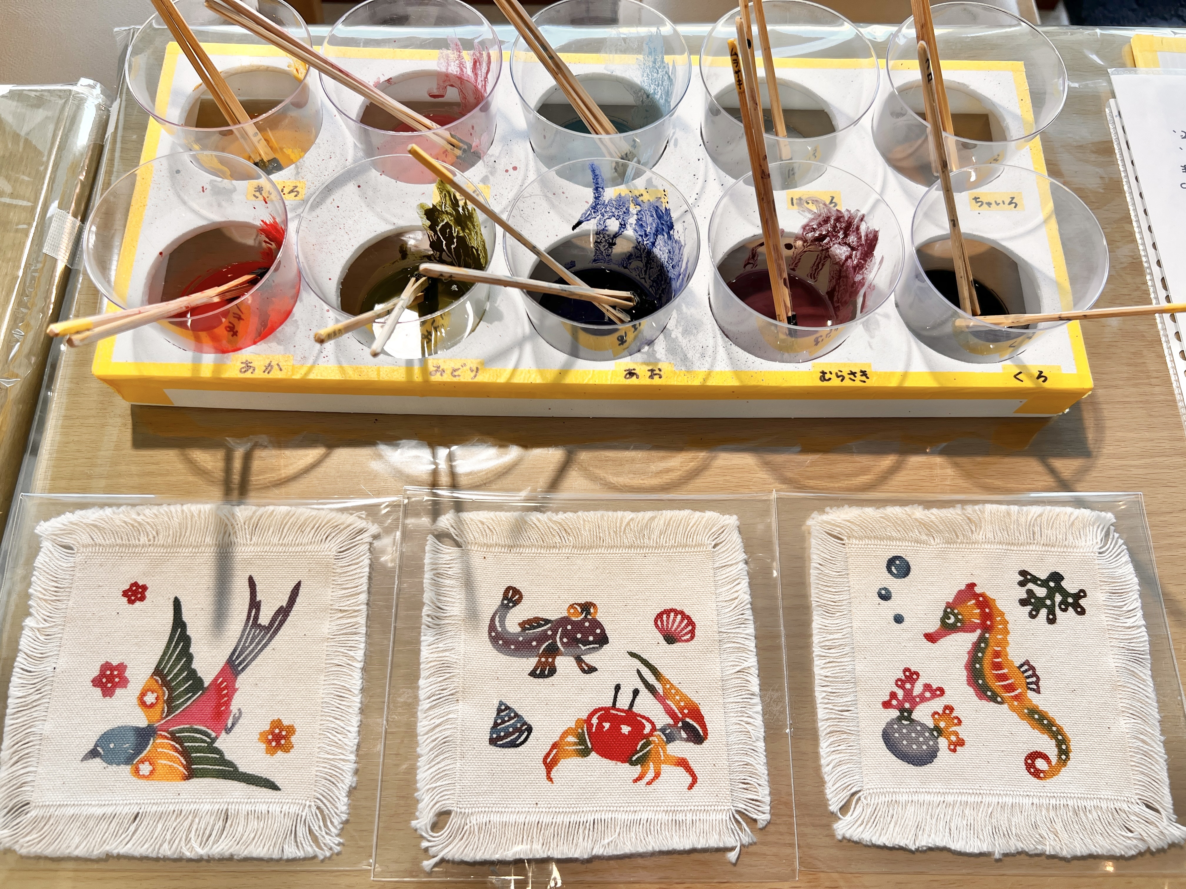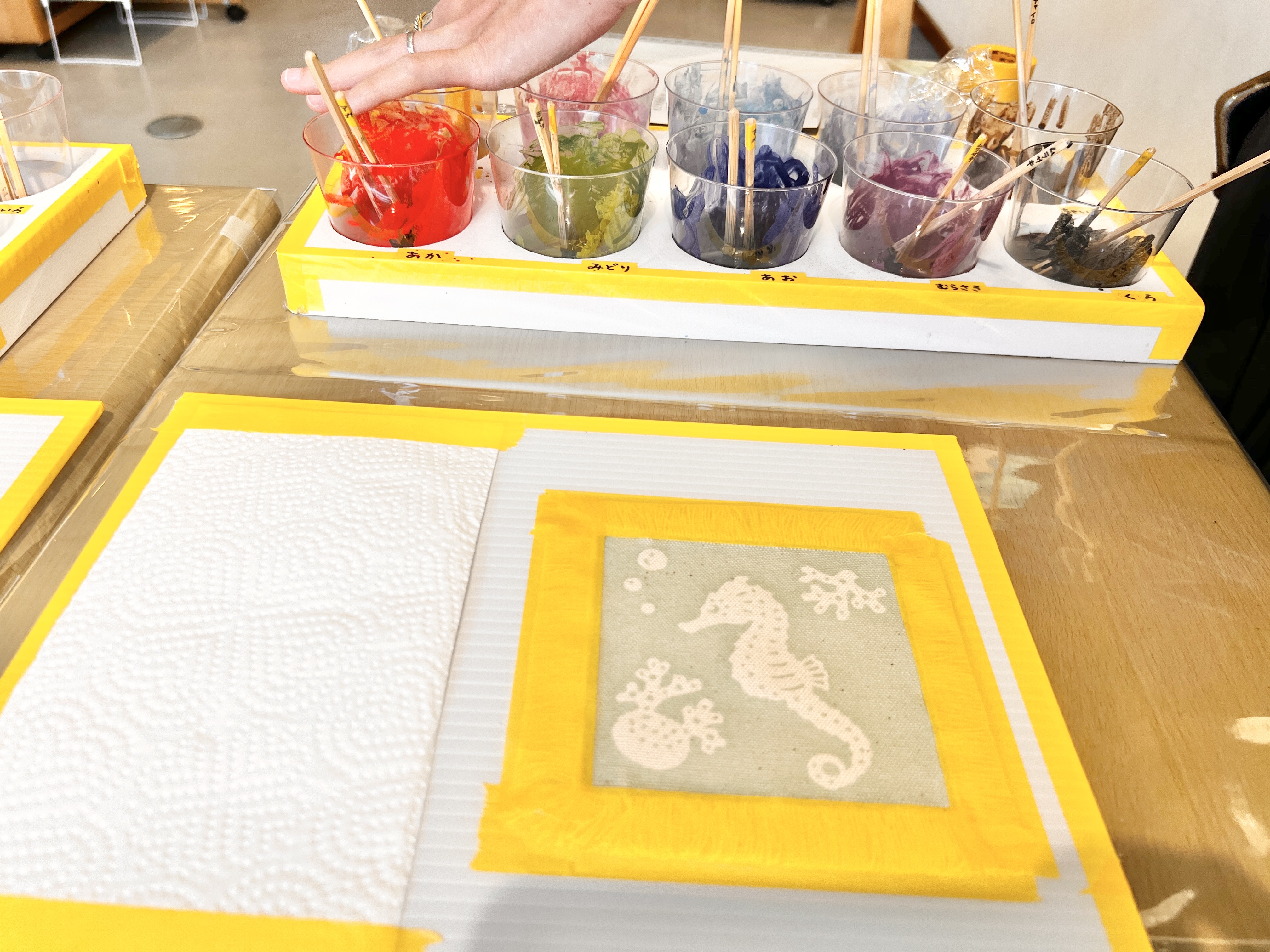 今回の展覧会期間中のうち2日間は、国吉さんのデザインによる紅型コースターの色付体験ができるワークショップも開催されました。