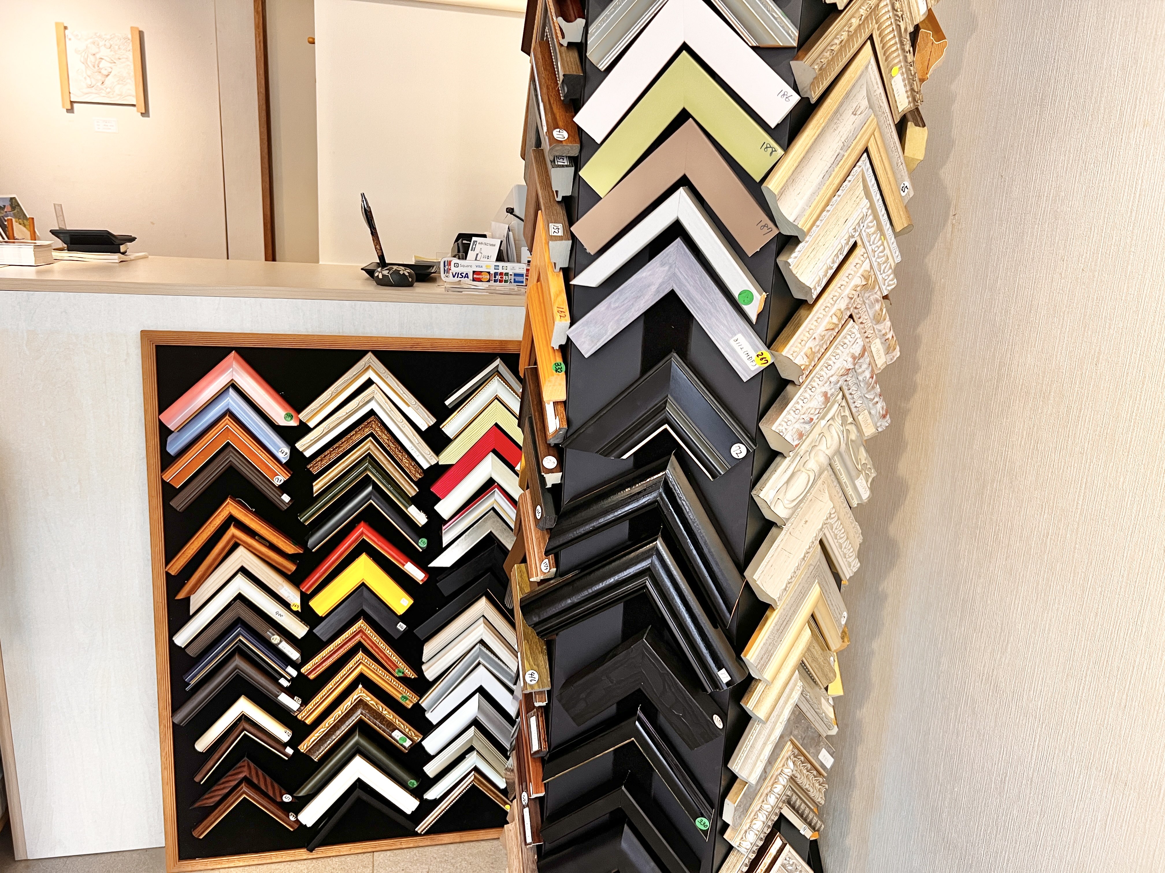 展覧会開催中は、額縁のサンプルが見えないようになっていましたが、代表の喜友名さんに見せていただきました。