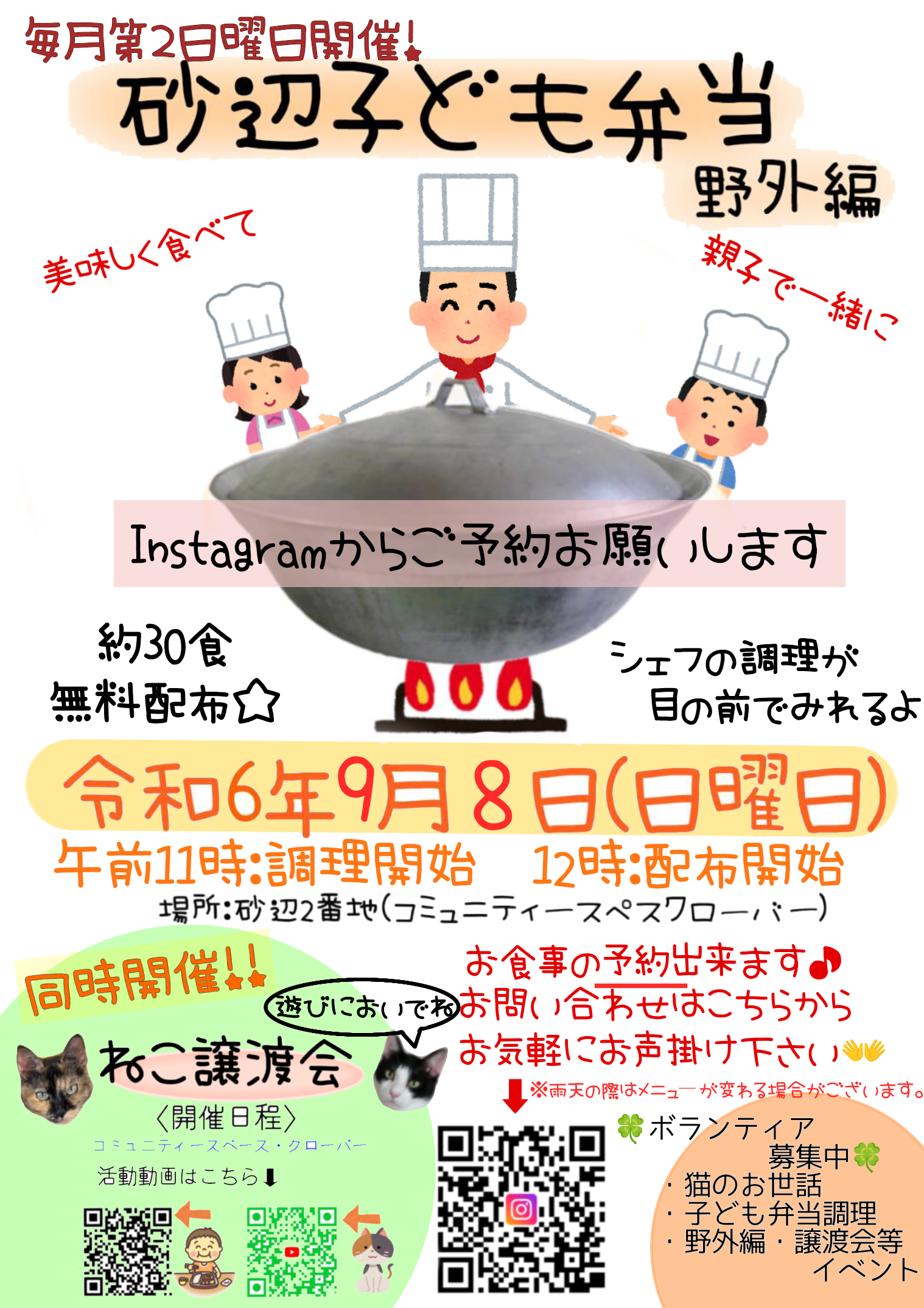 北谷町砂辺のコミュニティスペース・クローバーにて『砂辺子ども弁当』が、2024年9月8日(日)に開催されますよー!