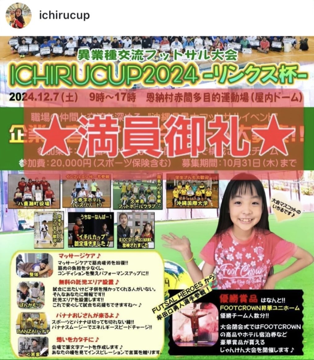 沖縄県最大の異業種交流フットサル大会『ICHIRU CUP 2024 -リンクス杯-』が、2024年12月7日(土)に恩納村の赤間多目的運動場にて開催されますよー!