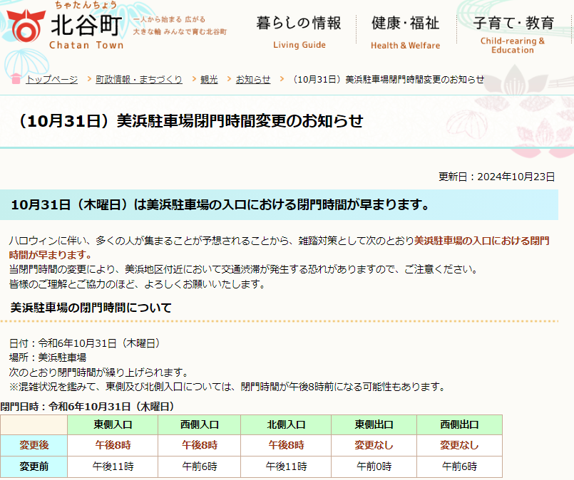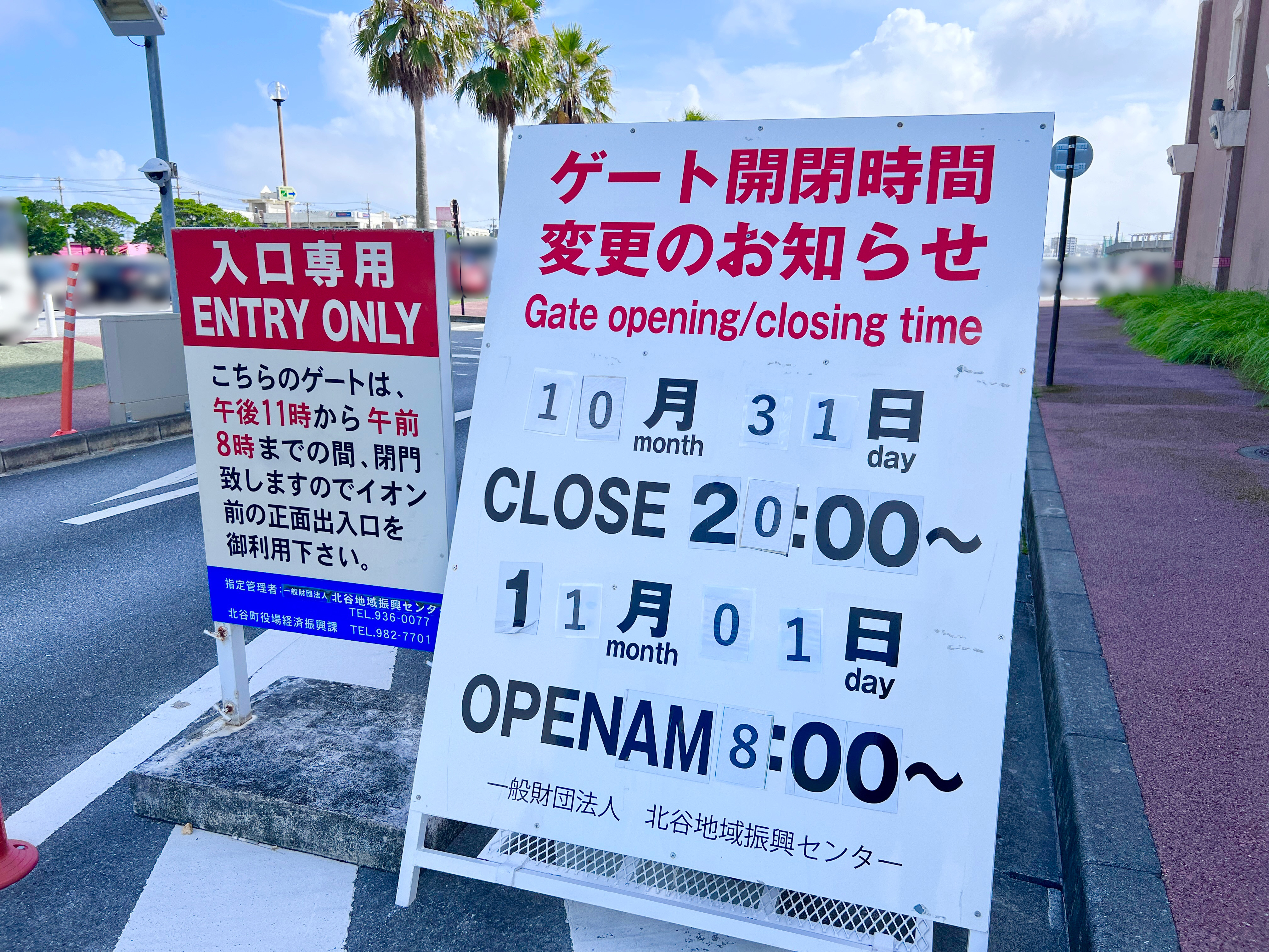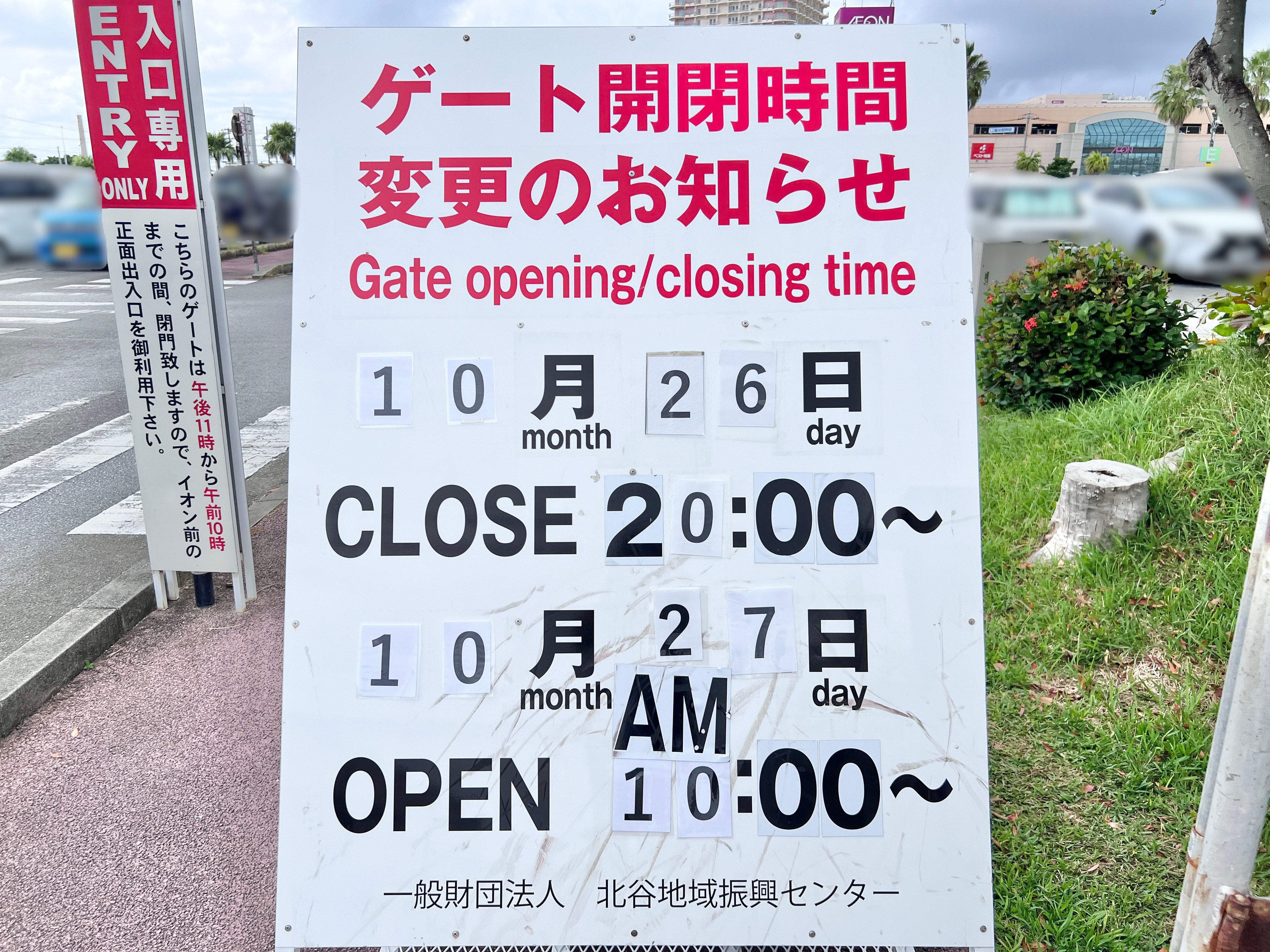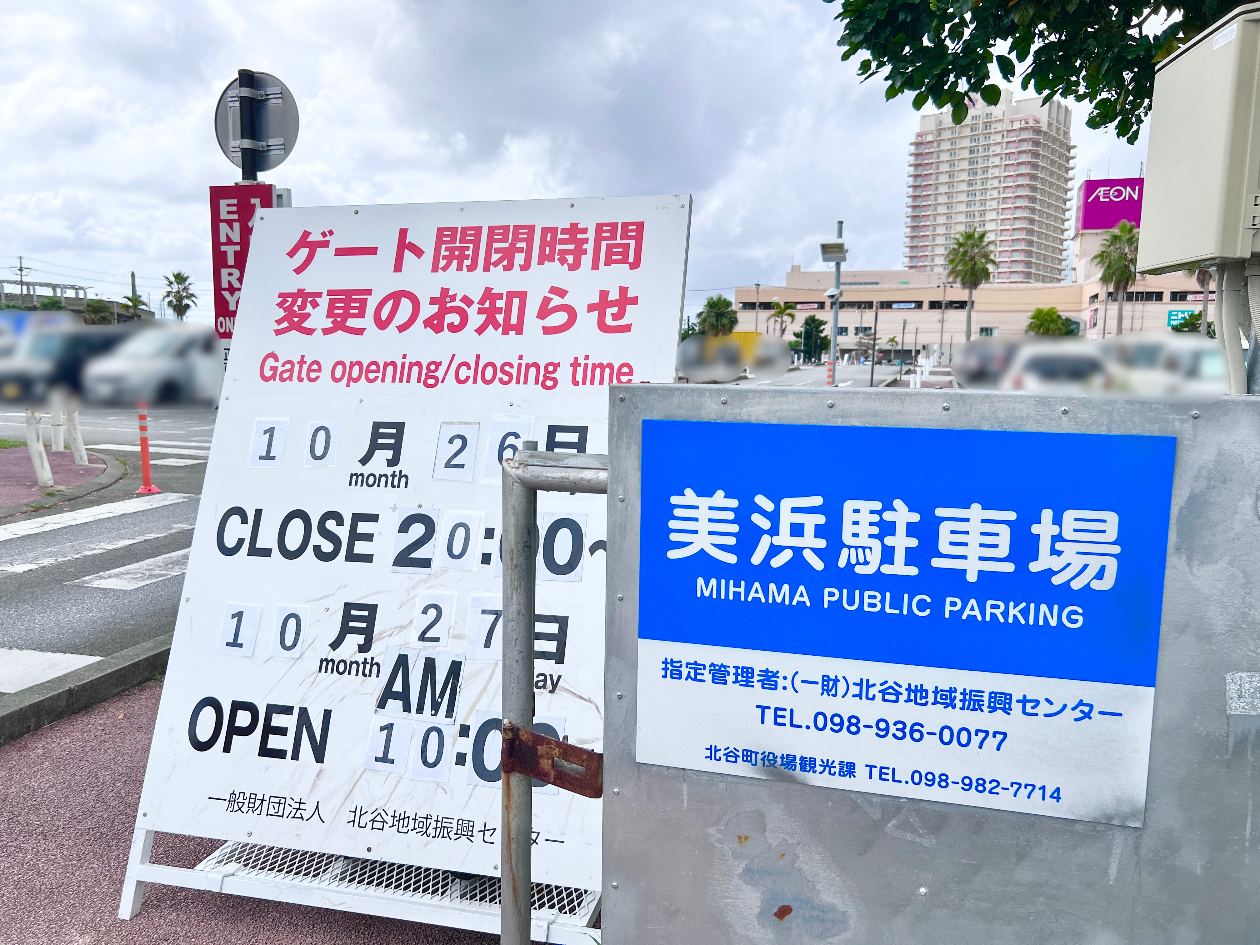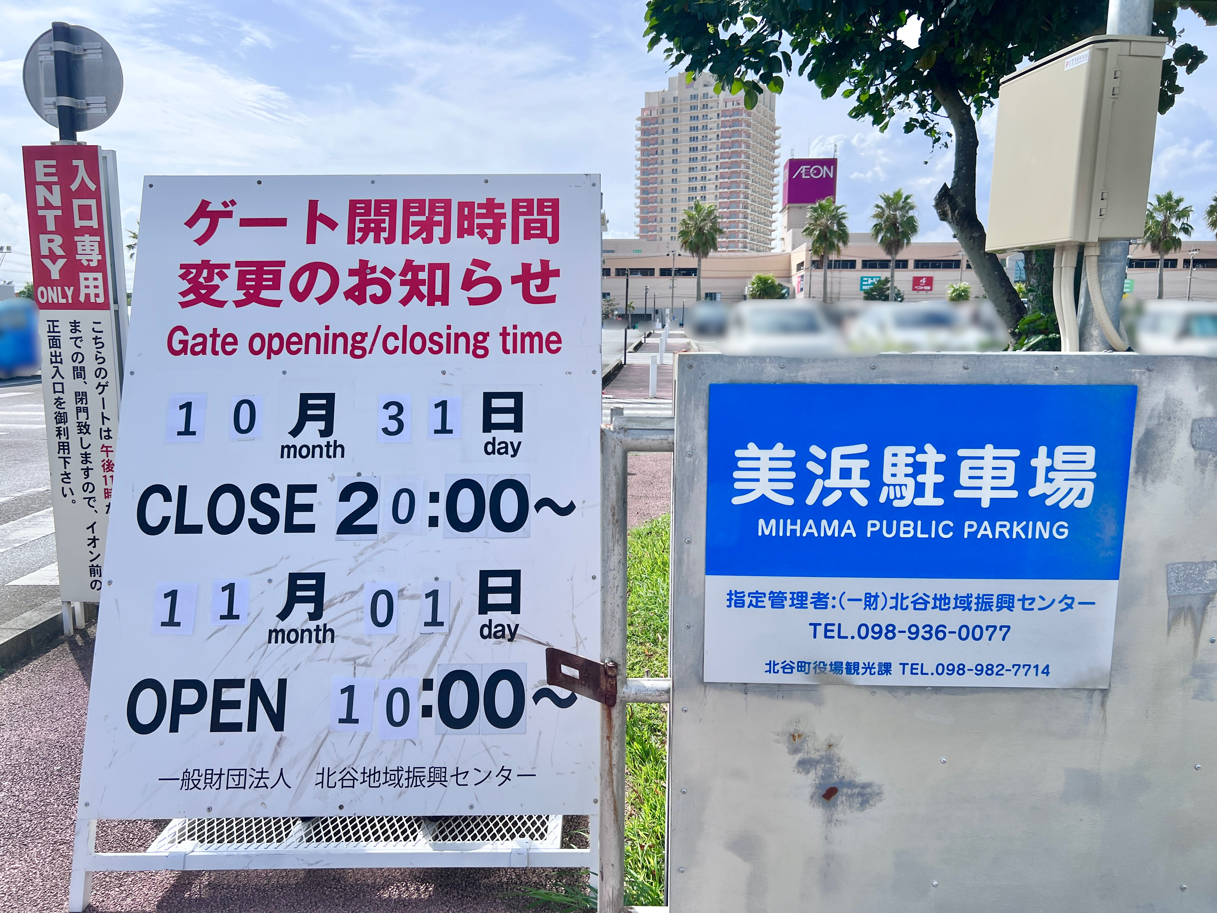 北谷町美浜にある北谷町営「美浜駐車場」の入口の閉門時間が、2024年10月26日(土)・31日(木)は変更になりますよー!