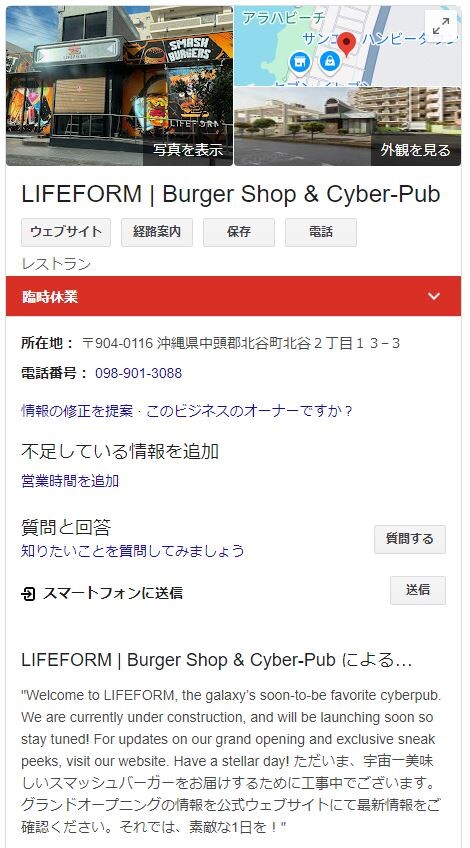 サンエーハンビータウン向かいに『LIFEFORM Burger Shop & Cyber-Pub』がオープンするみたい☆