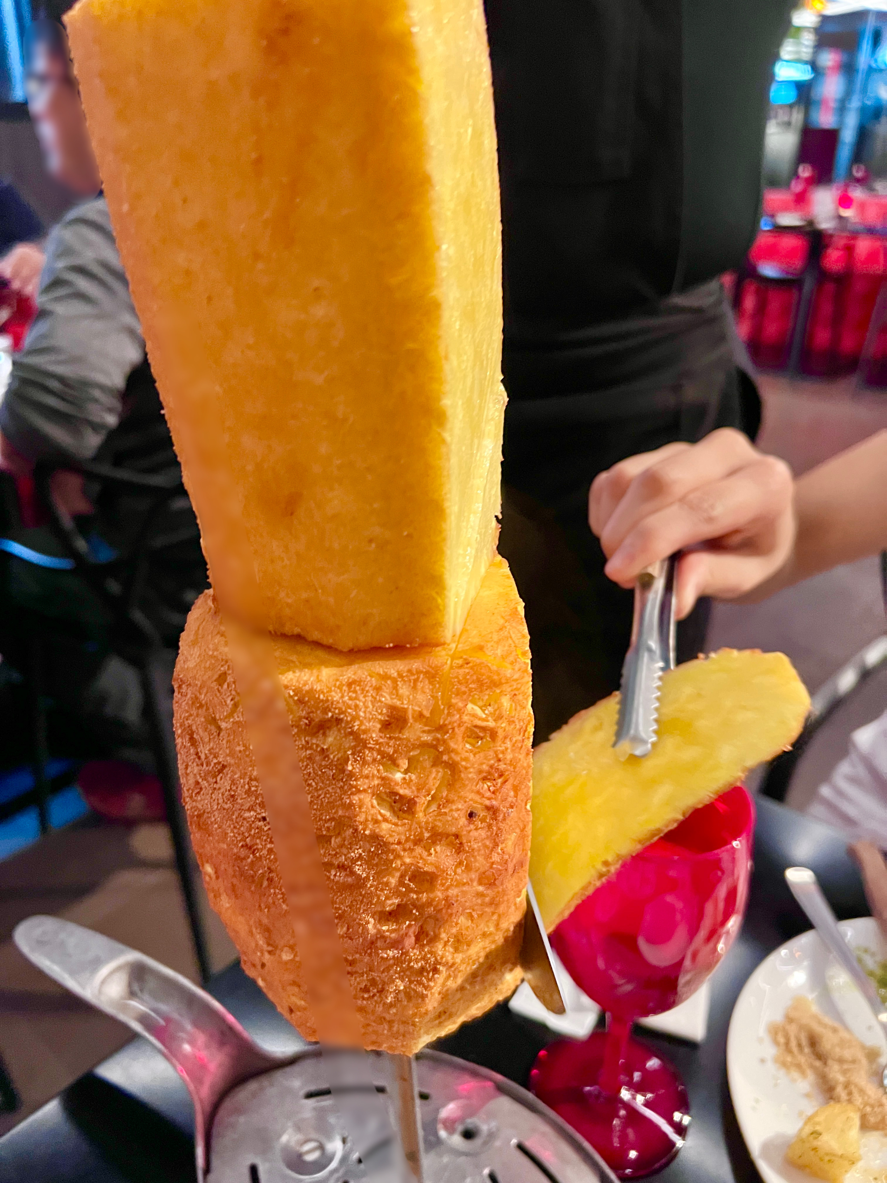 ちなみにスタッフの方がナイフで切り分けていただく際に、1人1本ずつあるトングを使って自分のお皿へ運びます。