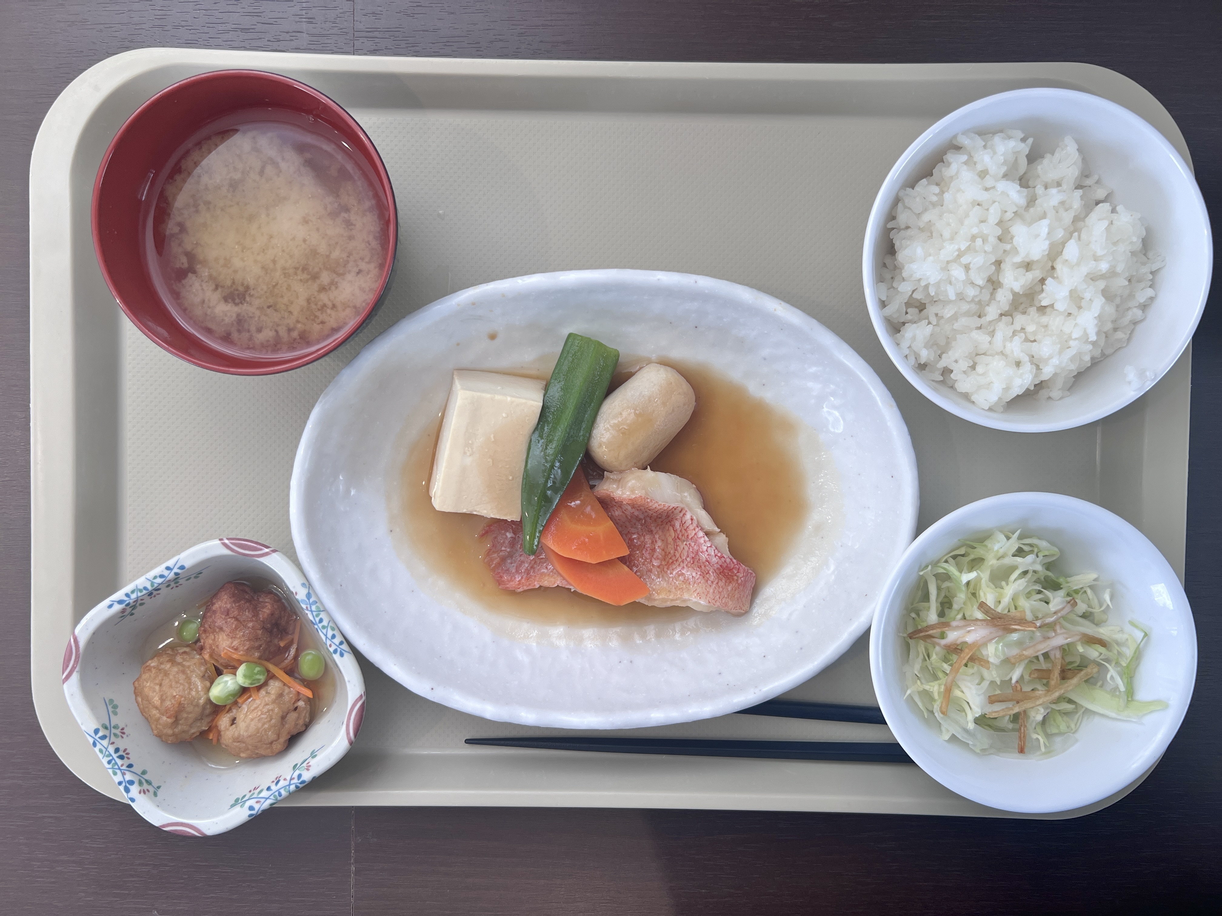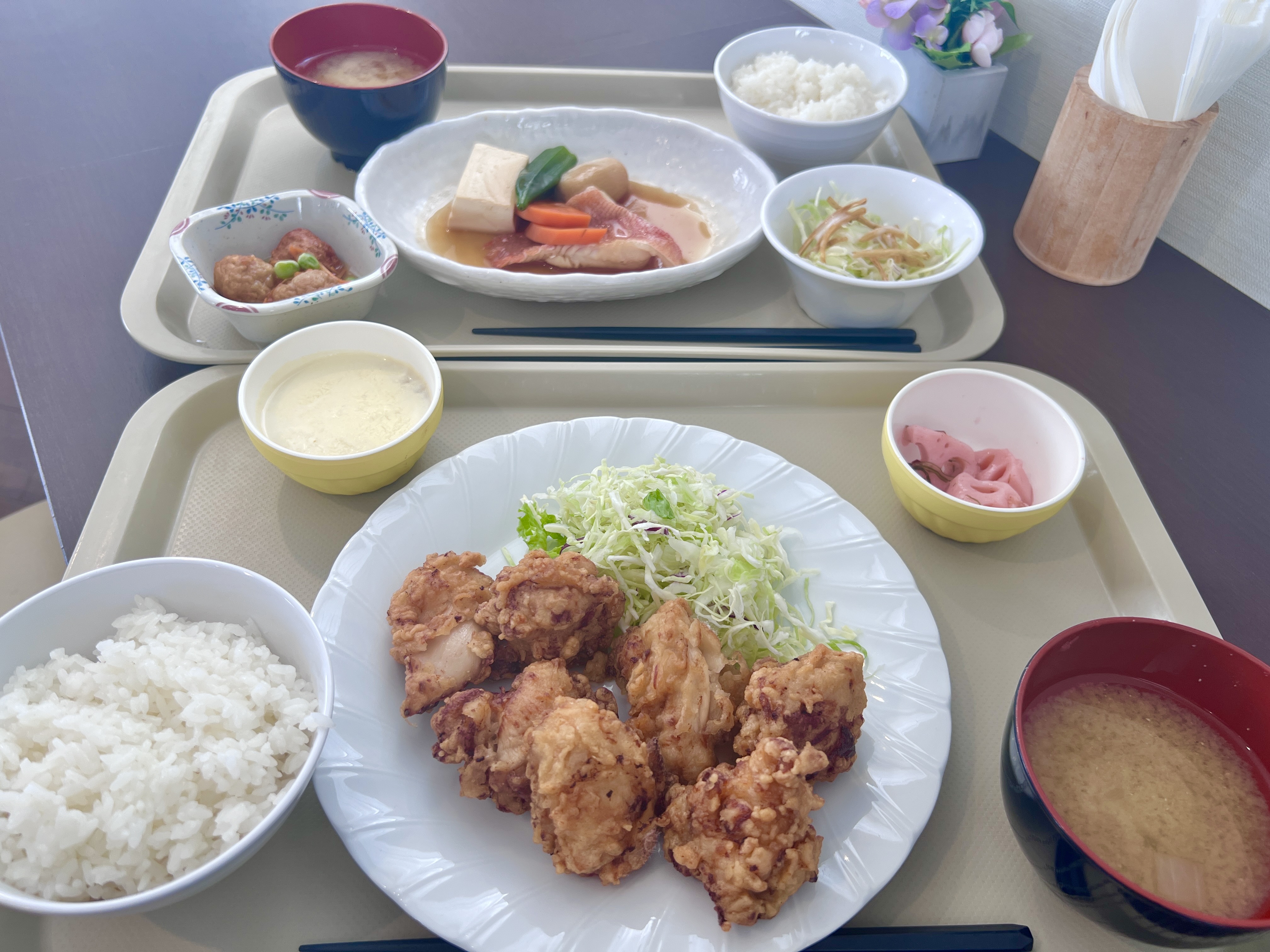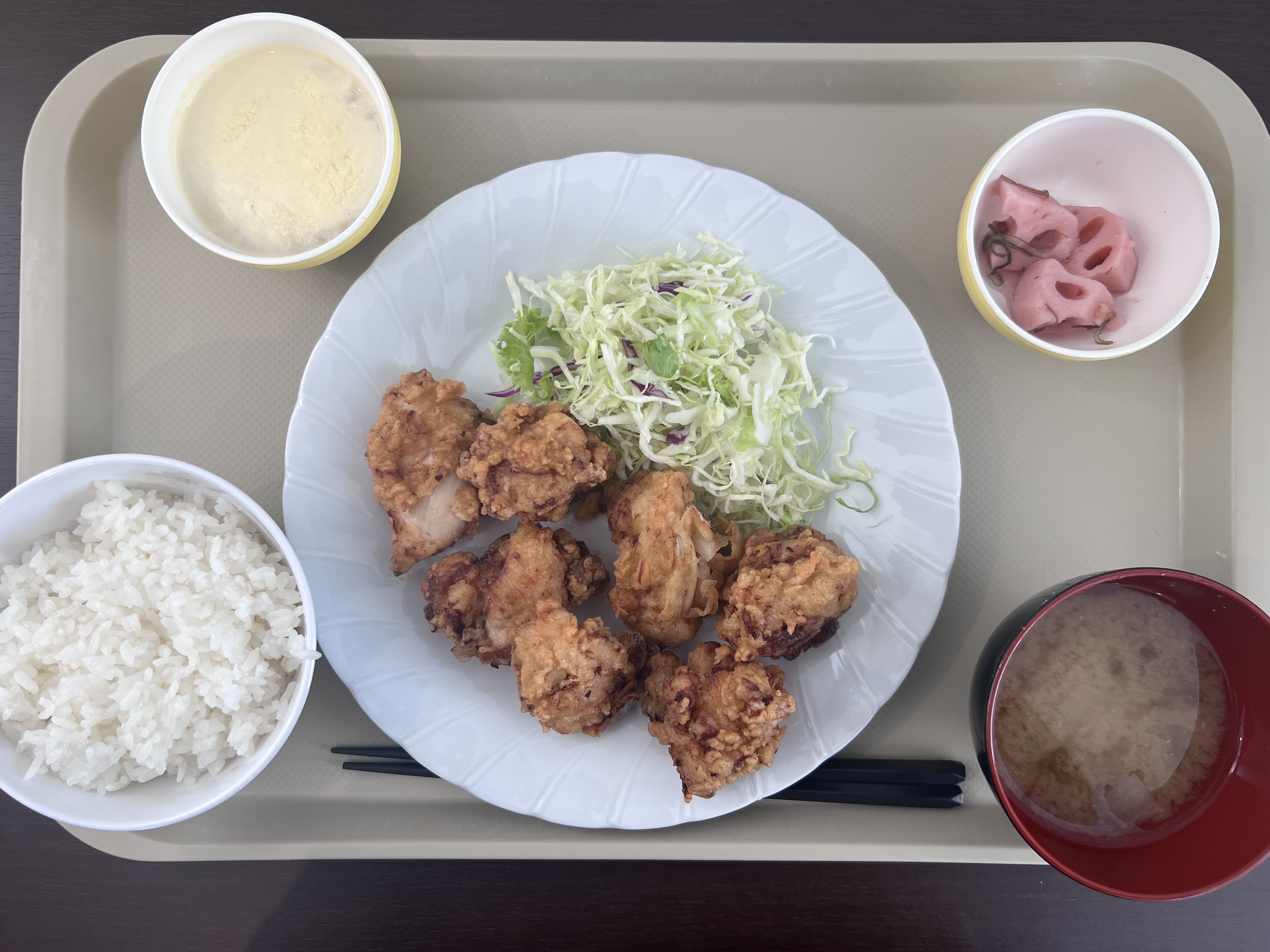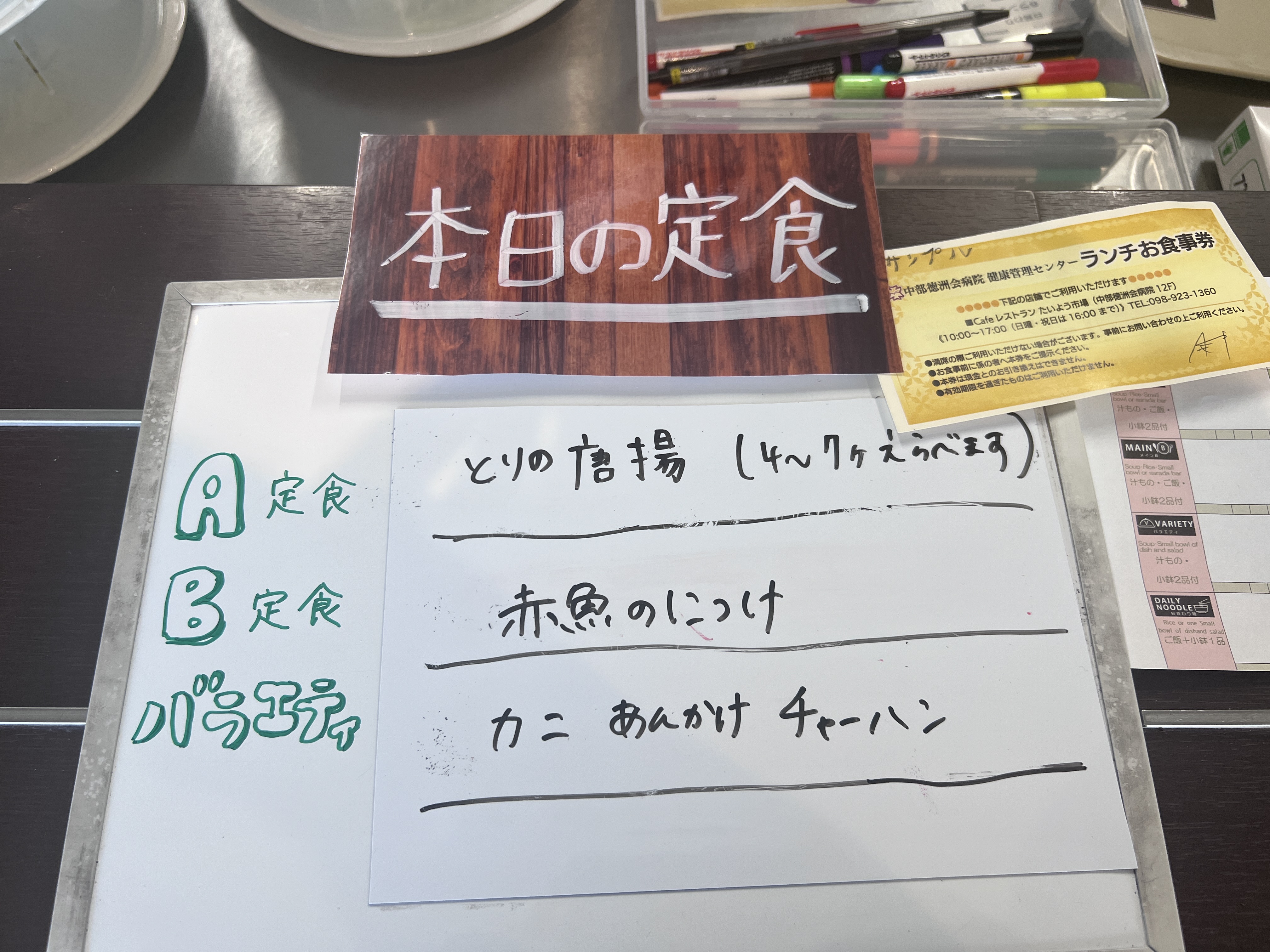 11月6日(水)の「本日の定食」は、A定食はとりの唐揚、B定食は赤魚のにつけ、バラエティはカニあんかけチャーハンでした。
