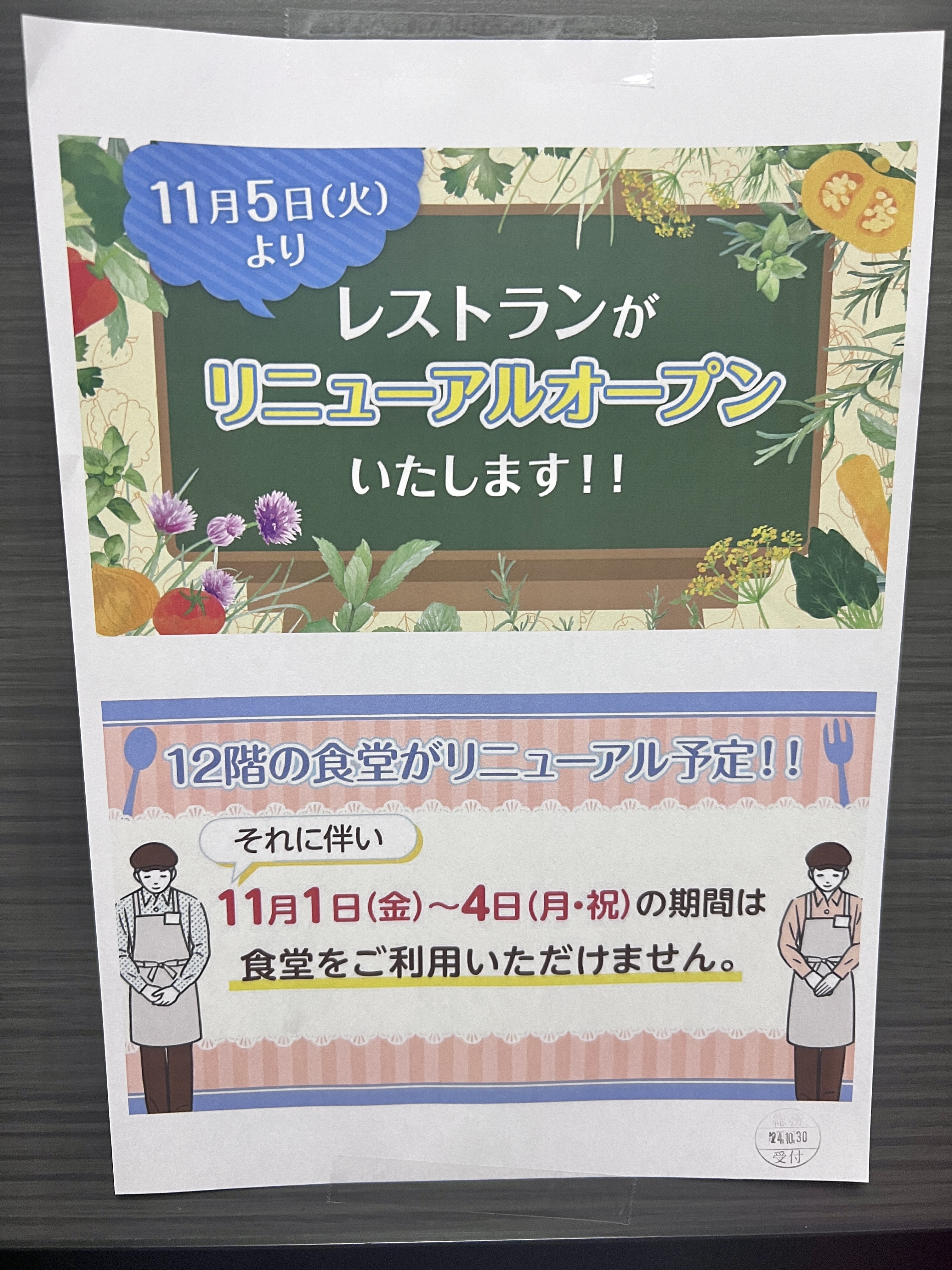 エレベーター内にもレストランのリニューアル情報が掲示されていましたよー!