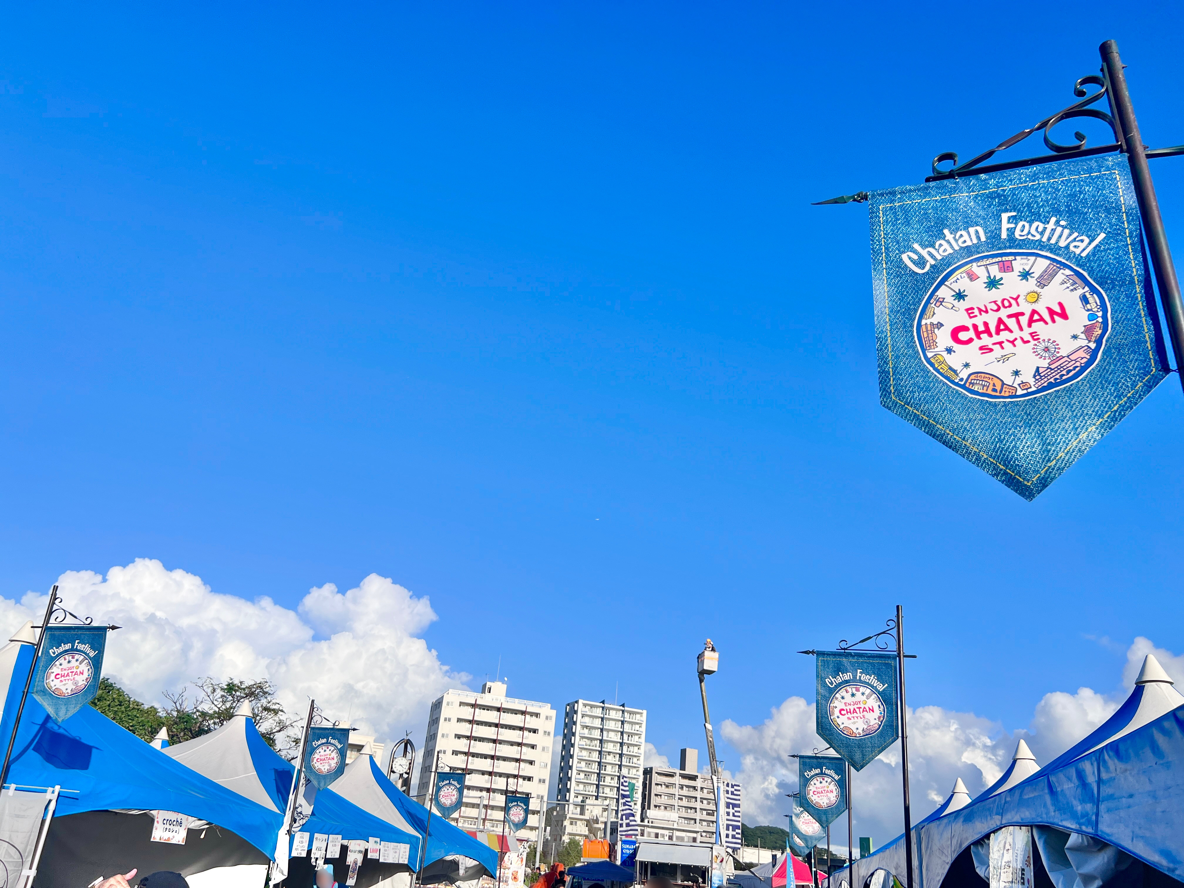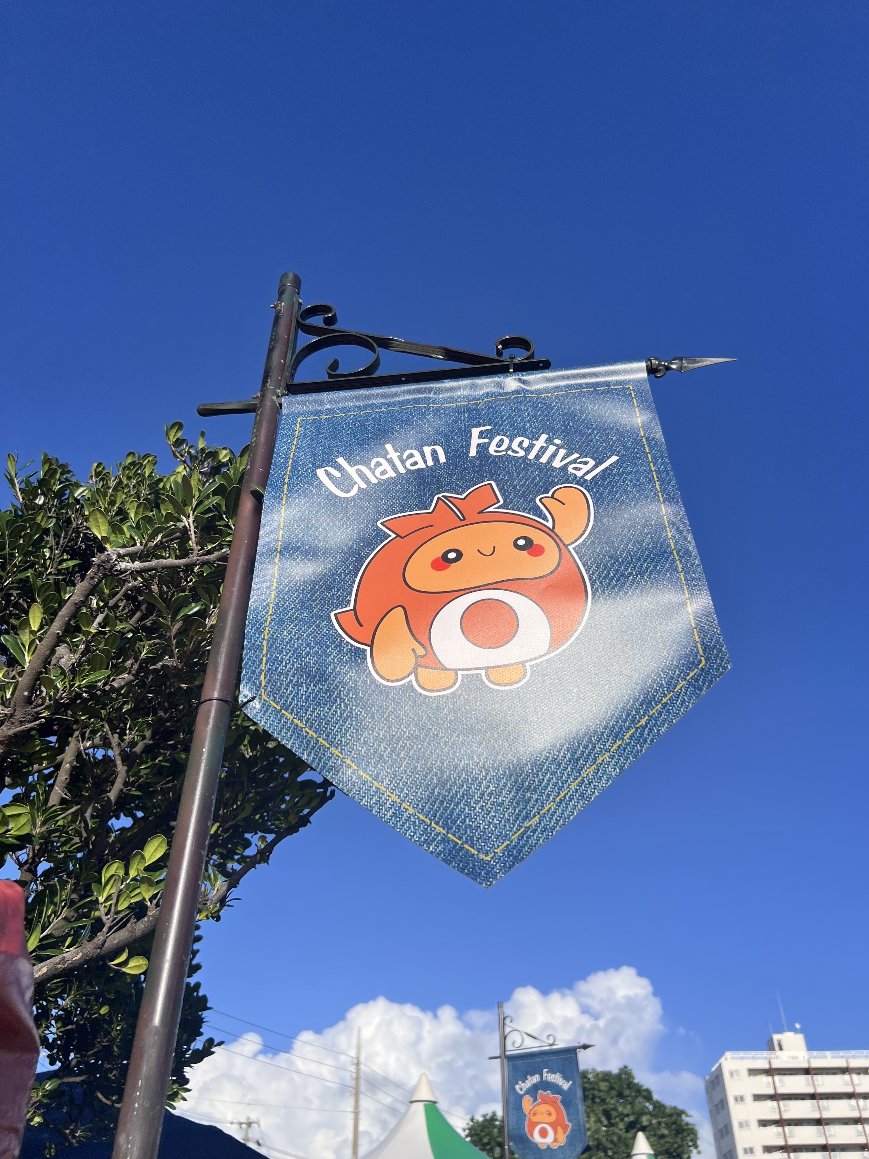 デニム調のデザイン「Chatan Festival」と記載された旗がかわいらしかったです。