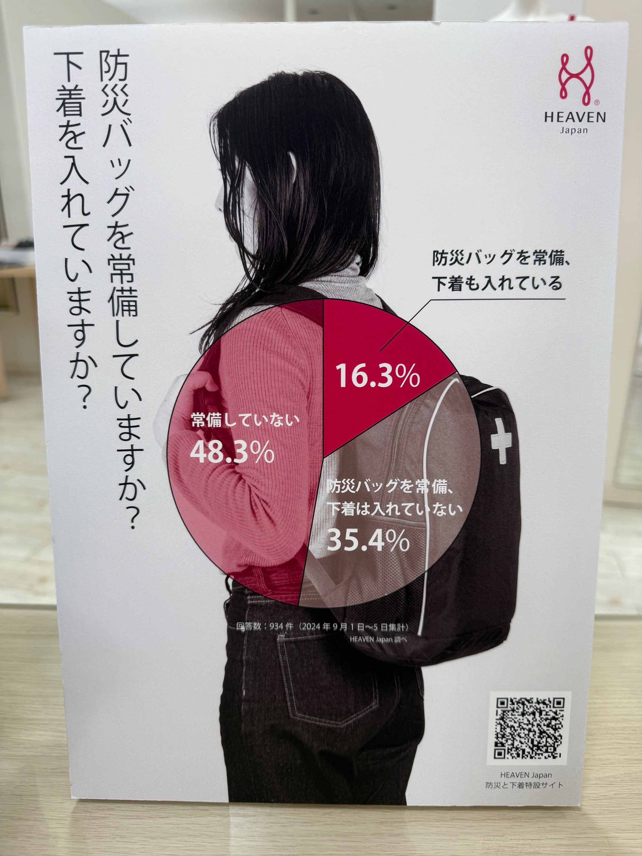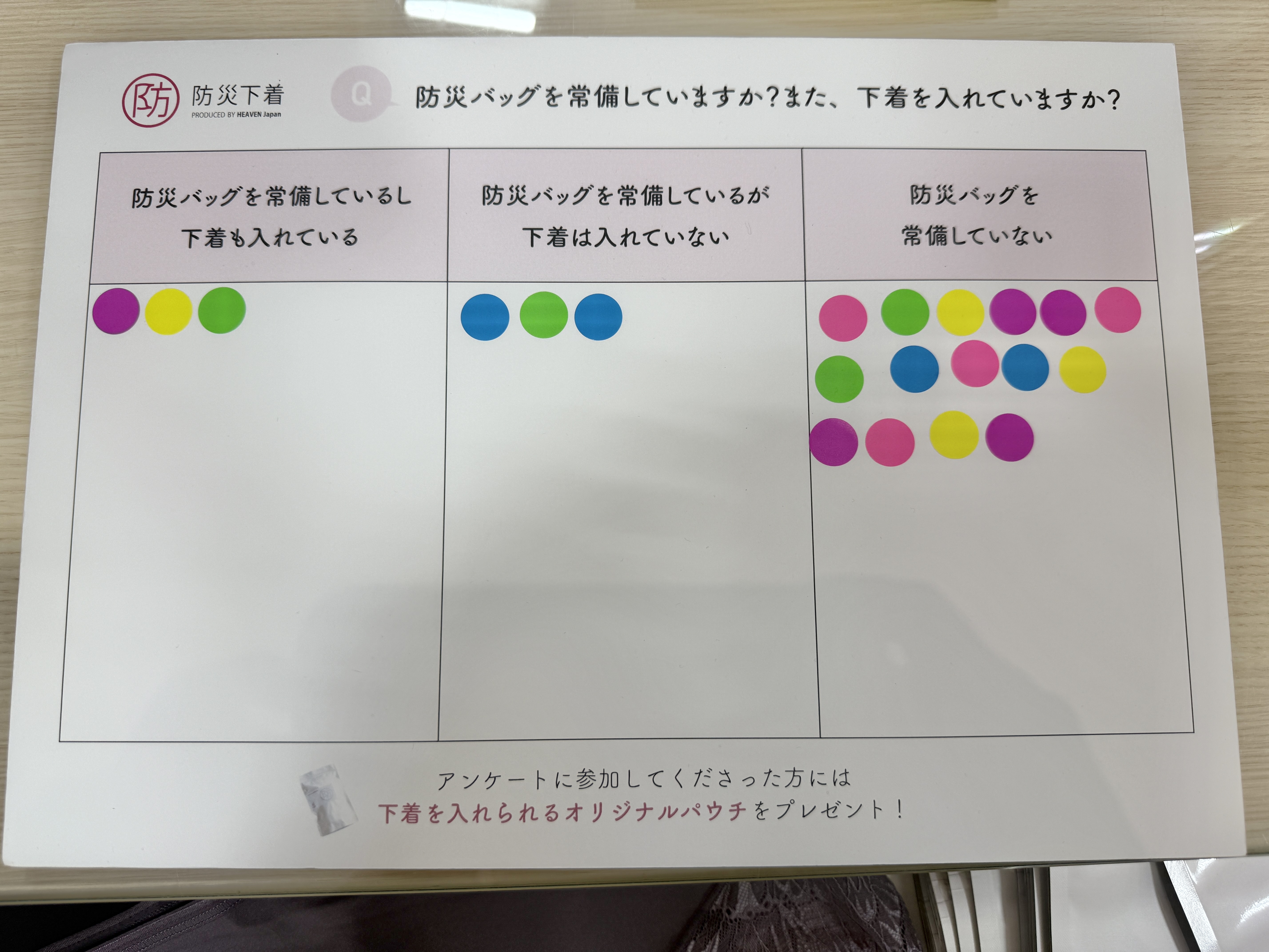 来場者の方へ向けて「防災バッグを常備しているか、下着をいれているか」というアンケートがあります。