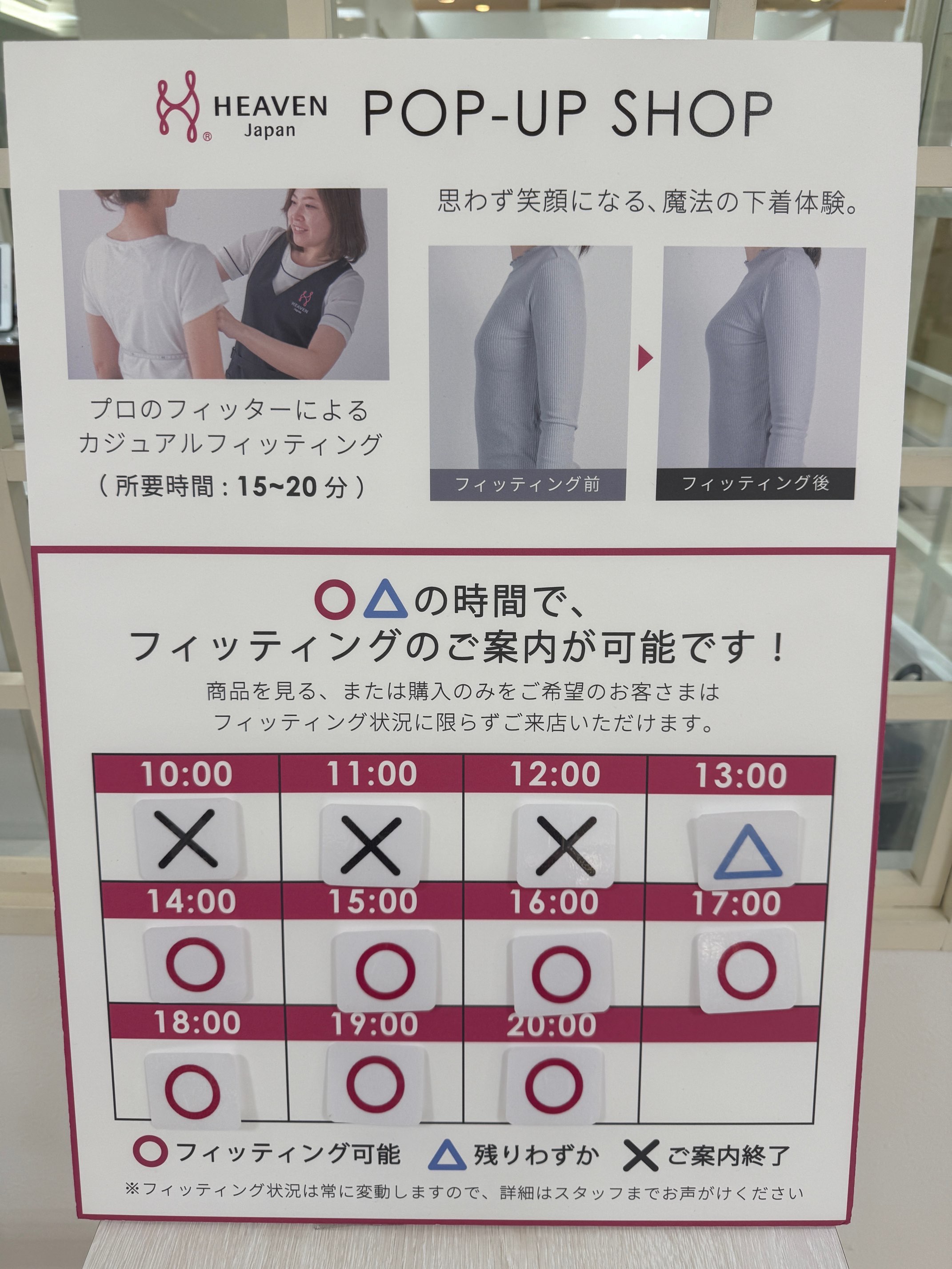 フィッテイングが可能な時間帯も分かりやすく案内がでていました。