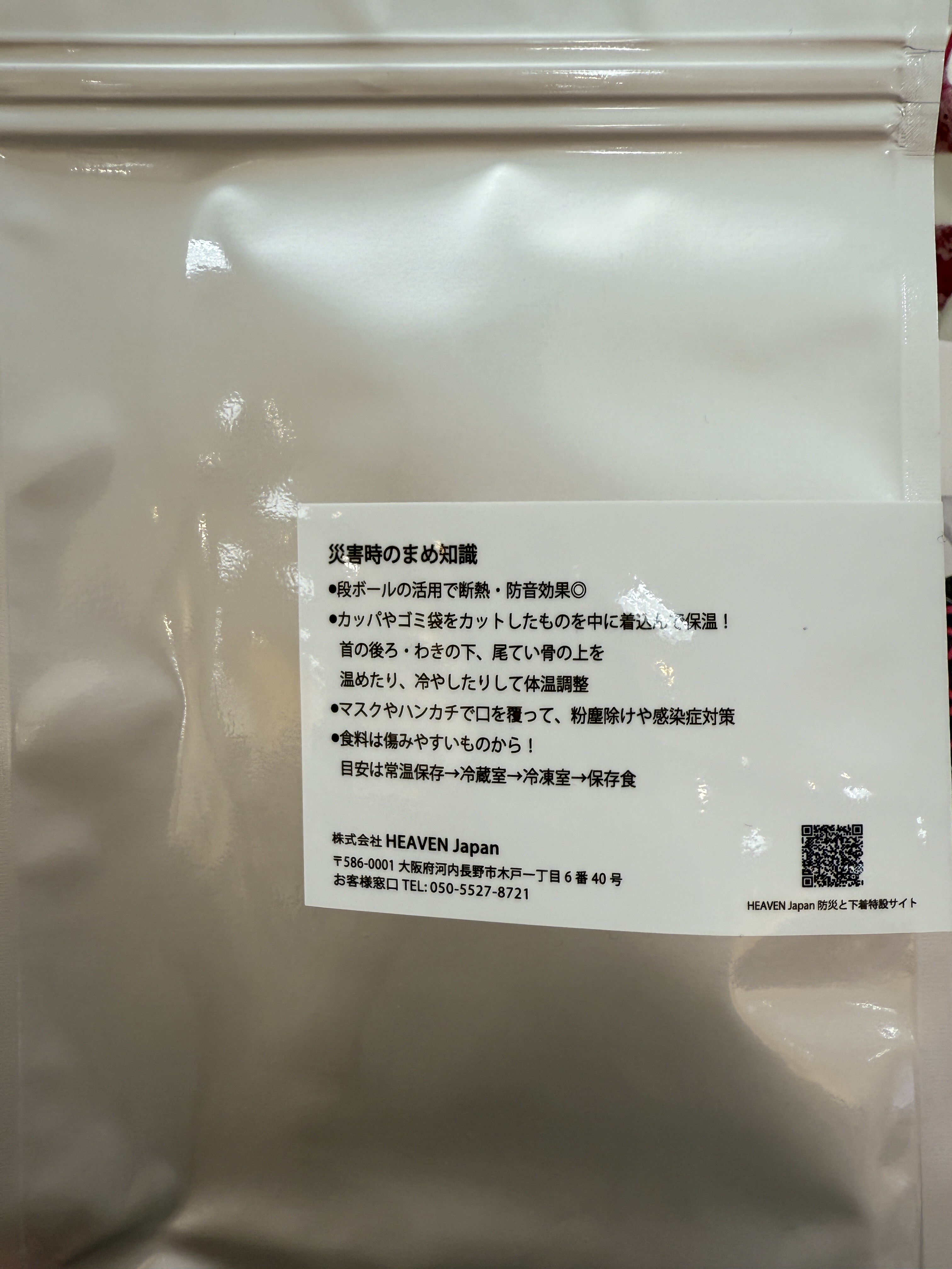 袋の裏には、「災害時のまめ知識」が記載されています。