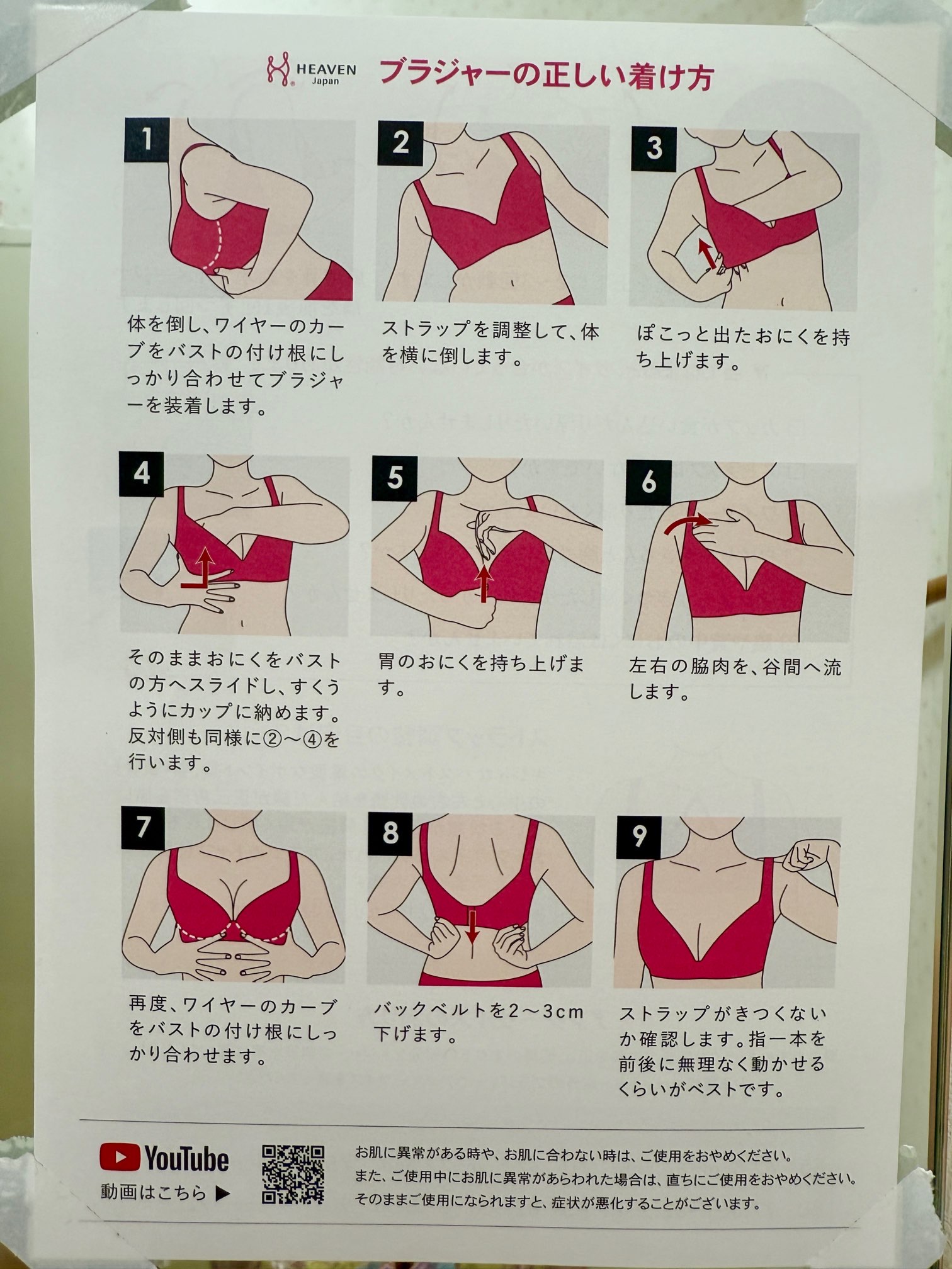 試着室内には、「ブラジャーの正しい着け方」が掲示されています。