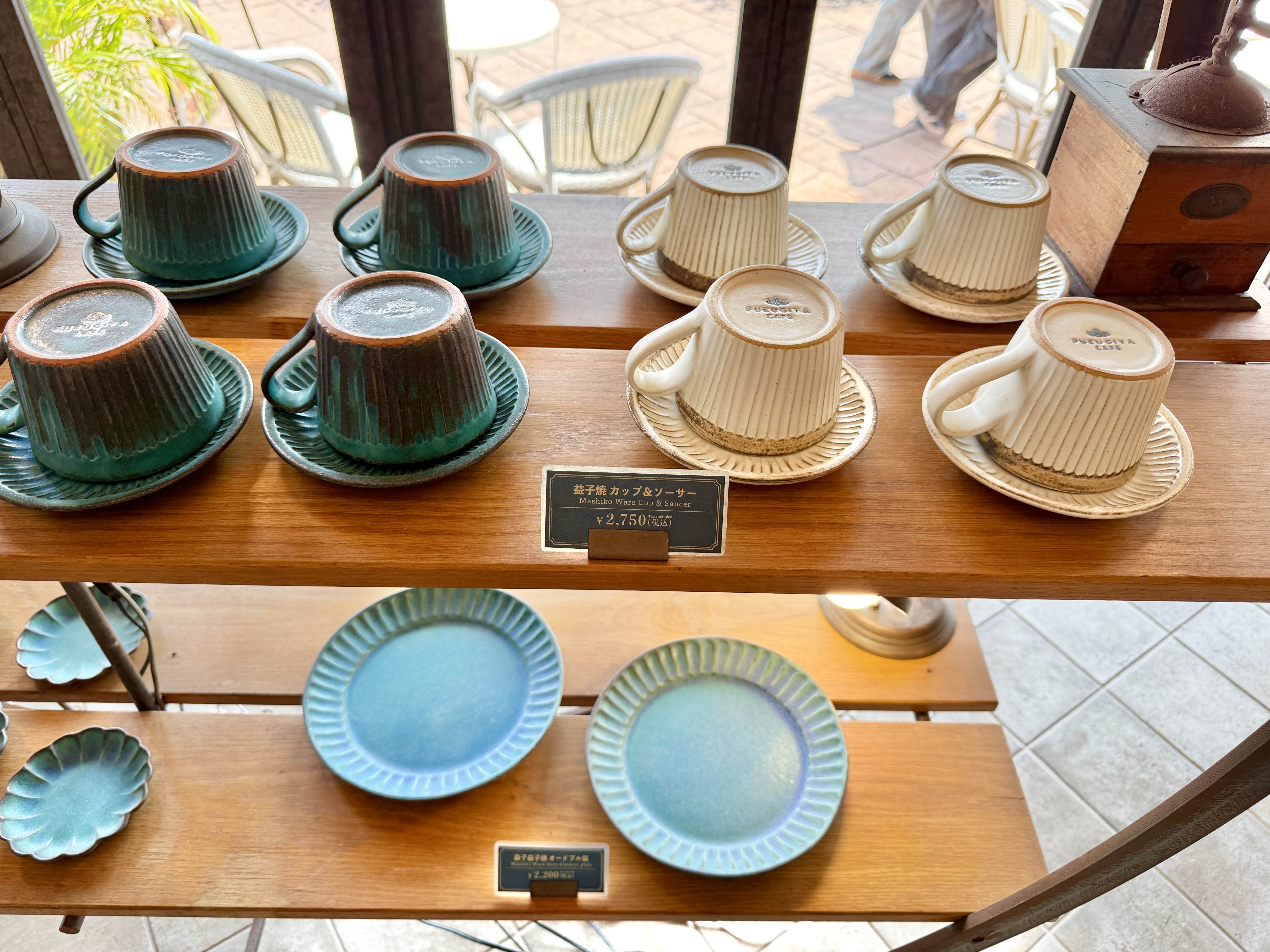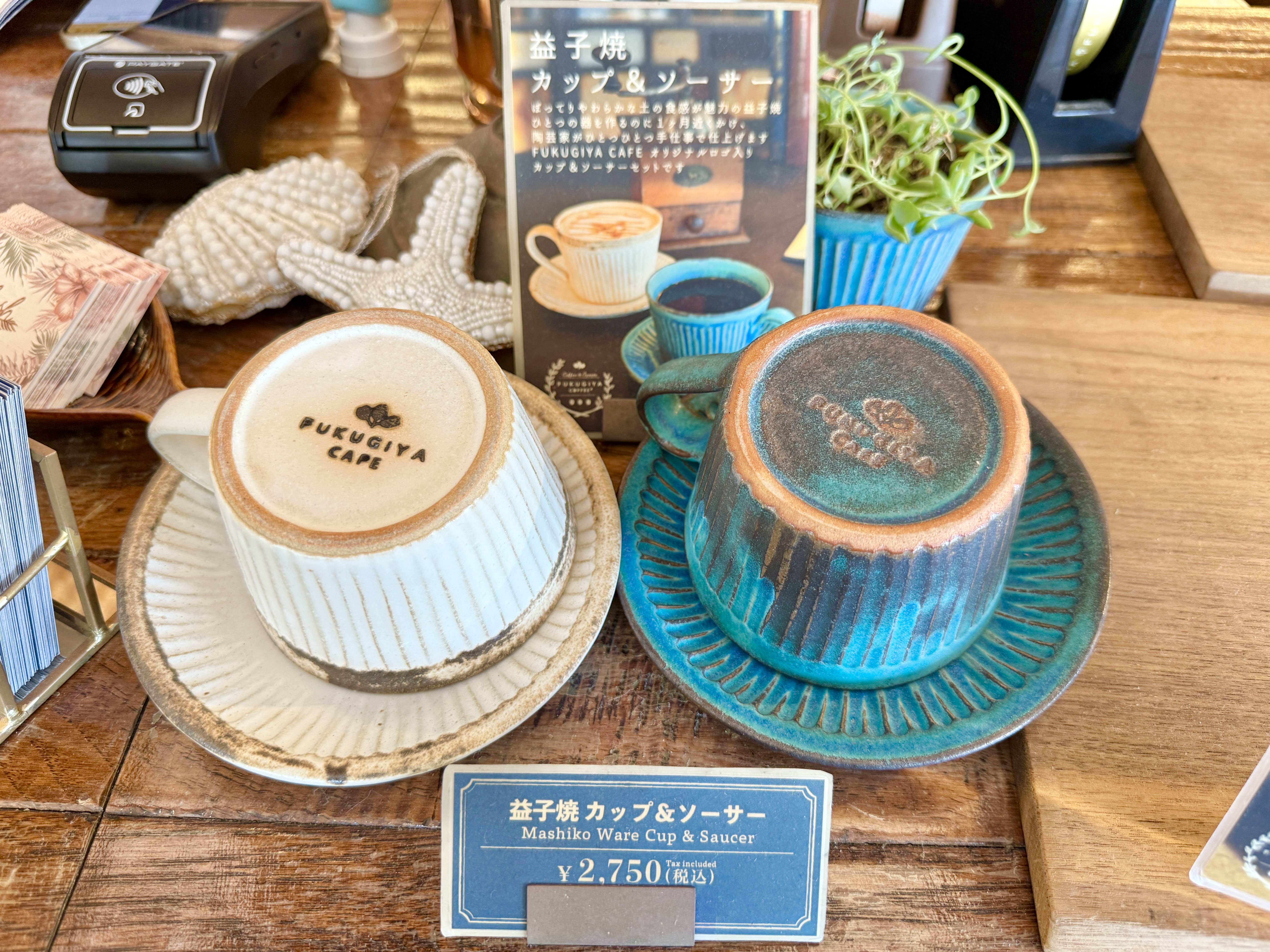 店内には、綺麗な色合いの益子焼カップ&ソーサーを販売しています。